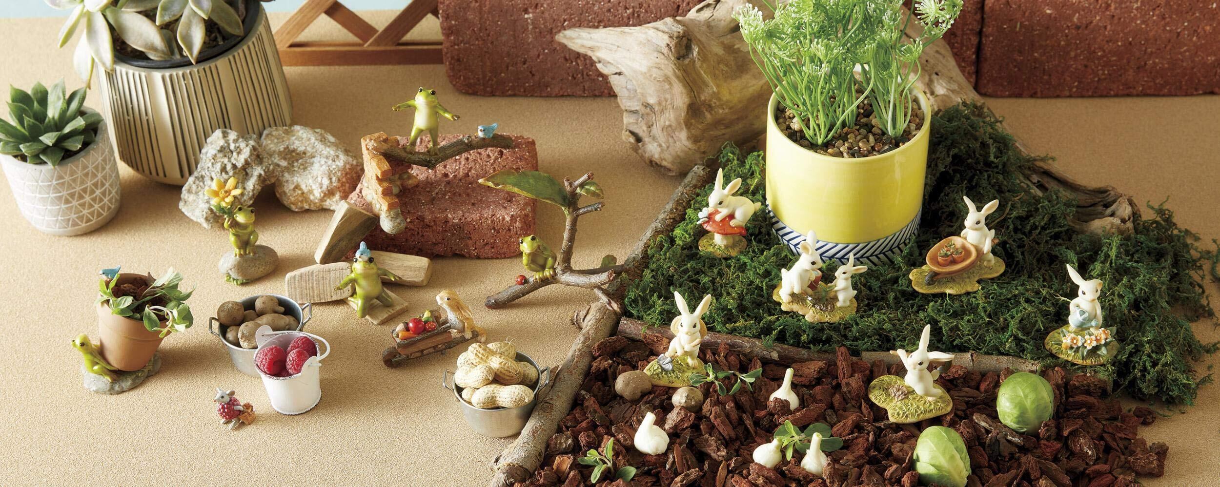 玄関の置物や、ガーデニングや観葉植物にちょこと置いたり、出窓や棚に飾ってインテリアとしても楽しめる。