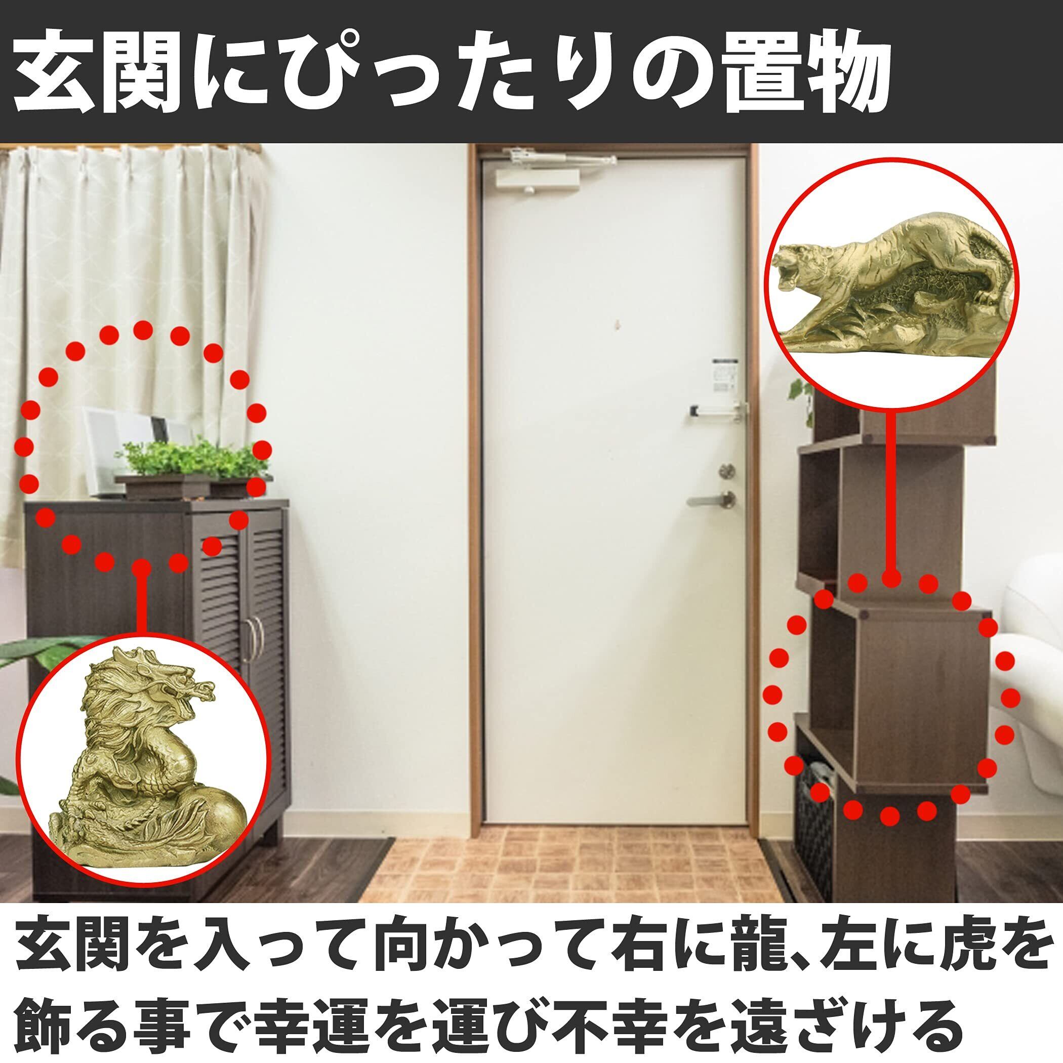 幸運を呼ぶ龍と虎の置物:風水で縁起物として尊ばれ、古来から屏風や掛け軸などにも描かれてきた龍と虎の置物をセットにしました。家の中に飾れば金運アップ、魔除けなどさまざまなご利益が期待できます。ゴールドの輝きも部屋の雰囲気を明るくしてくれるといえます。
