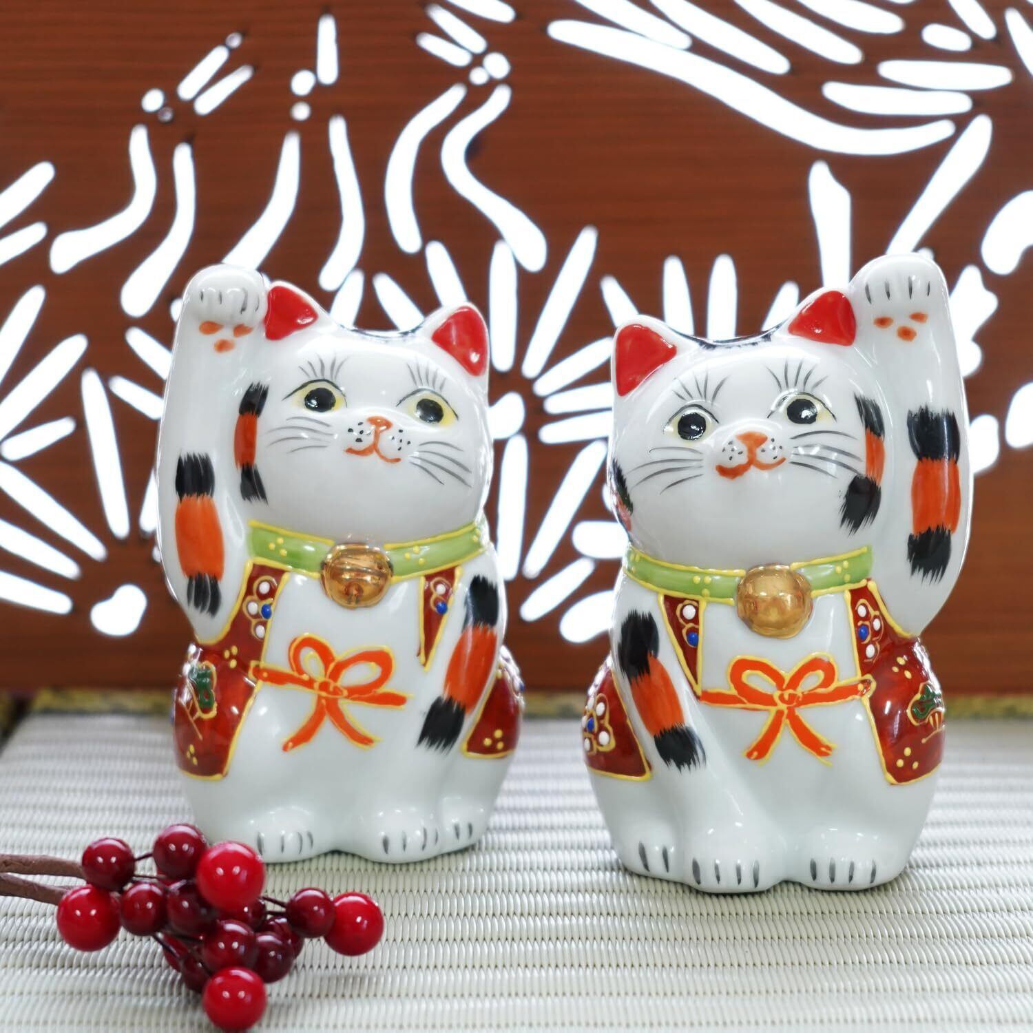 高品質な九谷焼製造: このペア招き猫は、日本の伝統工芸品である九谷焼で丁寧に作られています。美しい色彩と繊細な絵付けが施され、インテリアとしても魅力的です。