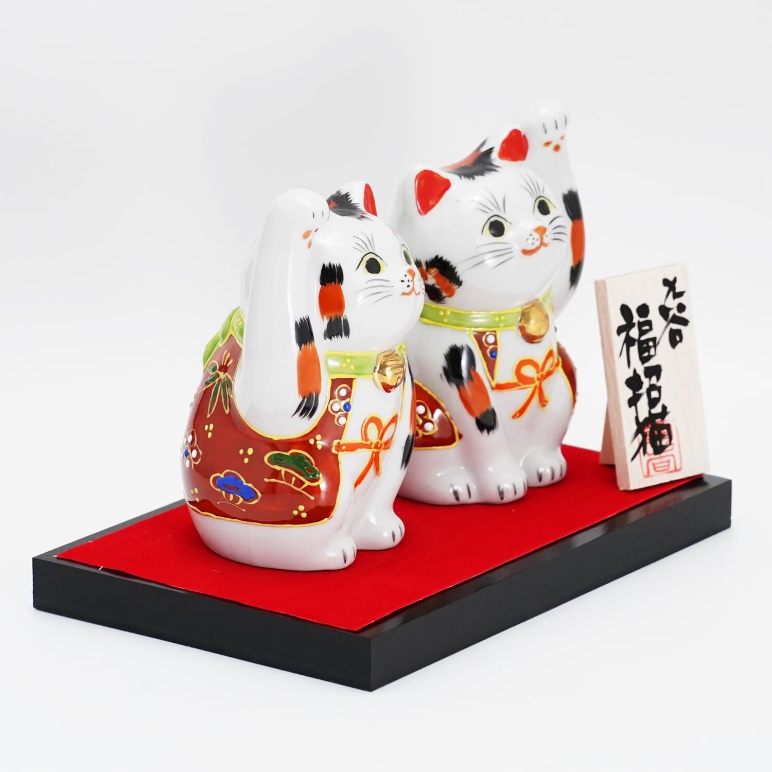ふくべ屋 九谷焼 ペア招き猫 台座・敷物・立札付 右手・左手猫セット 金運・人を招く 置物 インテリア 新築祝い 開業祝い ギフトにも最適 (高さ10.5cm 幅6.5cm)
