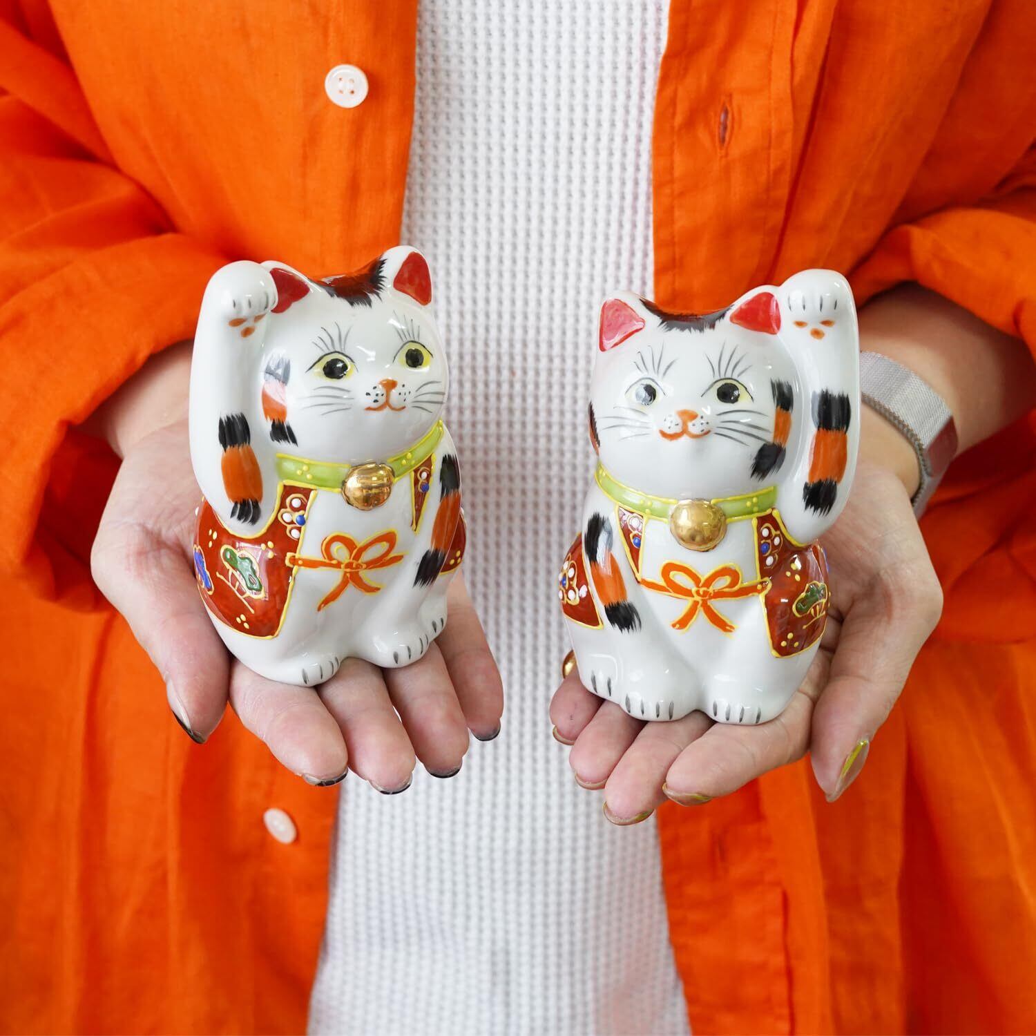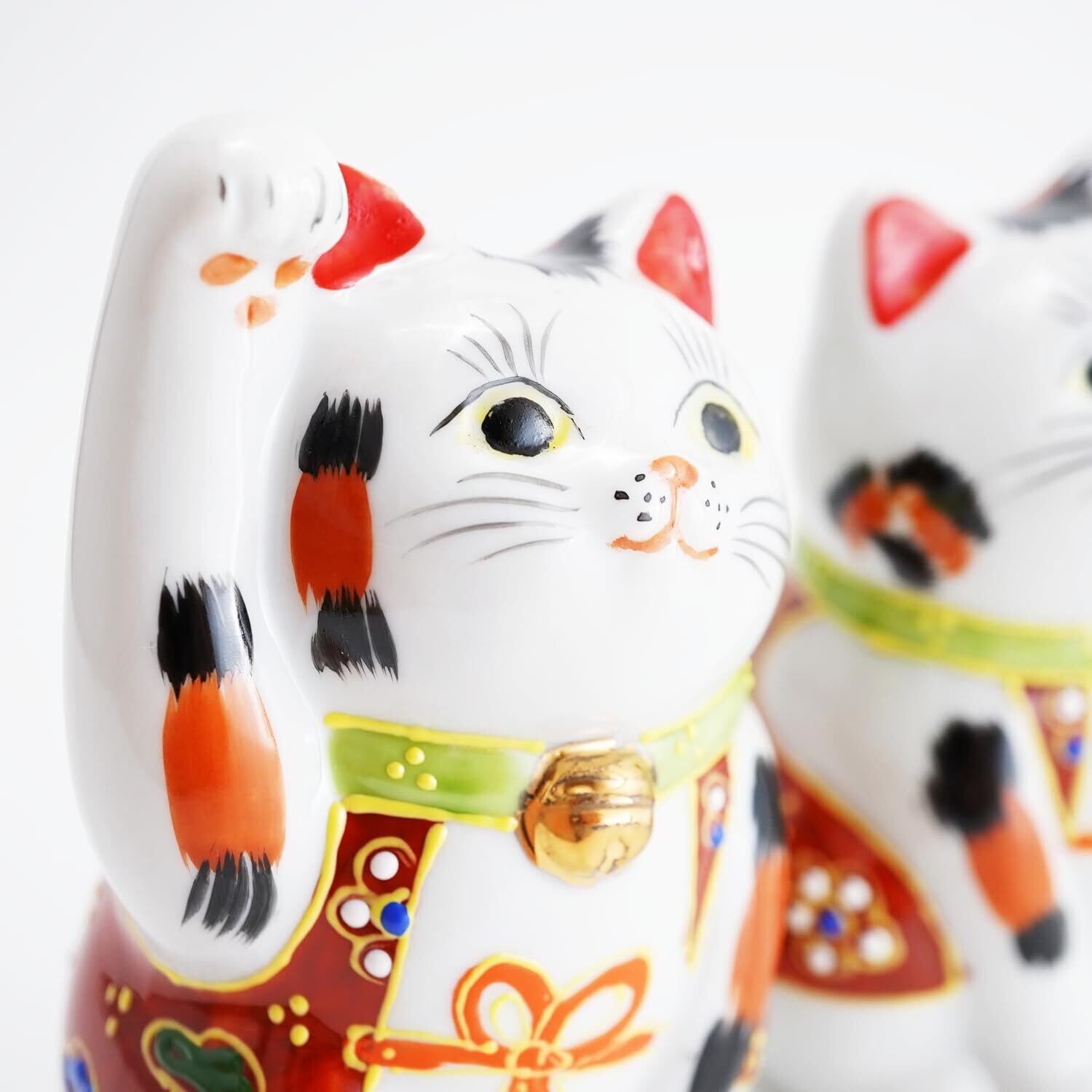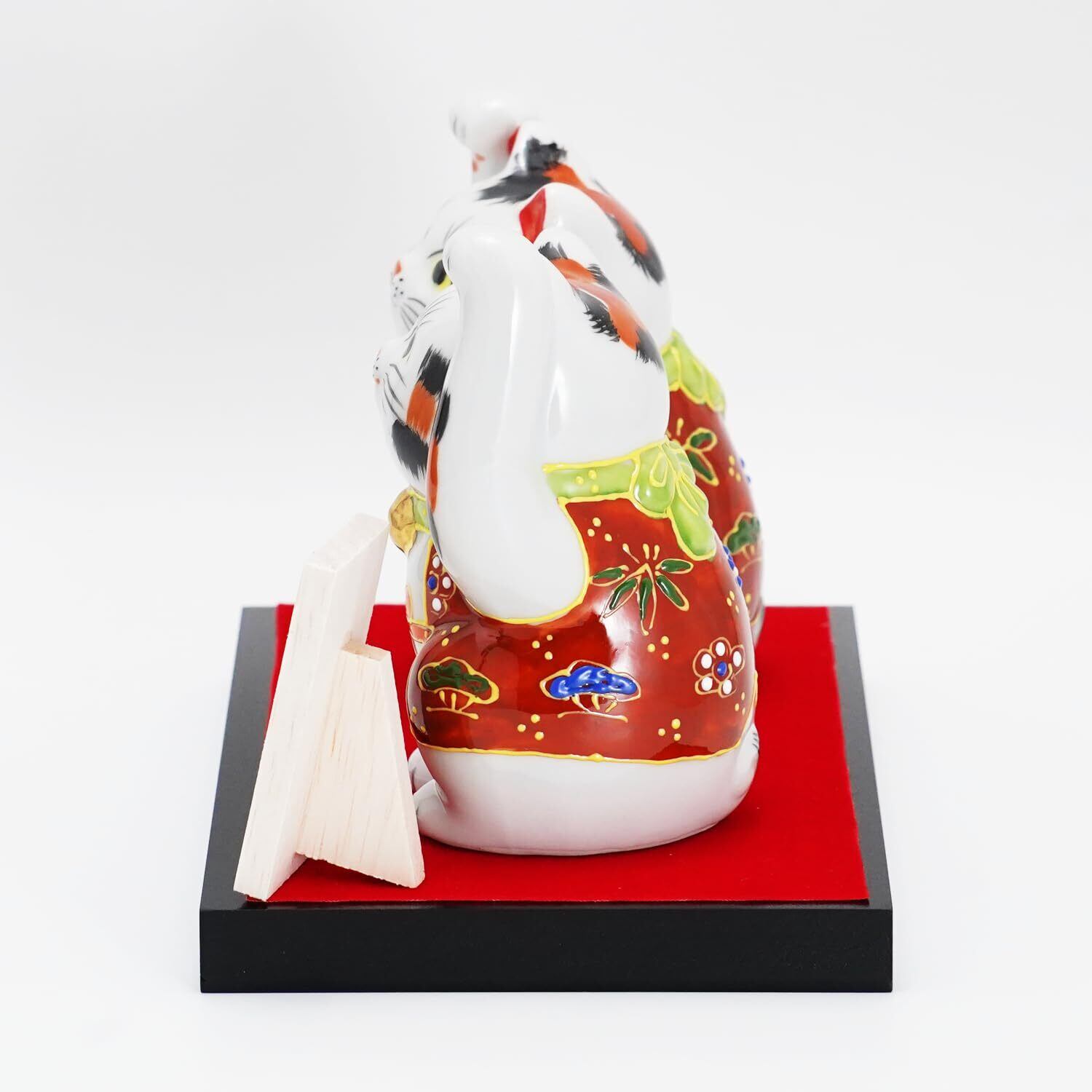 伝統的な装飾が特徴的: 華やかな赤色の衣装と九谷焼特有の色使いが、福を呼ぶとされる猫の表情をより一層引き立てます。