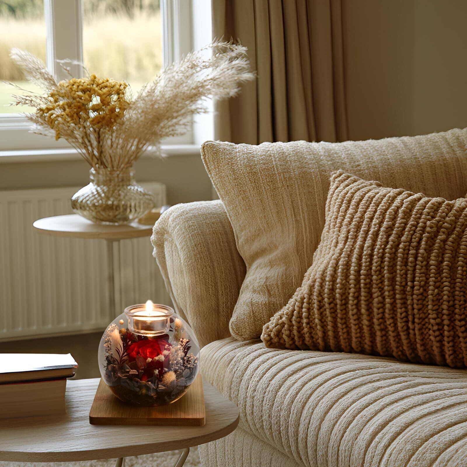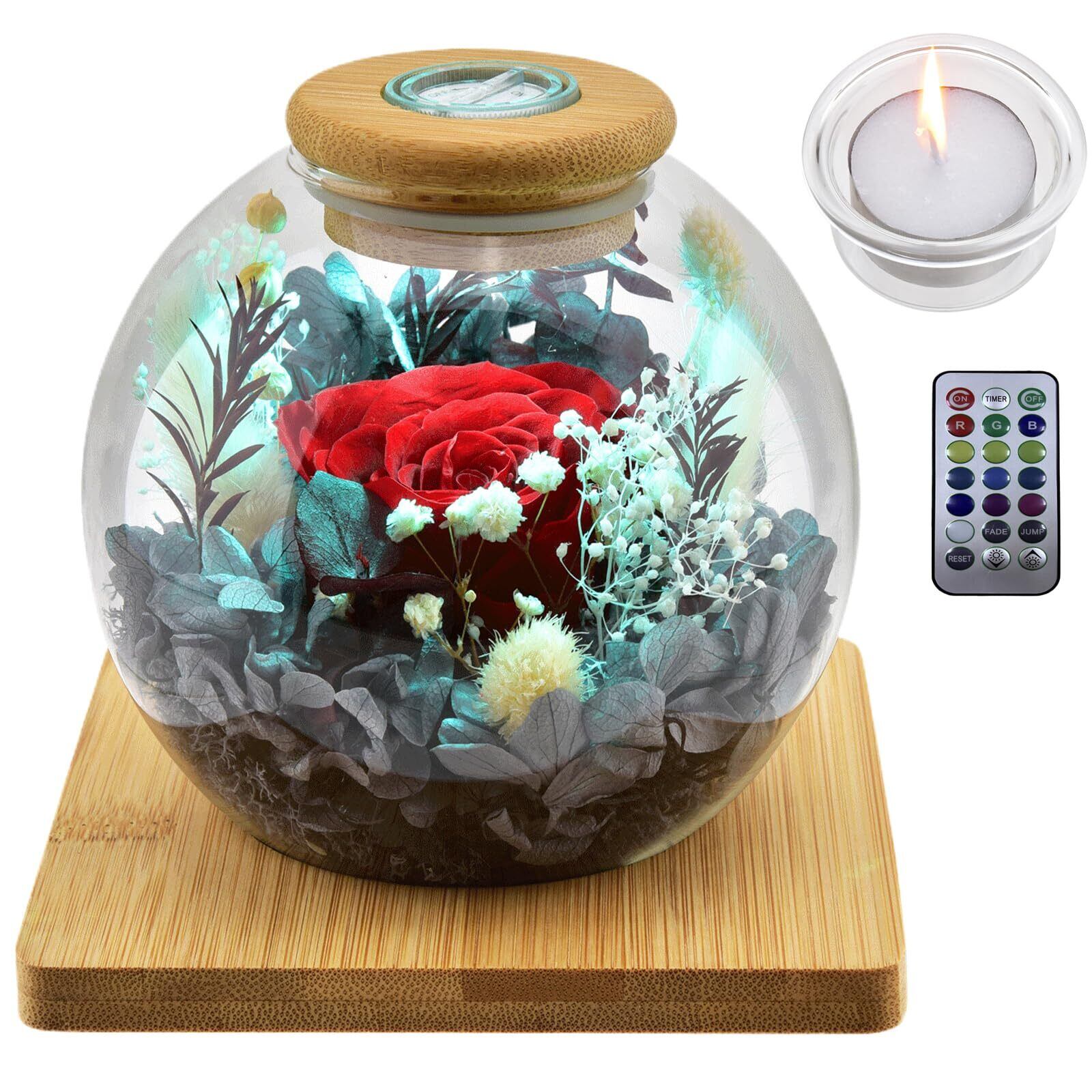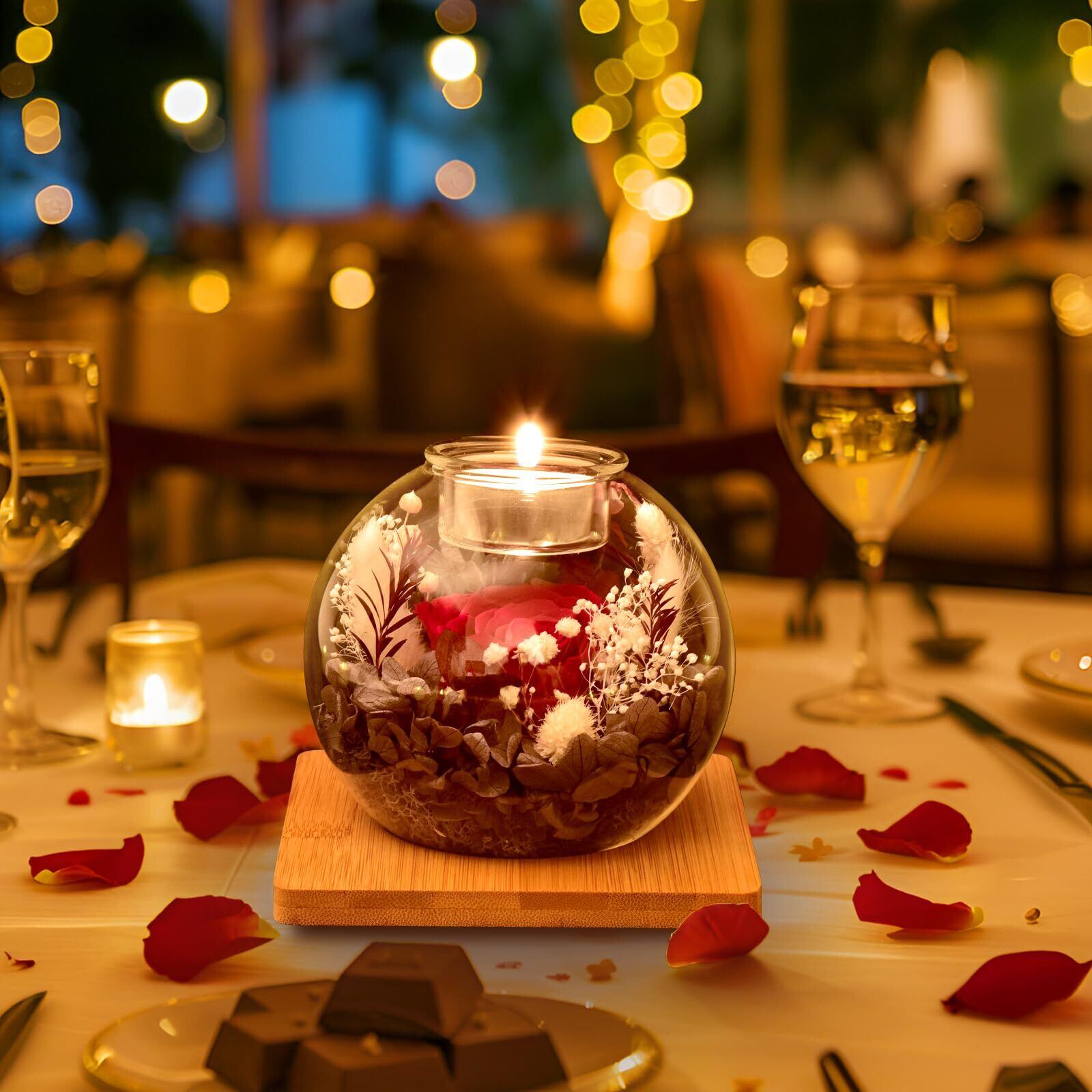 サイズと包装: 【サイズ】:直径12cm × 高さ12cm; 【花材】:最高品質のプリザーブドフラワー(品質保証付き); 【花瓶、キャンドルスタンド】:ガラス; 【対応キャンドルサイズ】:直径4cm以下のキャンドル; 【LEDキャップ】:天然木+LEDライト; 【竹製トレー】:13cm ×13cm; グリーティングカード*1; リモコン*1; (※キャンドルは付属しておりません。)