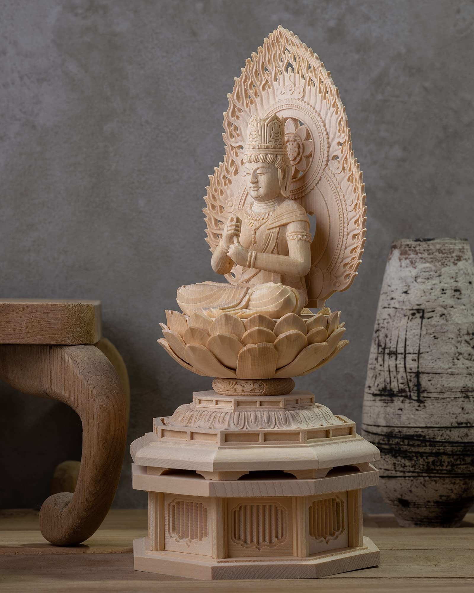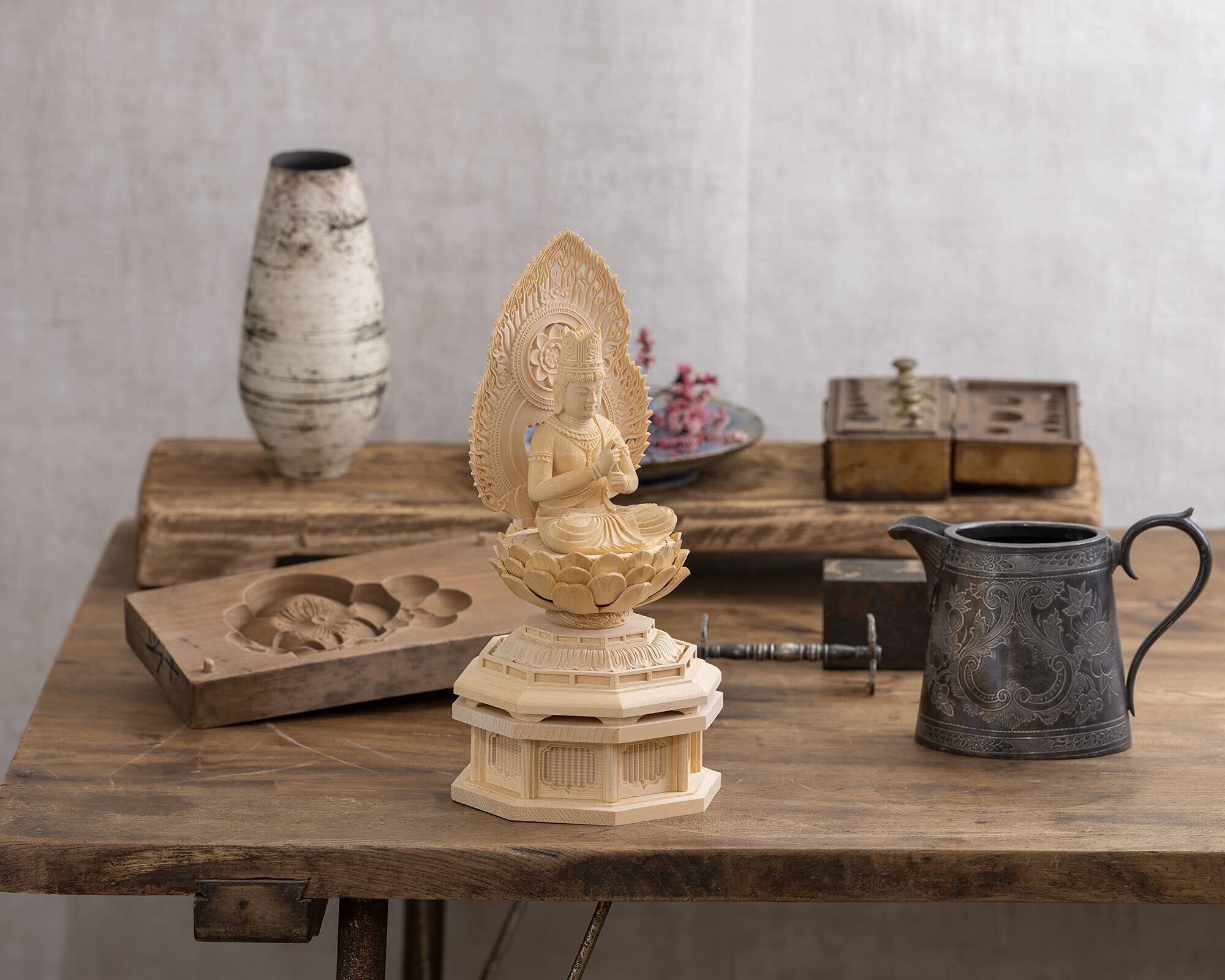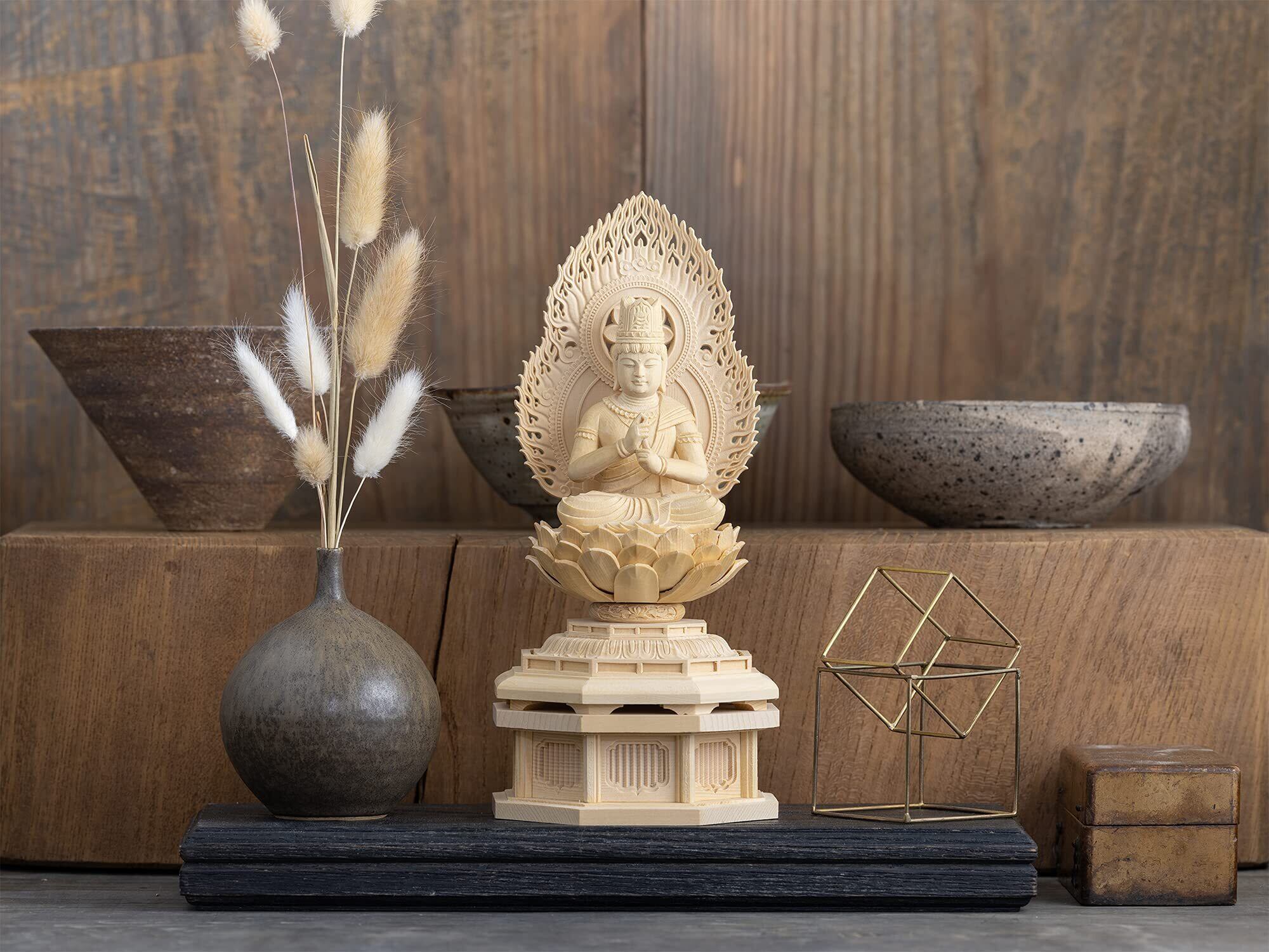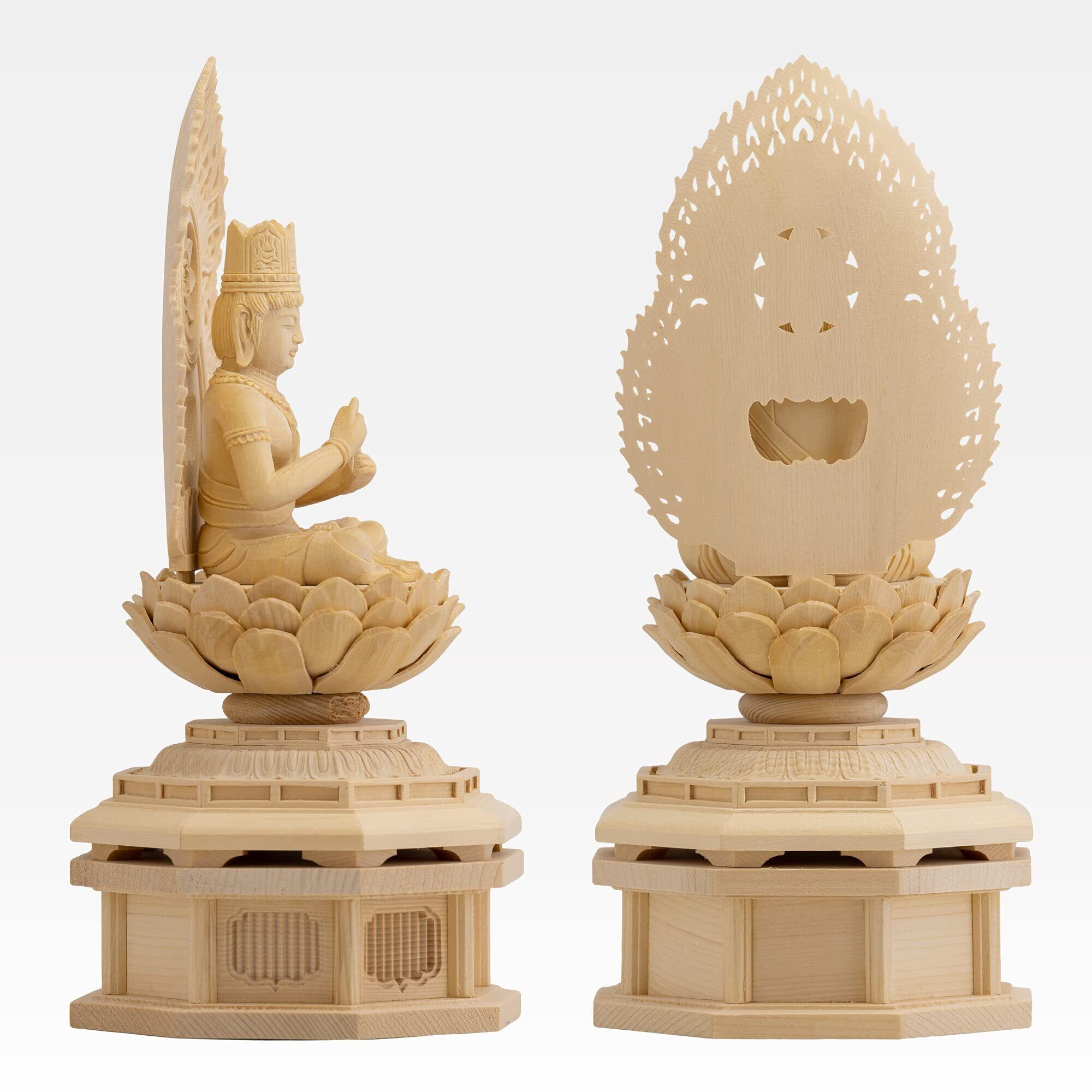 材質:木製(桧木) 製造/中国製 ◆製品内容:本体 化粧箱入 ◇本体は各パーツの組み上げ式となり着脱可能(尊体・光背・台座上段・台座下段)にわかれます。