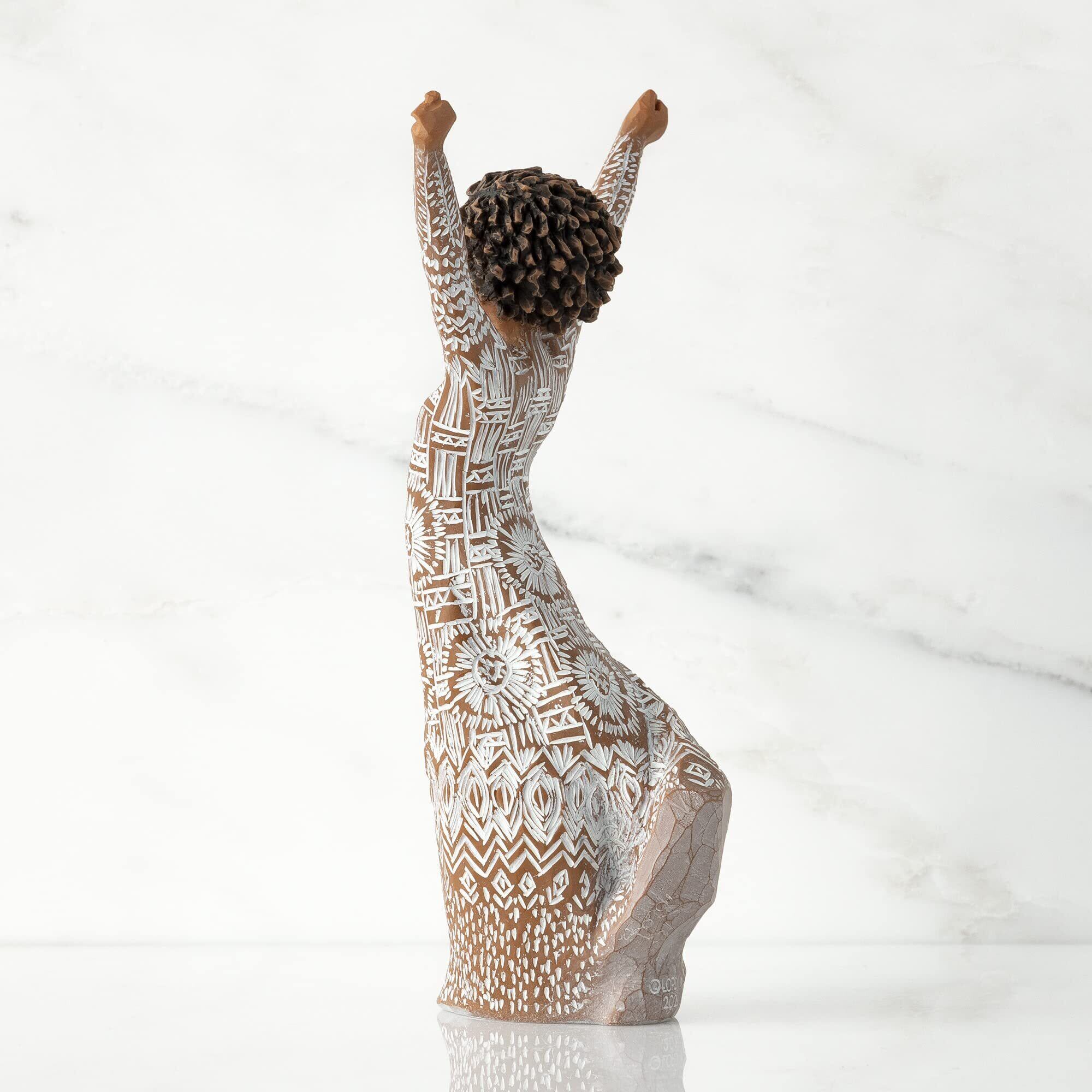 高さ7インチ 手描き樹脂フィギュア、より暗い肌と自然な黒髪スタイル、両腕が頭の上に浮かび上がり、全体がテキスタイルパターンでエッチングされています。