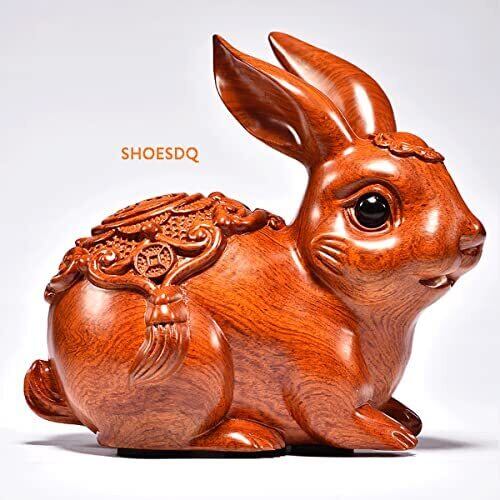 かわいい 干支 うさぎ 新年 木像 木製フィギュア 黄花梨 花梨木 高級天然カリン材 置物 オブジェ 動物 マスコット インテリア 装飾 (12cm, 雄)