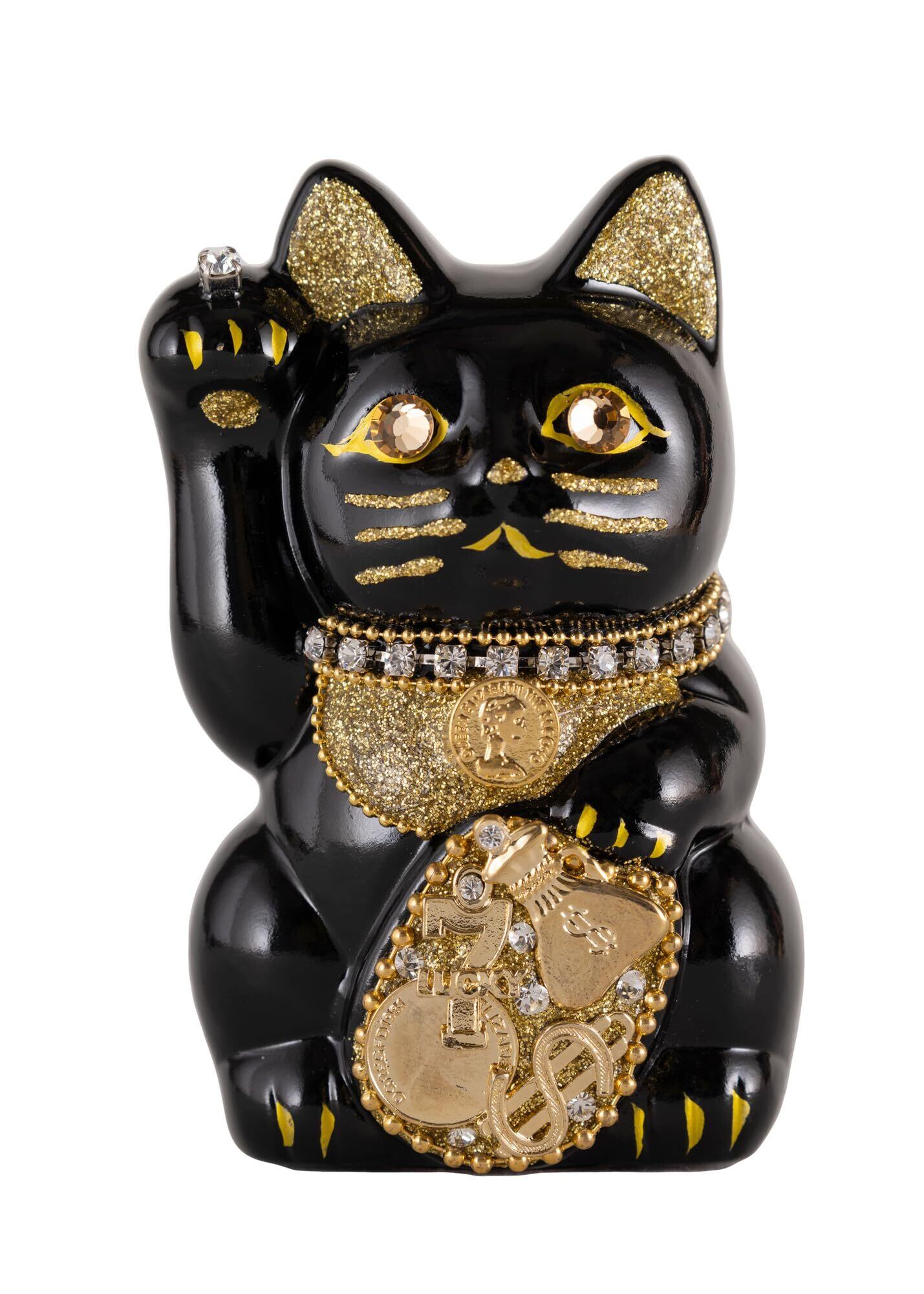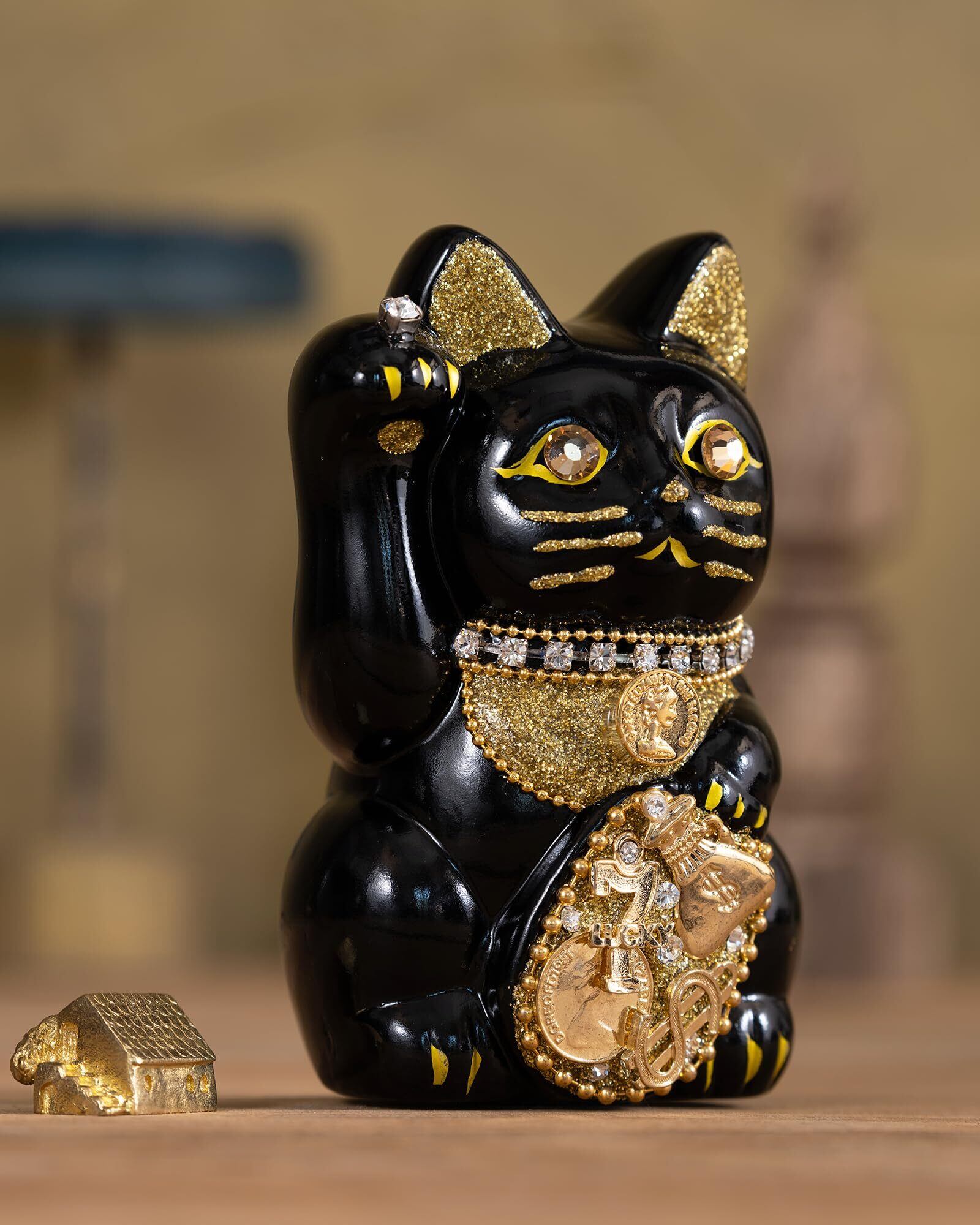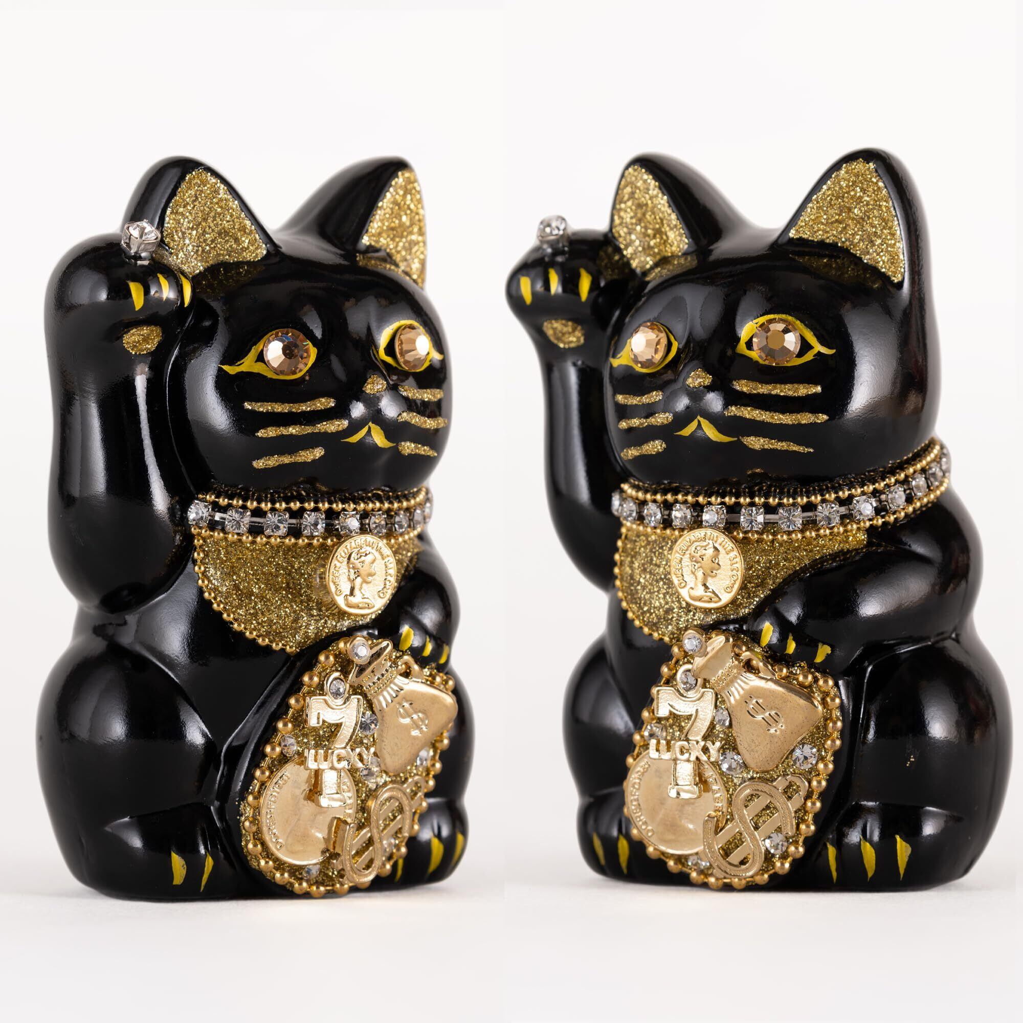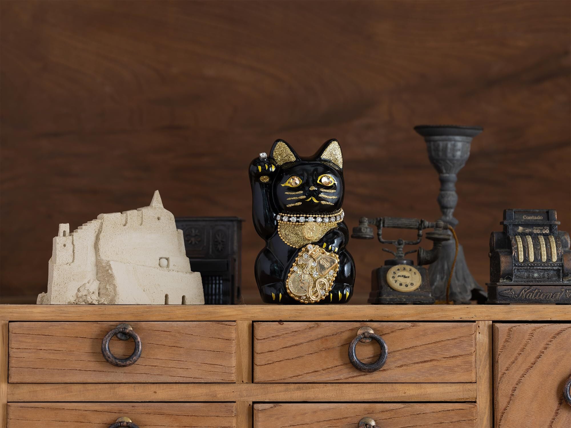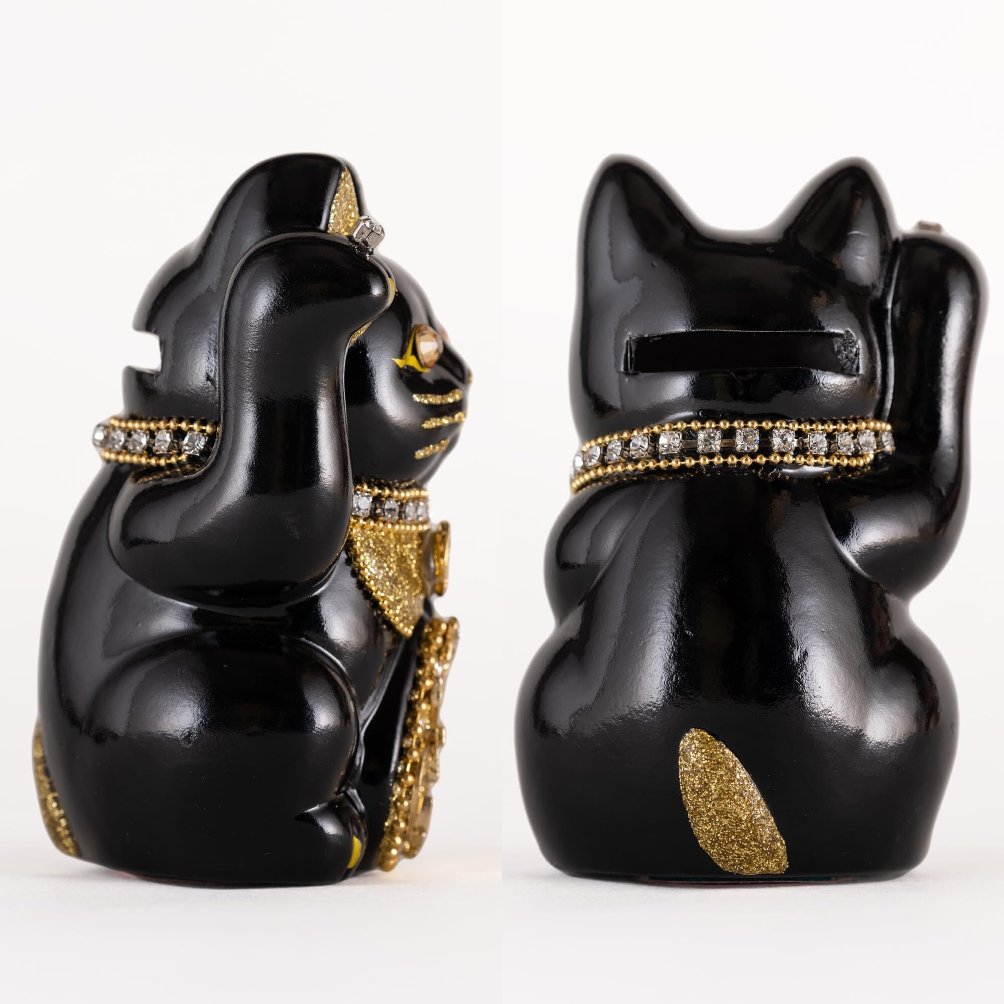 ご縁猫 ミリオネアキャット(S-SIZE 黒 Black)右手あげ/陶器_lucky cat 招き猫 まねき猫 縁起 風水 置物 賽銭箱(ml_S黒
