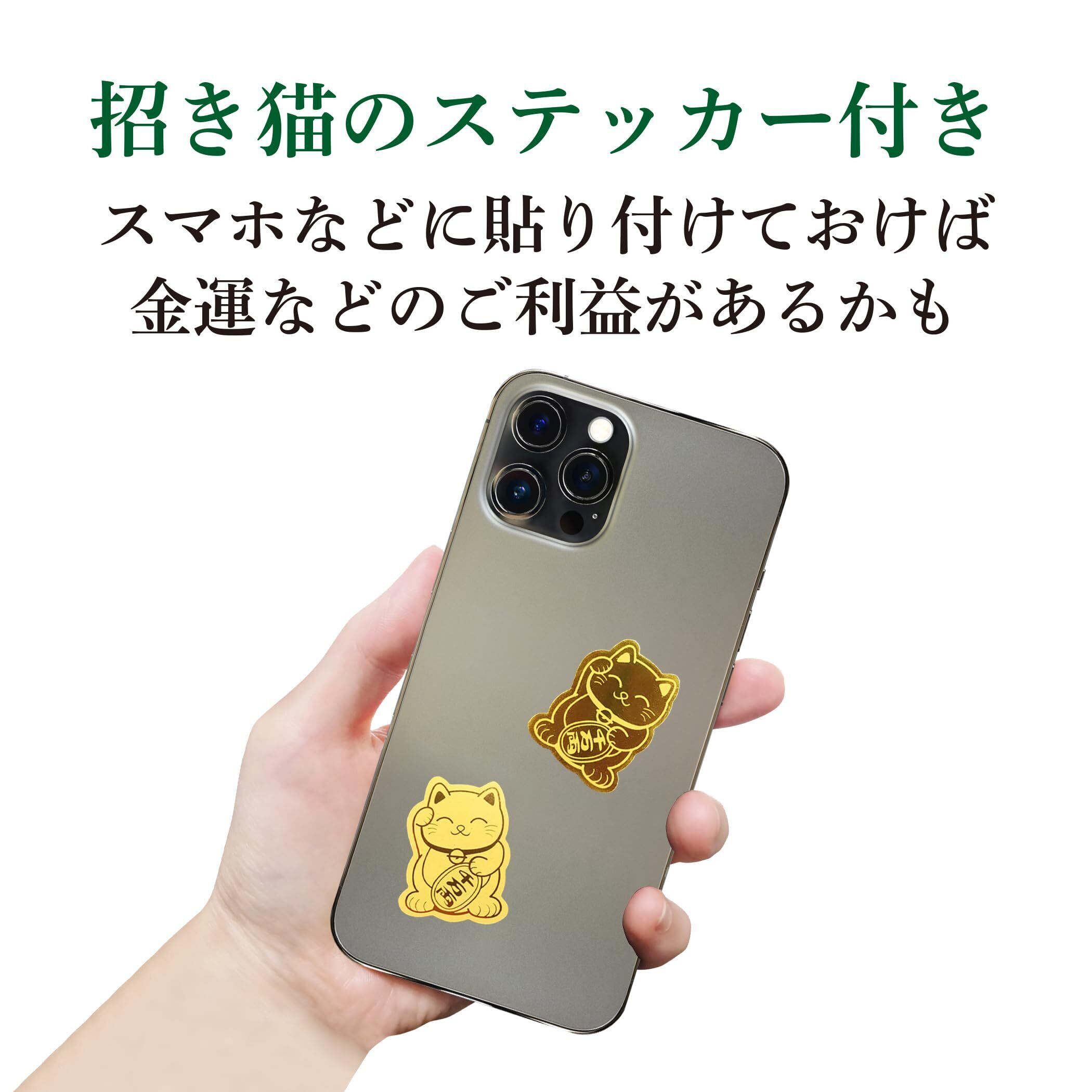 招き猫の金属製ステッカー2枚付属:本製品には、2種類の金属製ステッカーが1枚ずつ付属しています。運気アップのご利益が期待できる招き猫の金属製ステッカーをスマホなどに貼り付けておけば、金運などのご利益などを授かれるかもしれません。