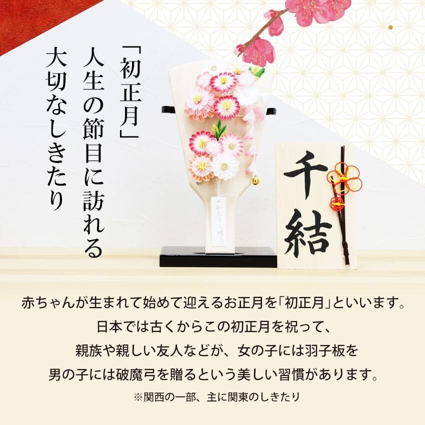 【初正月とは】赤ちゃんが生まれて初めて迎えるお正月を「初正月」といいます。わが国では古くからこの初正月を祝って、赤ちゃんの祖父母や、おじやおば、仲人、親しい友人などが、女の子には羽子板を、男の子には破魔弓を贈るという美しい習慣があります。【 羽子板の意味】お正月の羽根つきは、江戸の昔から女の子の遊びです。そして羽子板は、女の赤ちゃんの無病息災のお守りの意味も持っています。羽子板でつく羽の玉、あの黒くて堅い玉は“むくろじ”という大木の種ですが、これは漢字で「無患子」と書きます。「子供が患わない」という意味が込められています。【飾る時期】羽子板や破魔弓は、12月の中旬以降に飾り付けたらよいでしょう。お正月には贈って頂いた方々を招いてご家庭でおもてなしするのもよい方法です。しまうのは、1月15日頃がよいでしょう。それはちょうどこの頃、お正月飾りを焼く左義長(さぎちょう・どんど焼きのこと)の行事が行われるからです。江戸時代には、宮中の左義長風景を描いた極彩色の左義長羽子板というものがありました。これは、このお正月行事と羽子板との密接な関係を物語っているものといえるでしょう。