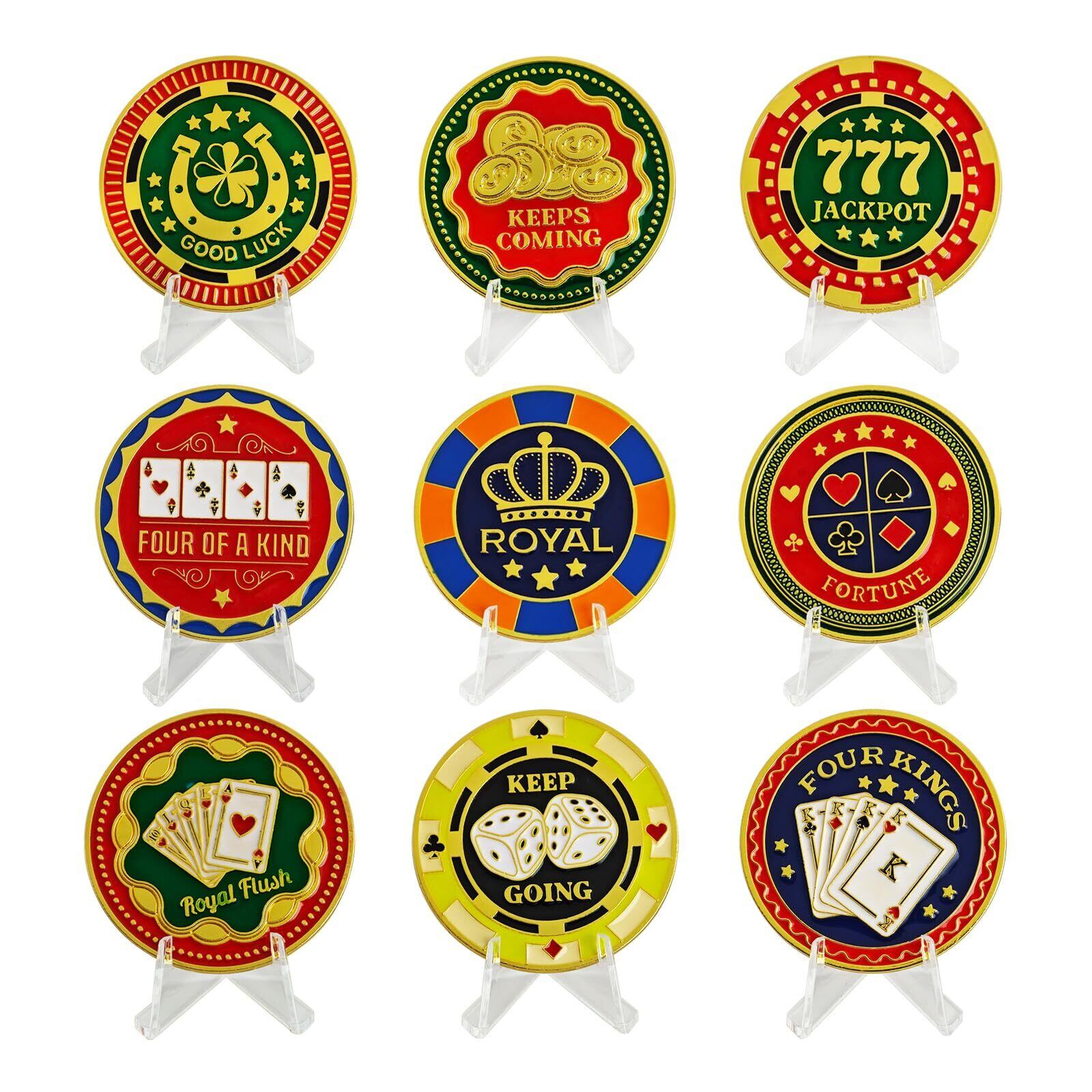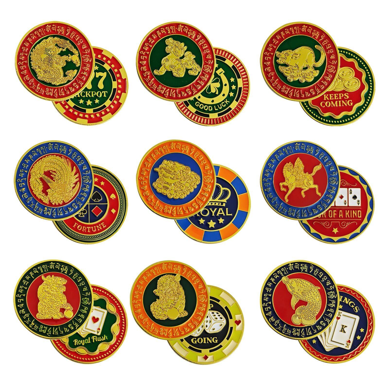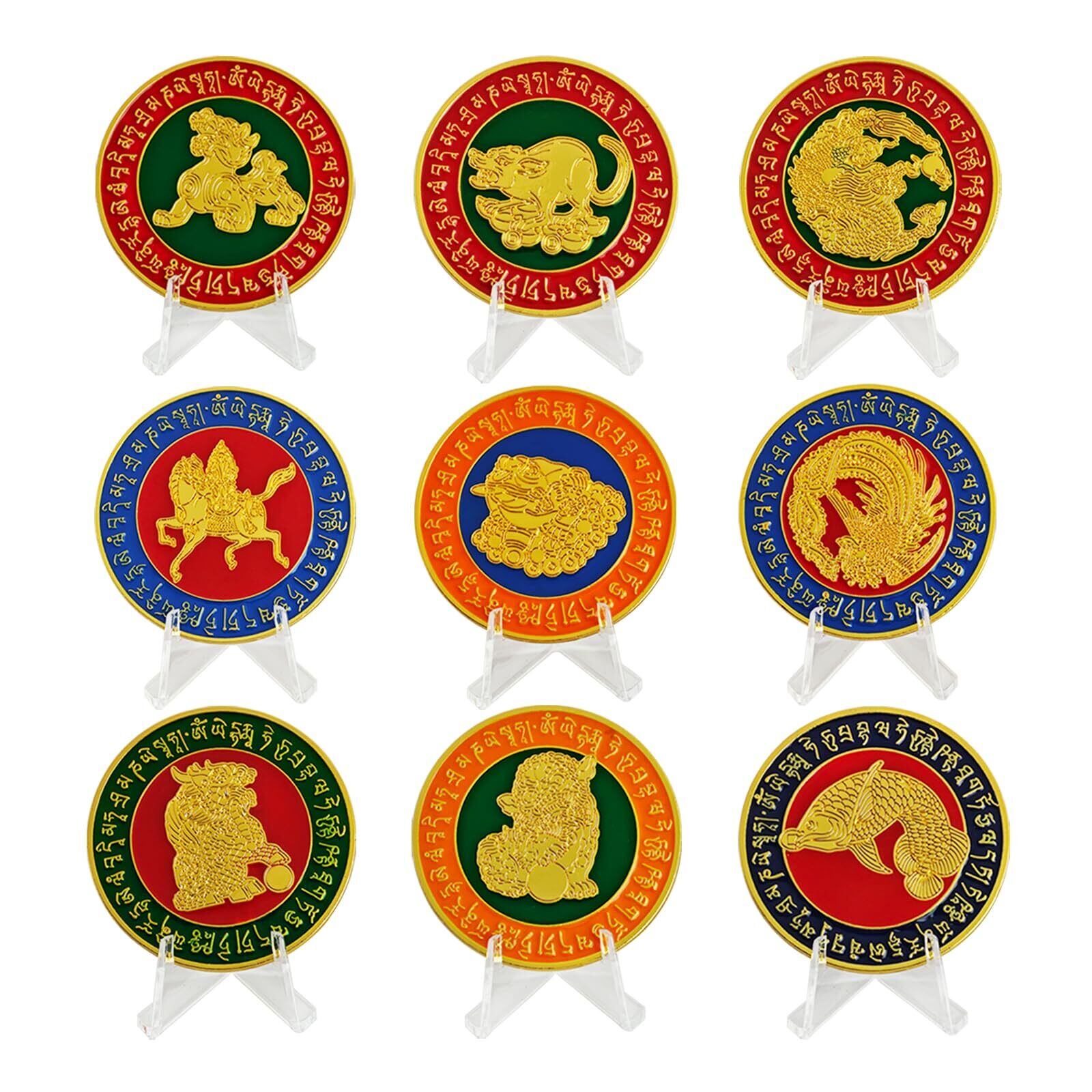 これらのコインは9枚セットで、それぞれにユニークな幸運のシンボルと強力な願いの呪文が描かれています。 ランライクネスのトリビュートホース、ウェルスパターンのゴッド・オブ・フォーチュン、そして四天王パターンのドラゴンカープです