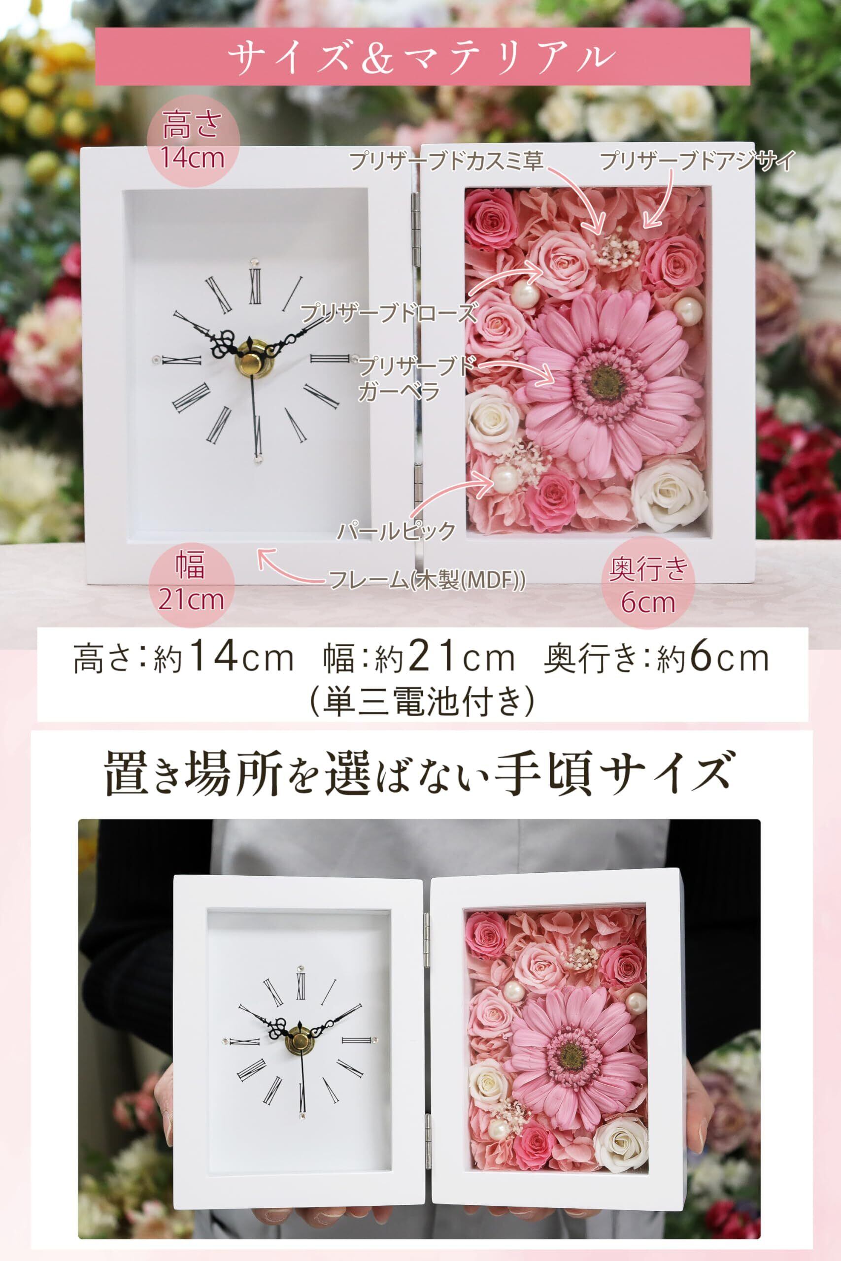 【穏やかな時を楽しむ】華やかにアレンジされたプリザーブドフラワーのガーベラとローズ。幸せで穏やかな時間を刻む時計と共に、長時間、お楽しみいただけます。ウエディングや記念日、お祝い事の贈り物にも目をひく一品です。<高さ:14㎝、幅:21㎝、奥行き:6㎝>