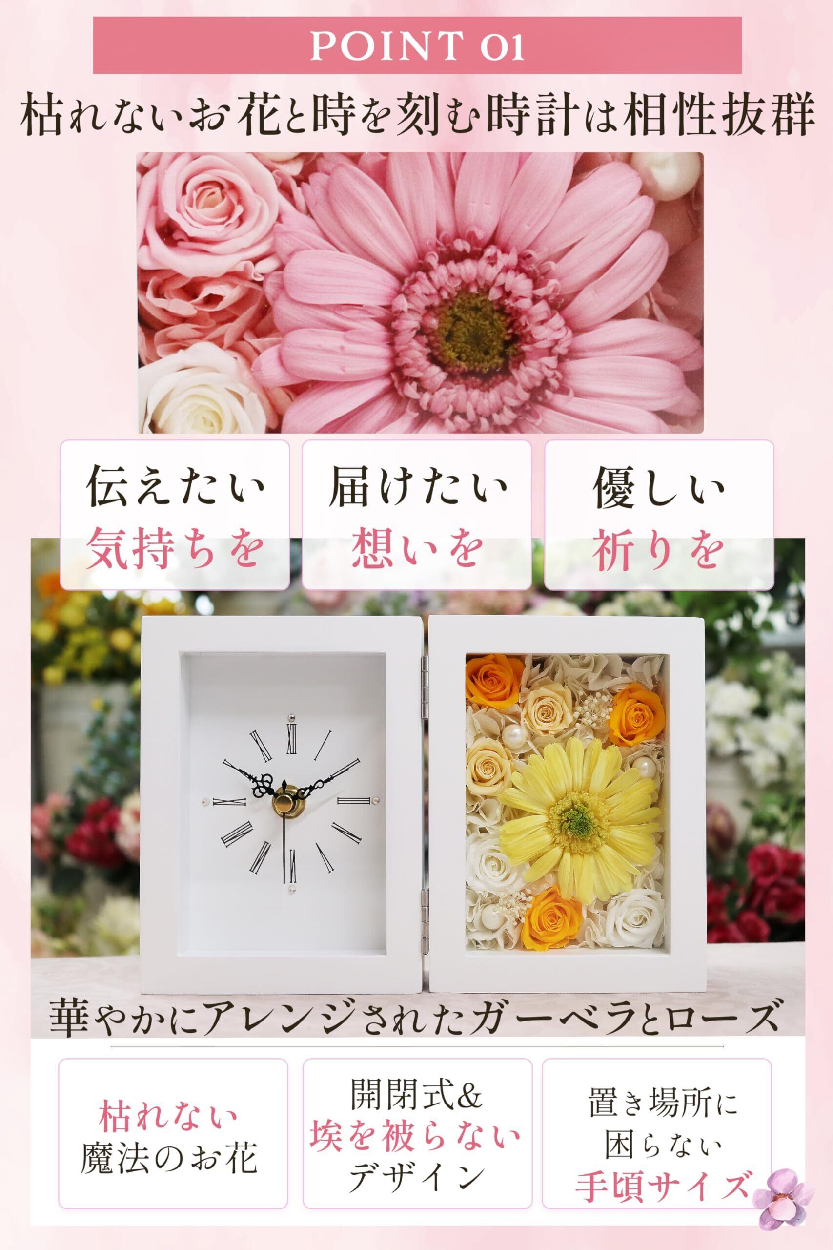 IPFA プリザーブドフラワー フレームの 置き時計 (イエロー) ガーベラ バラ 時計 (誕生日/結婚祝い/退職祝い/還暦) プレゼント 花 お祝い