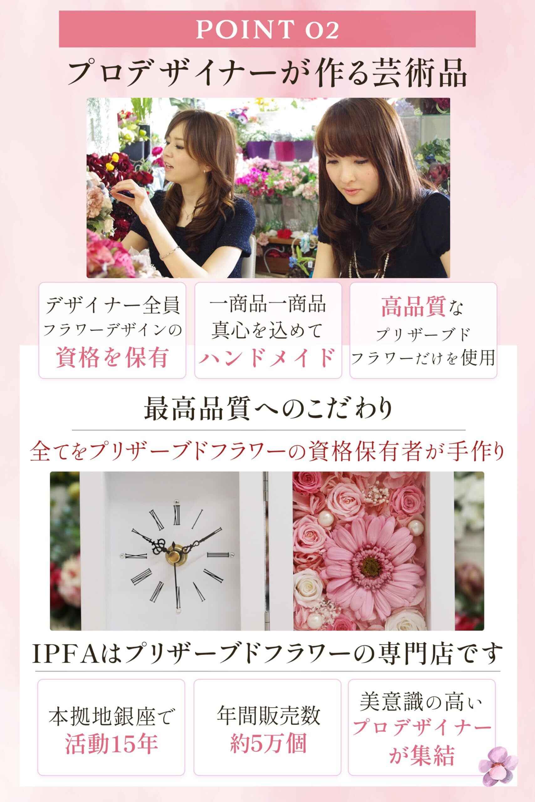 【プロデザイナーが作る芸術品】プリザーブドフラワーの資格を保有する女性デザイナーが、1つ1つ真心を込め丁寧に手作りしています。本拠地・銀座で15年活動し、数々の高級百貨店での販売経験もある高品質なブランドです。