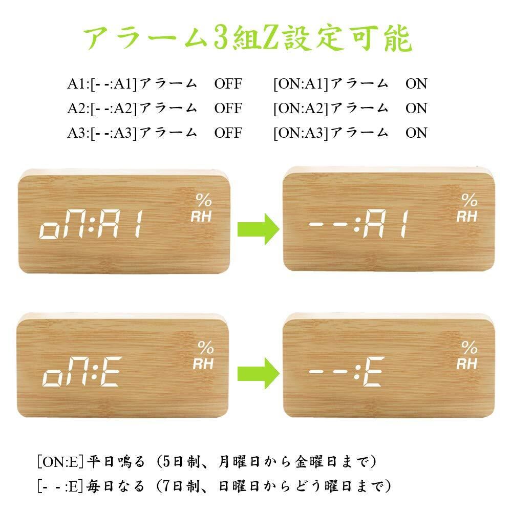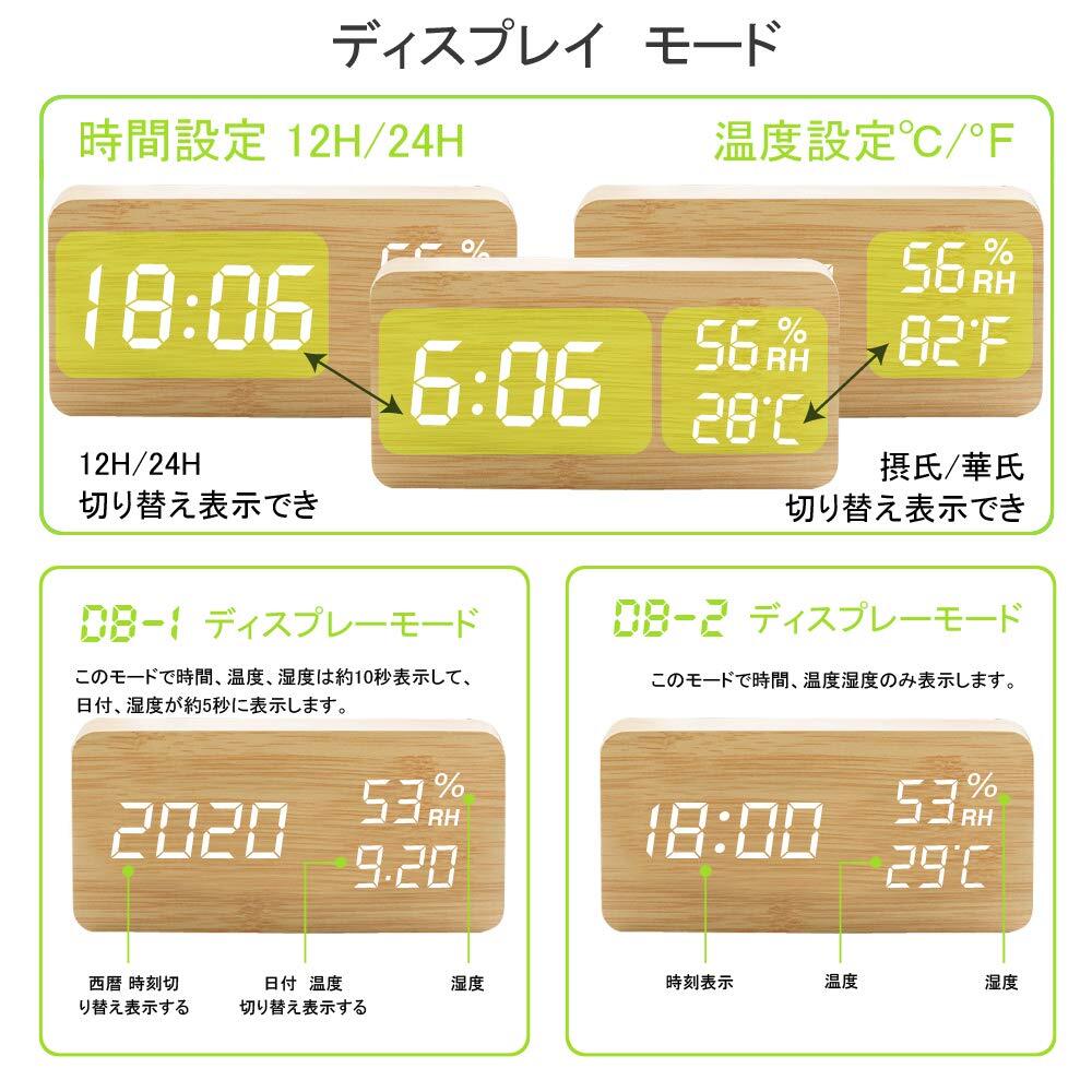 【多機能目覚まし時計】①音感センサー:60db以上の音に反応して点灯、静かになると約10秒後に消灯。②アラーム:アラームが三つまで設定可能。③3段階輝度調節:お好みで明るさ調節、省エネと共に目に優しい。④ダブルディスプレイ:12/24時間表示、時刻/カレンダー/温度表示/摂氏表示と華氏表示切替。湿度(±3%RH) 温度(±1℃)⑤設定記憶:電源が絶たれても、記憶機能で再設定不要。⑥二種の給電方法:USB給電と乾電池