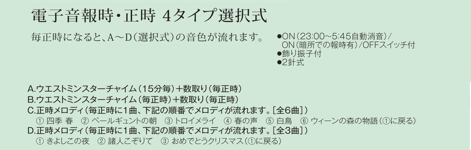 ●A:ウエストミンスター・チャイム(15分毎)+数取り(毎正時)、B:ウエストミンスター・チャイム(毎正時)+数取り、C:毎正時メロディ(全6曲内蔵 1:四季 春、2:ペールギュントの朝、3:トロイメライ、4:春の声、5:白鳥、6:ウィーンの森の物語 が順番に1曲流れる。)D:毎正時メロディ(全3曲内蔵 1:きよしこの夜、2:諸人こぞりて、3:おめでとうクリスマス が順番に1曲流れる)