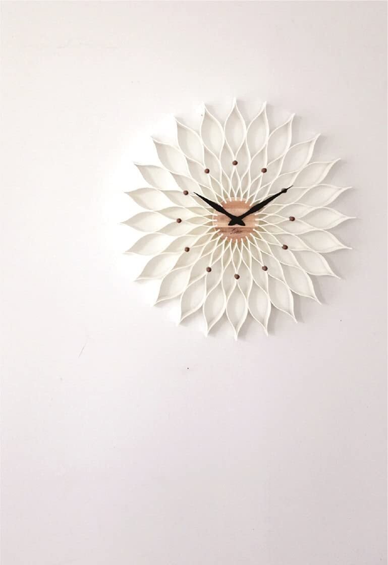 【商品の概要】 満開のダリアを思わせる、流れるラインが美しいたたずまいの壁掛け時計です。カラーは清純なホワイトと木目のような塗装を施したしたナチュラルの2色からお選び頂けます。奥行き5㎝の厚みのあるボディが壁に落とすシルエットが独特の立体感を生み、壁に飾った時の存在感は格別です。見る角度によって趣きが変わるオブジェのような側面も魅力的です。ホワイトカラーは中央に、ナチュラルカラーは文字盤に木目調のデザインを取り入れることで温かみのある仕上がりになっています。空間をエレガントな雰囲気に演出しますが、ナチュラル系のコーディネイトにも合わせやすい不思議な魅力があります。