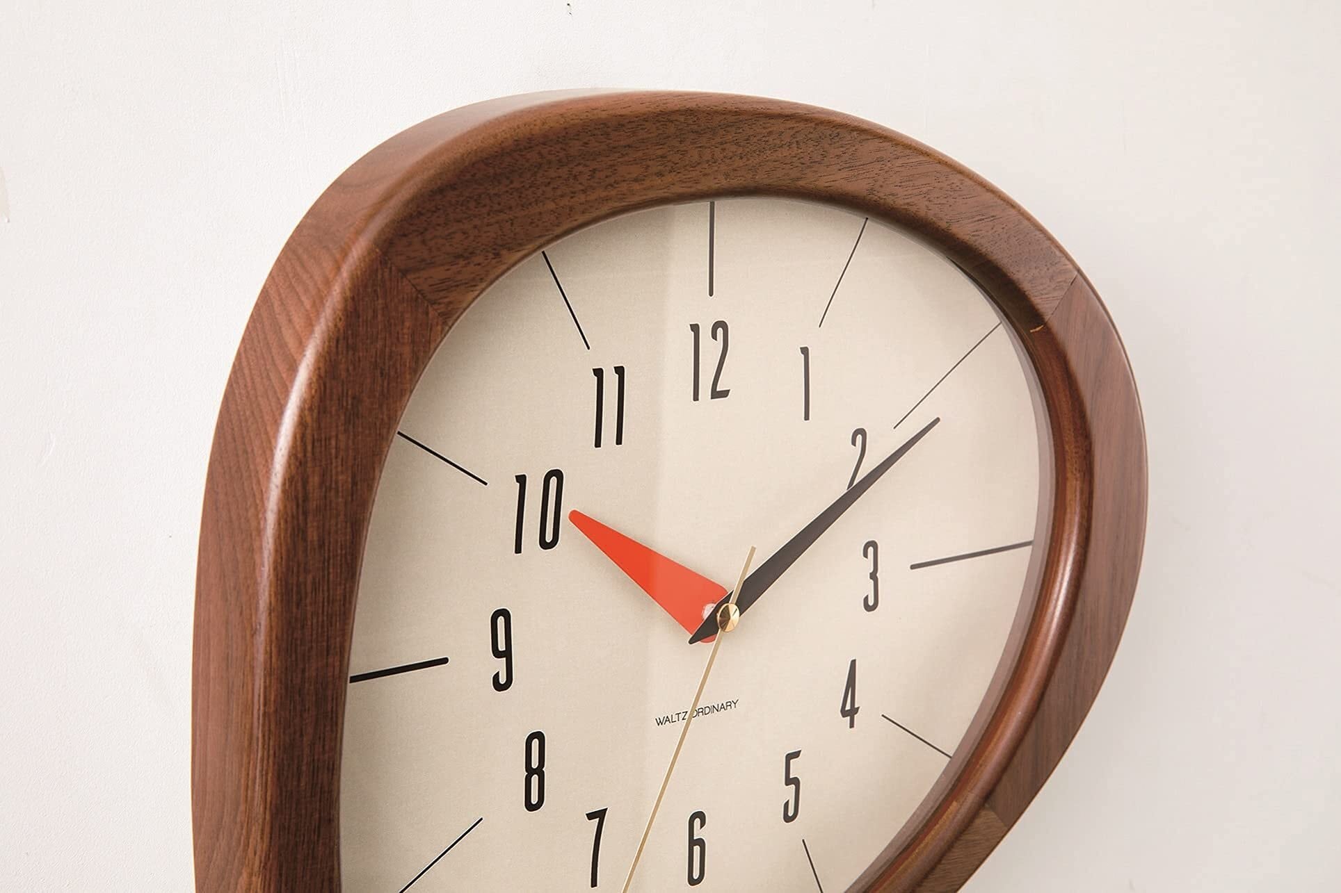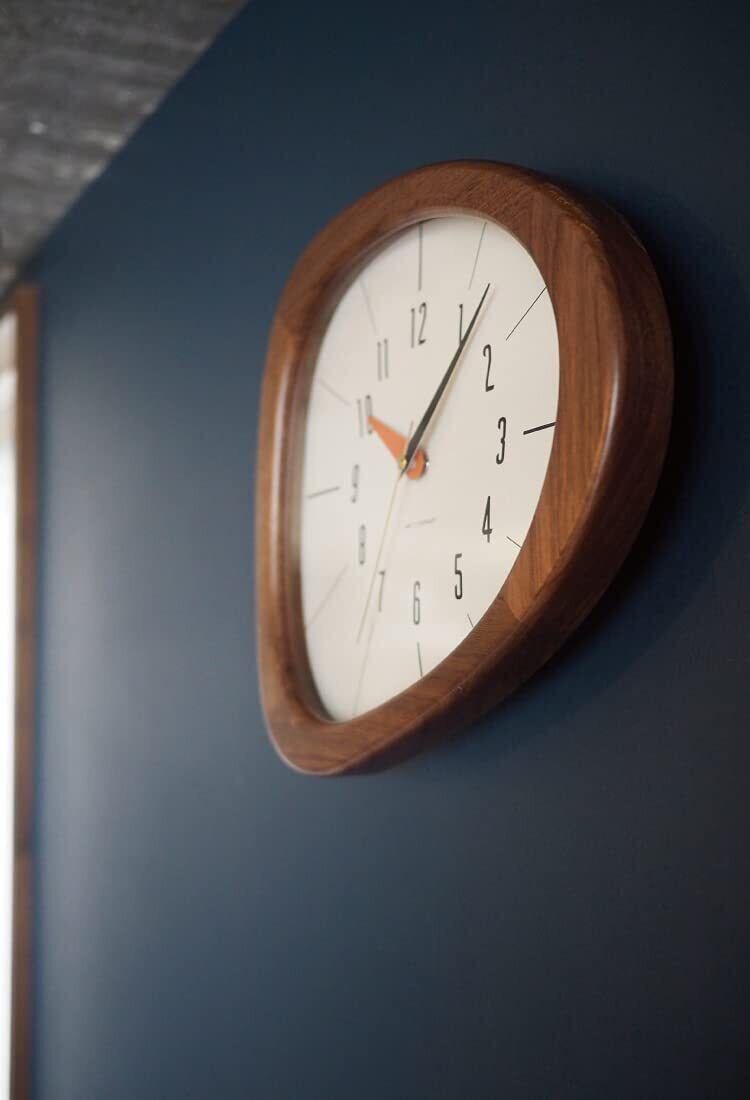 【使用シーン】 柔らかなカーブを描く独特のフォルムは存在感がありながらも落ち着いた佇まいで、ナチュラルなインテリアから北欧テイストのお部屋など幅広い空間に馴染みます。運針音の静かなスイープムーブメントを採用していますので、お子さまの勉強部屋などの静かな場所でもご使用いただけます。