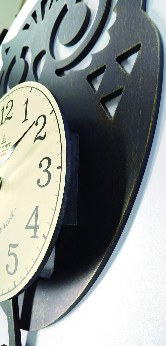 ゆらゆらと揺れるしっぽがかわいい、ふくろうの振り子時計です。ひと工夫あるシャビーな塗装仕上げです。福を呼ぶ演技の良いフクロウモチーフ。