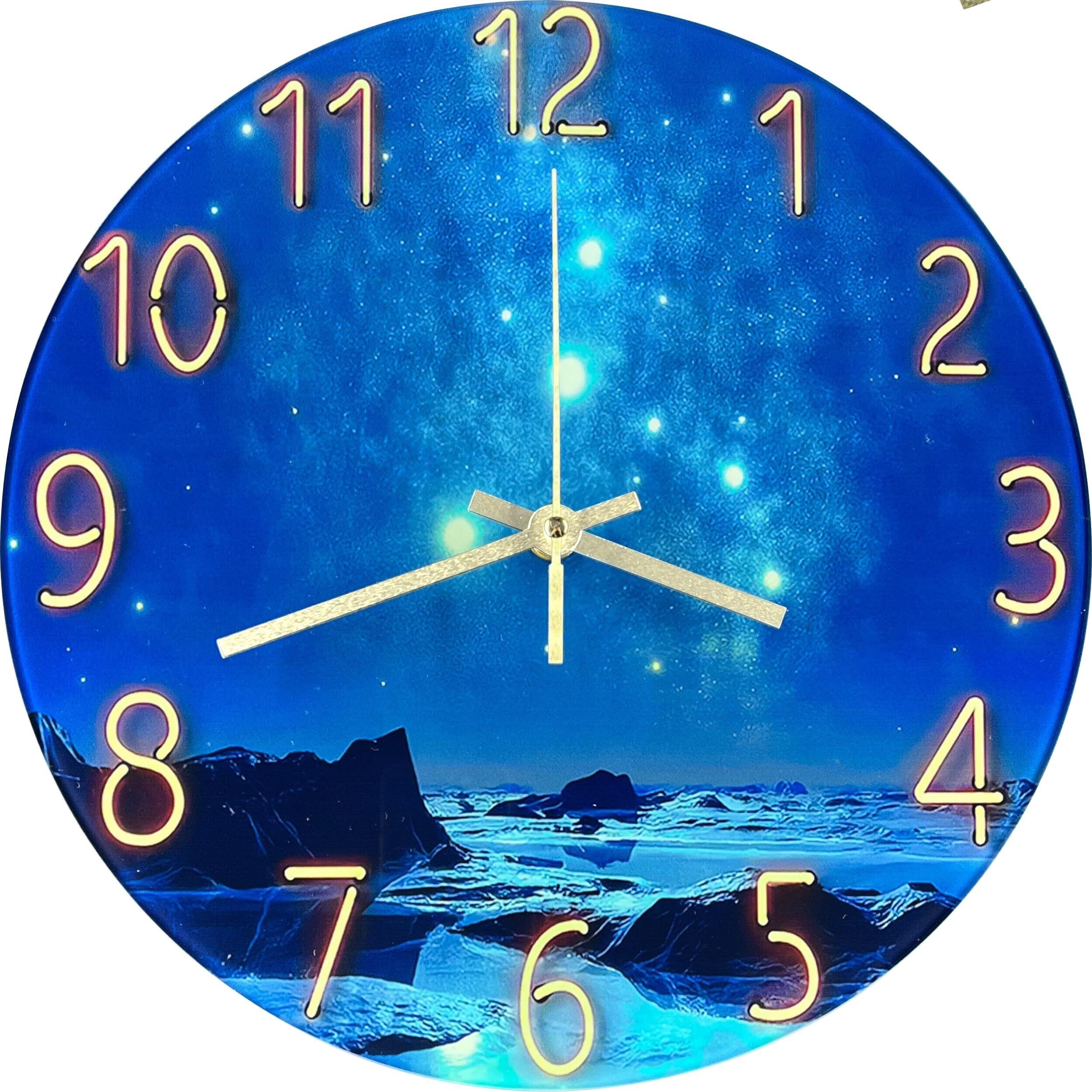 製品概要 :透明なガラス板でできた平坦な文字盤に裏側からきれいな星空の印刷を施したデザイン掛け時計です。