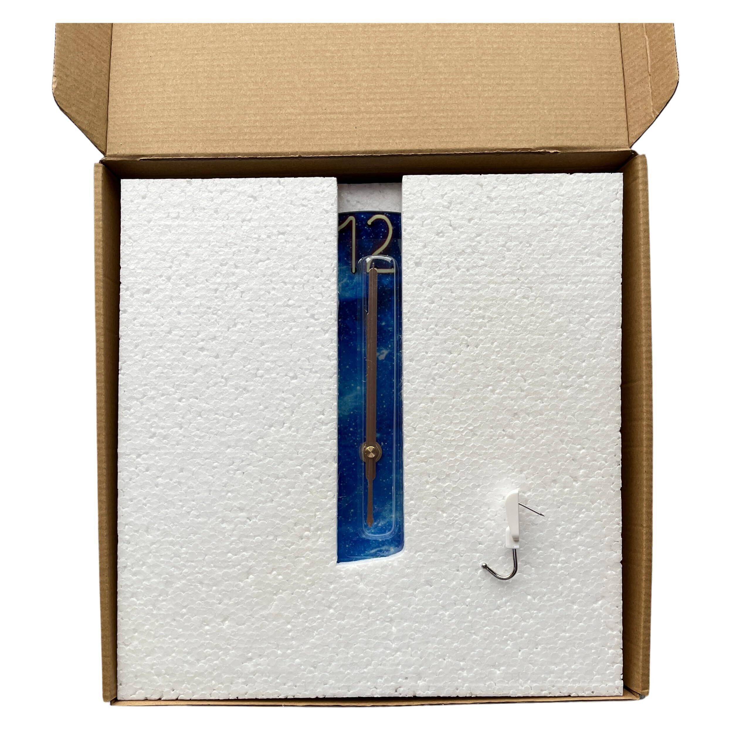 梱包サイズ :約31.5cm X 約32cm X 約4cm 重さ650gで、時計の前面と裏面に型抜きした発泡スチロールで保護されています。(取付用フック1個同梱、日本語説明書同梱)