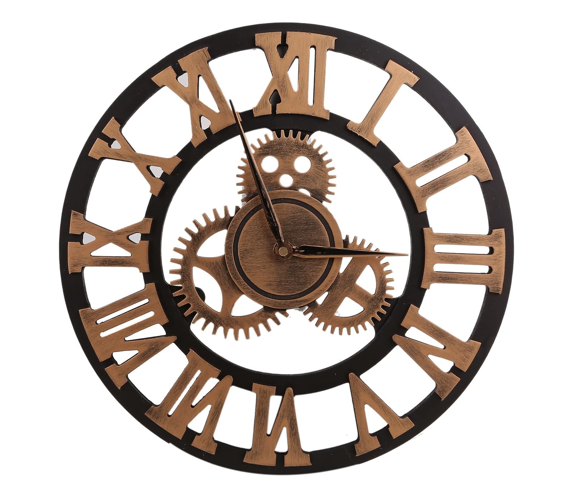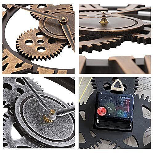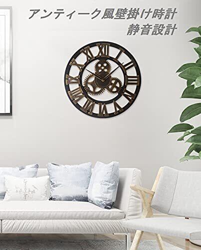 壁掛け時計 アンティーク風 レトロ ギア 歯車 木製 インダストリアル風 音がしない静穏 モダン 掛け時計 ウォールクロック (ゴールド)