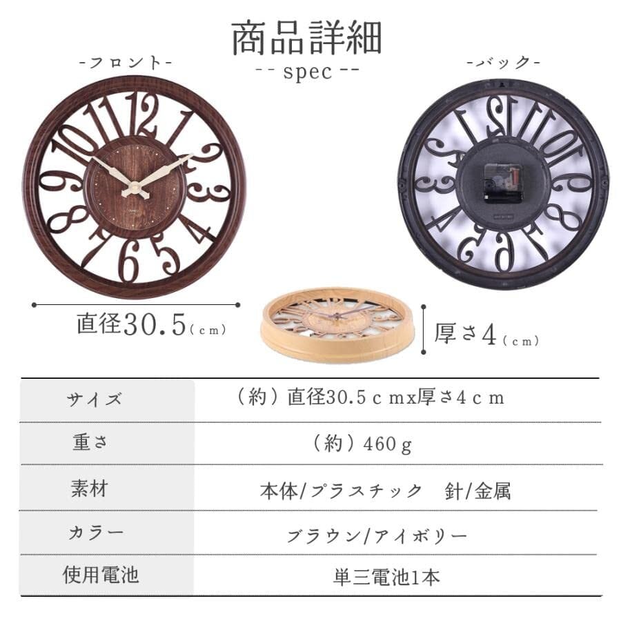 ■製品仕様 ・サイズ:(約)直径30.5cm×厚さ4cm ・重量:(約)460g ・材質:本体:プラスチック 針:金属 ・使用電池:単3電池1本(別売) ■時間調整方法 ・手動(電波時計ではございません) 電波がうまく受信できずに時刻合わせに苦労する場所にオススメです。