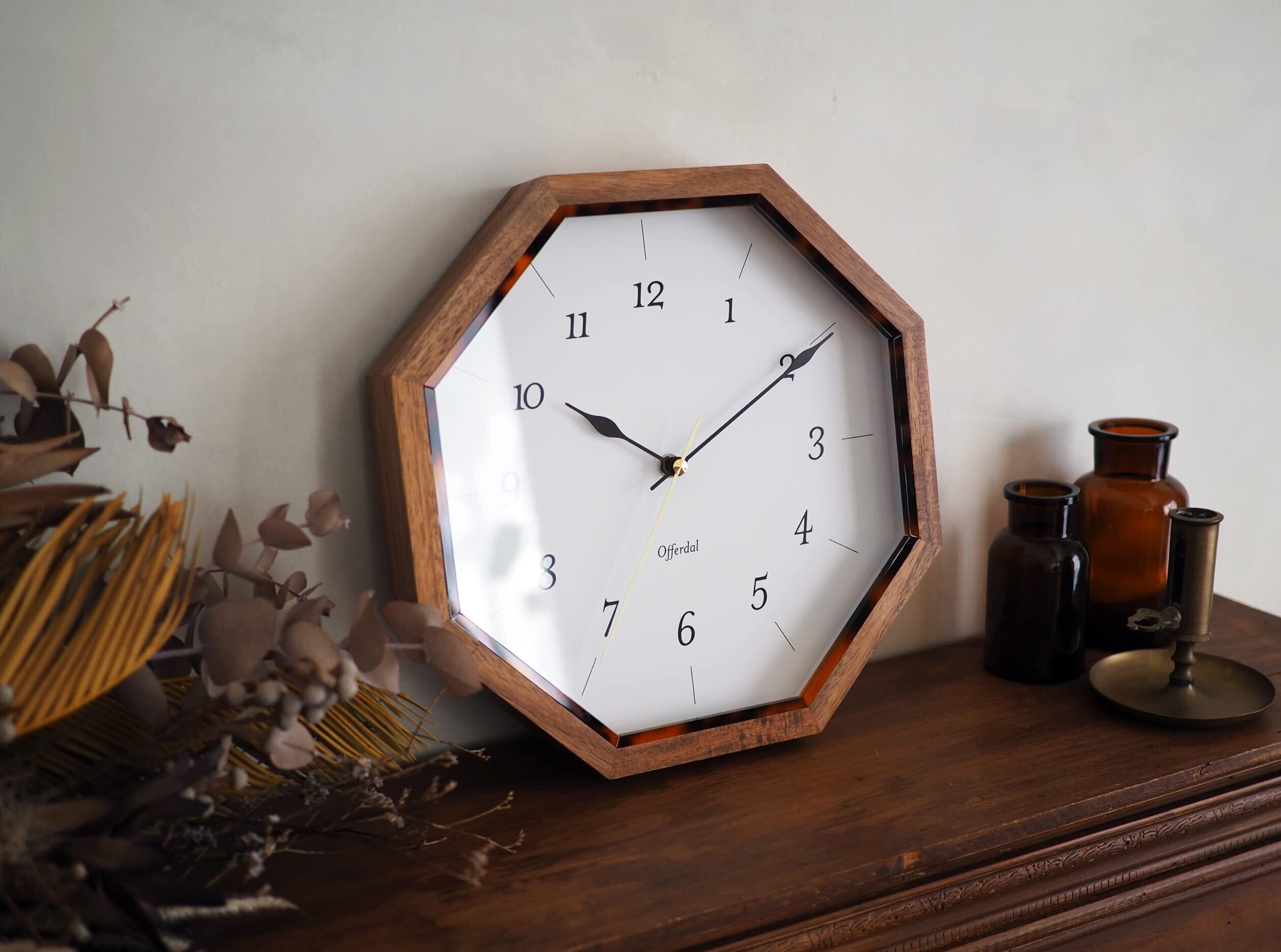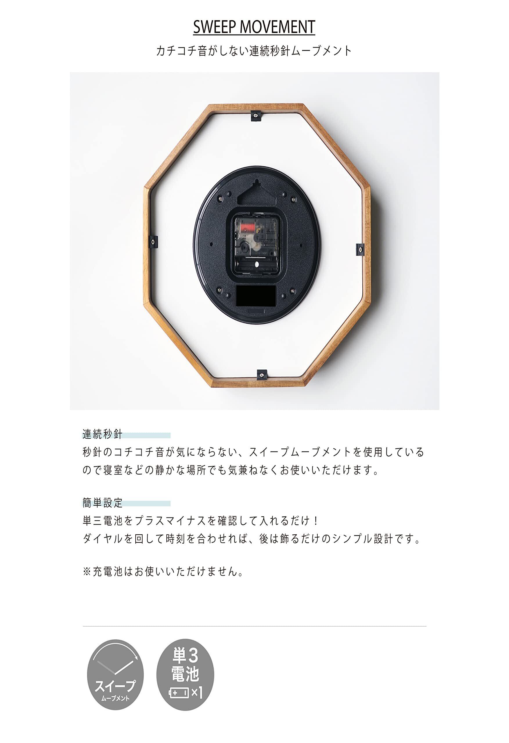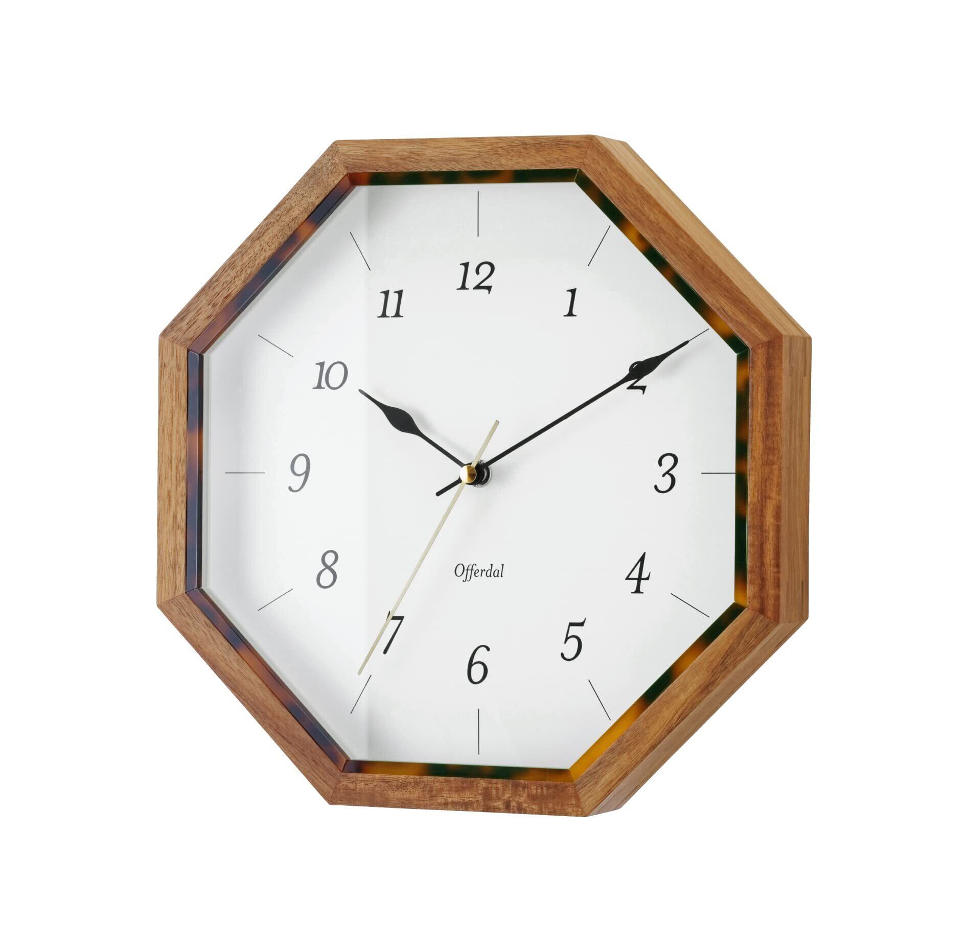 【商品の概要】 八角形のウッドフレームの内側に、さりげなくべっ甲調のアクセントを添えたウォールクロック。 数字や針にレトロなデザインを採用し、品のあるルックスに仕上げました。 ブラウンを基調とした落ち着きのあるカラーリングは、インテリアのシックなアクセントとなります。