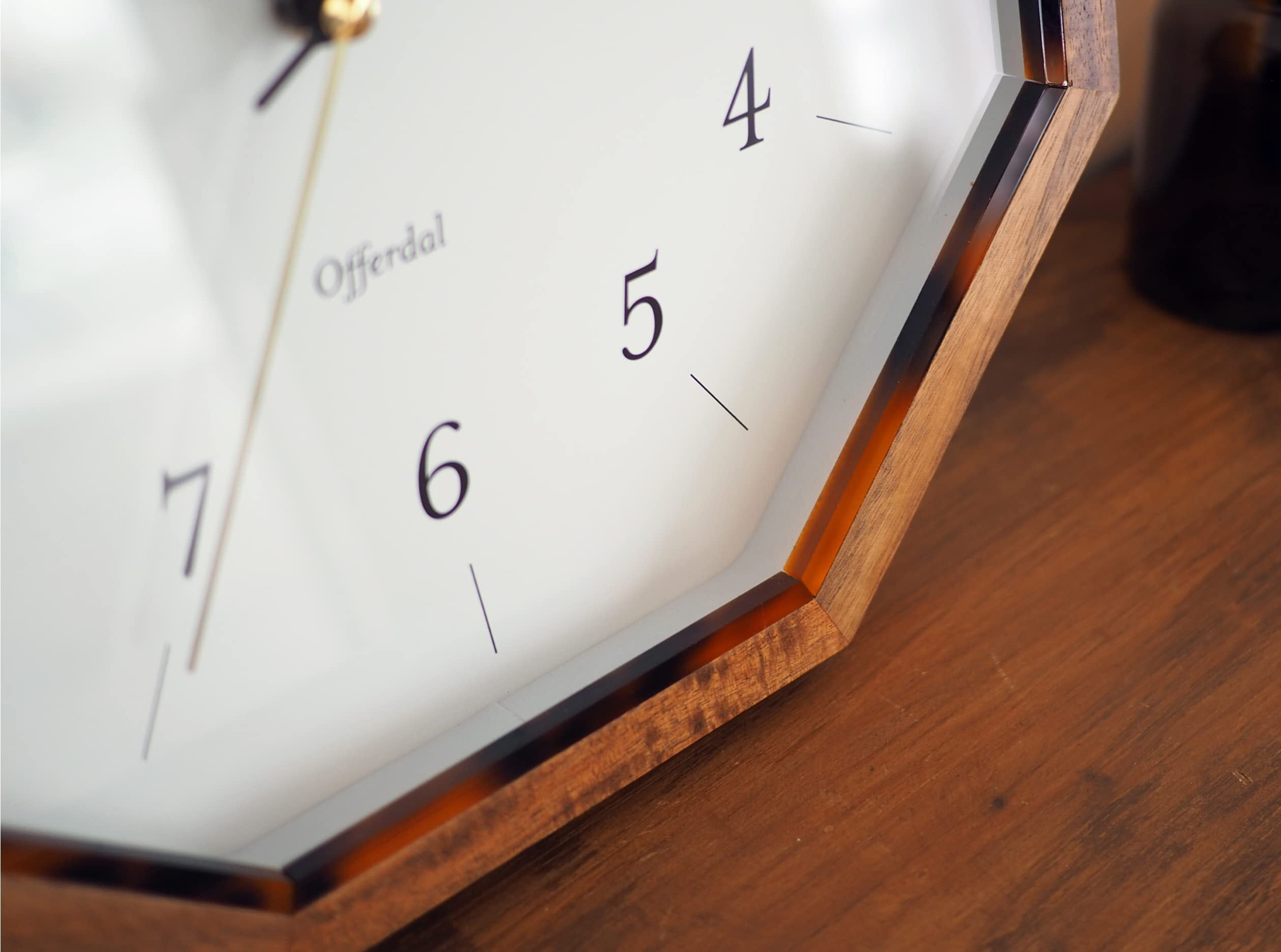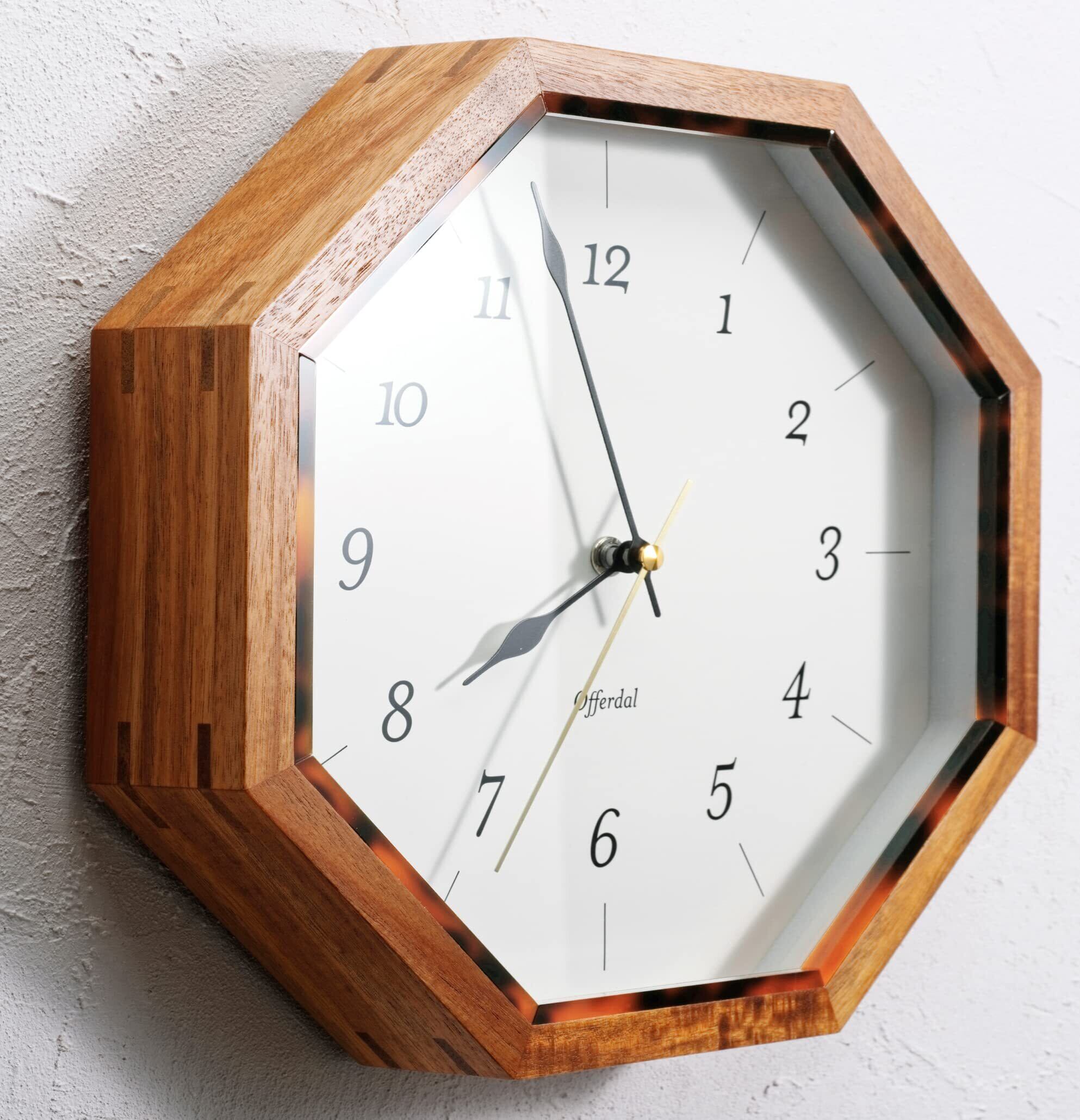 【使用シーン】 スタンダードな八角形のフォルムでありながら、べっ甲調の色どりが華やぐウォールクロックはリビングやダイングなどの憩いの場所におすすめです。 運針音の鳴らないスイープムーブメントを使用しているので、寝室や書斎などの静かなお部屋にもおすすめです。