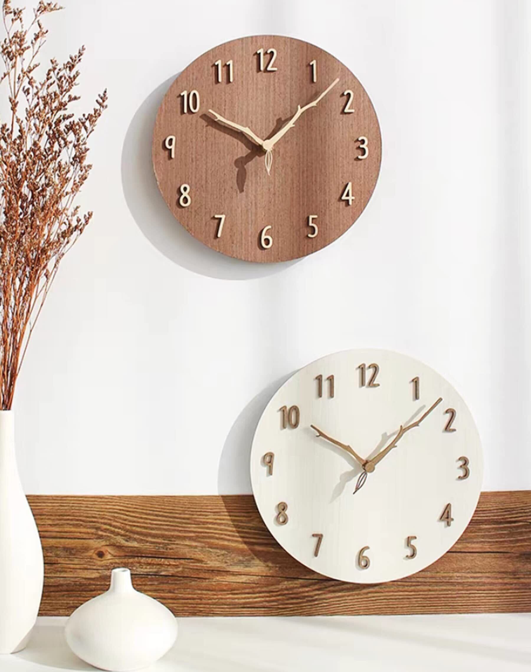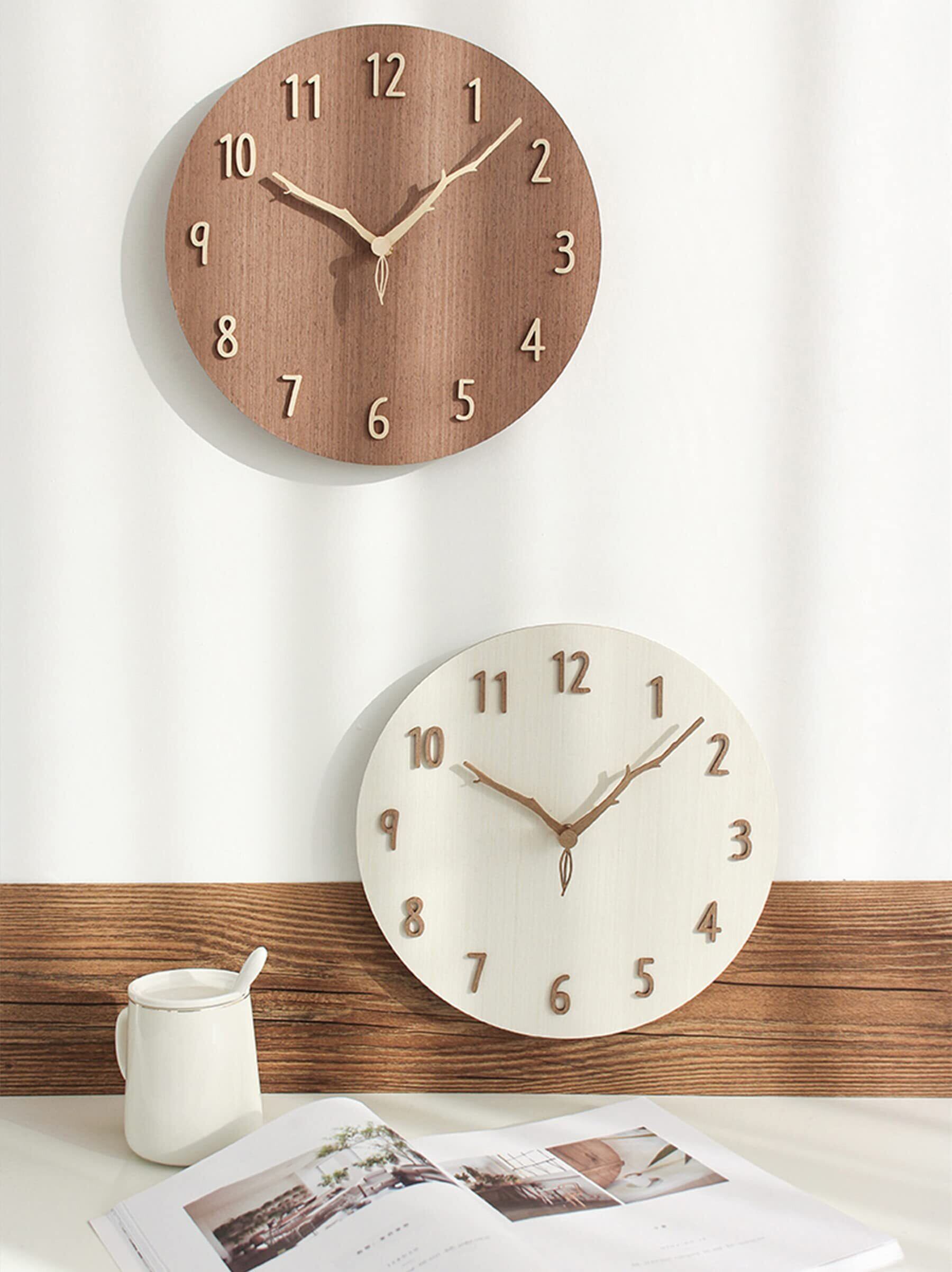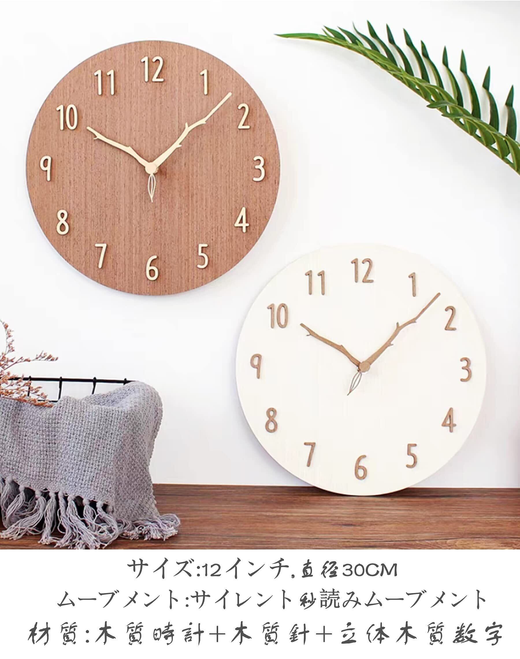 §BOMU-TECH∞BOMU掛け時計 人気 かわいい おしゃれ 北欧 静音 天然 木枠 アナログ 連続秒針 可愛い葉っぱ枝形 無垢材針 3D立体数字 見やすい 12インチ 現代家庭装飾 引っ越し 祝日プレゼント (ブラウン)