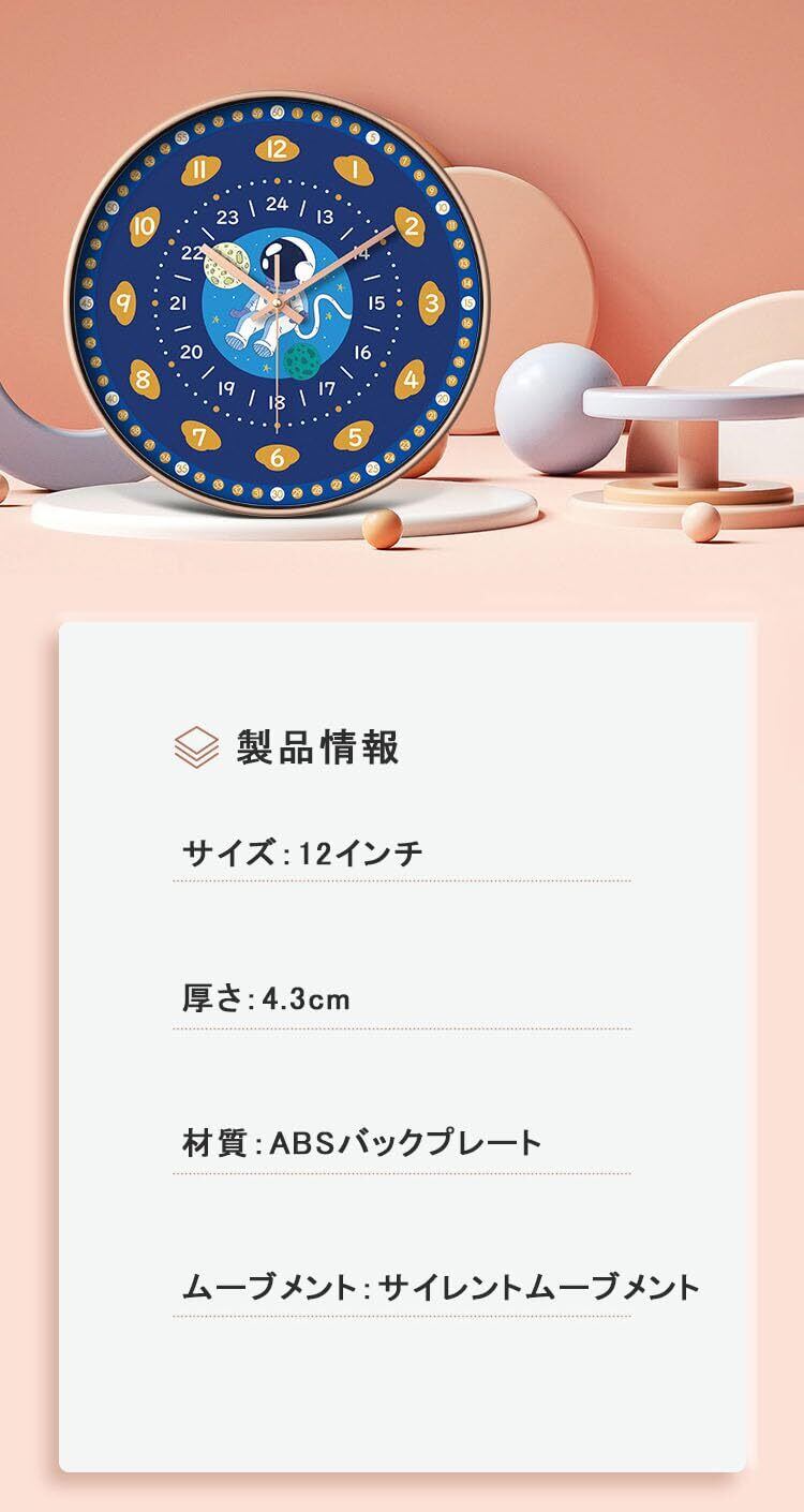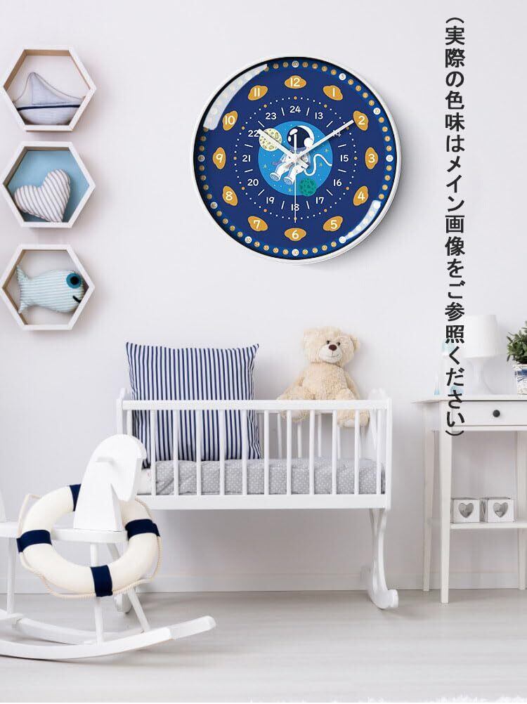 【在庫セール】Icycow知育時計 正確な時刻を刻む 漫画柄 壁掛け 掛け時計 子供 知育 見やすい おしゃれ 子供部屋 カラフルな 子どもの掛け時計 キッズ 12インチ 可愛い 静音 連続秒針 丸型(アストロノーツゴールドフレーム)