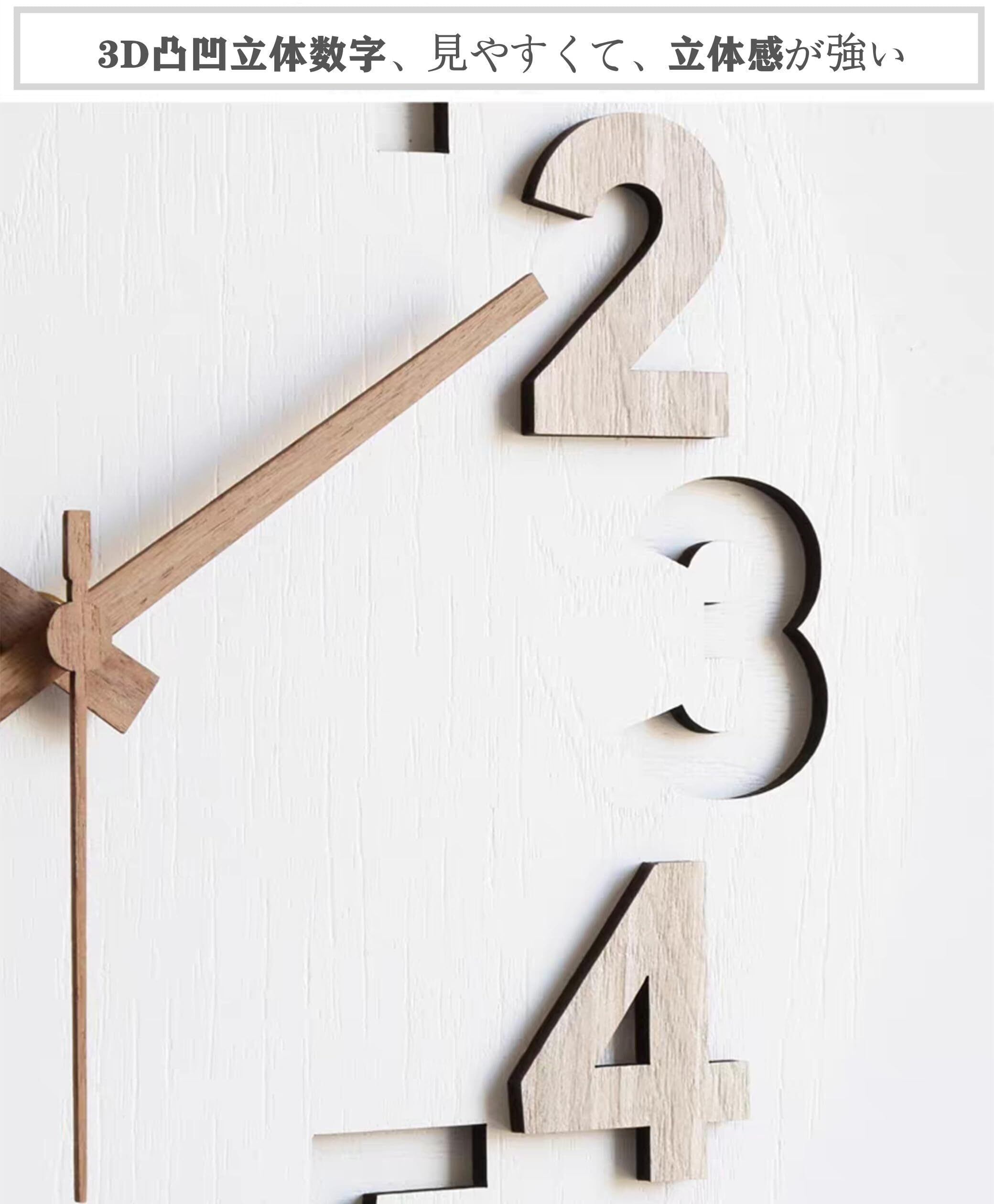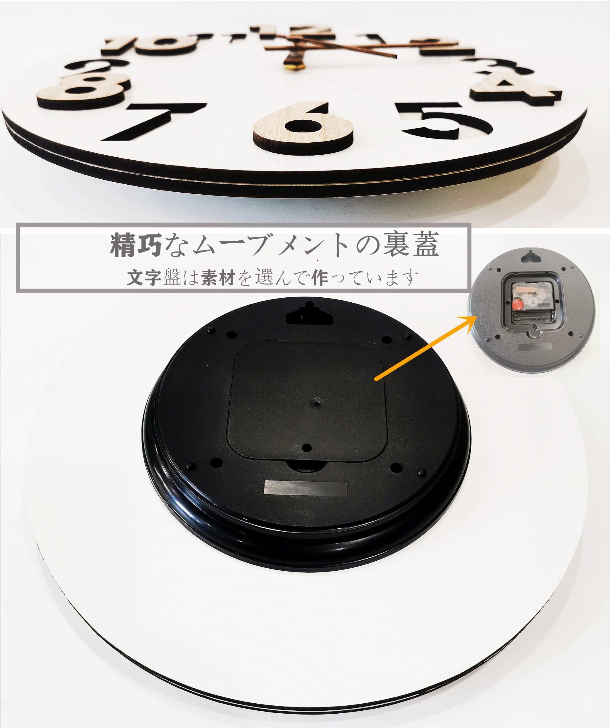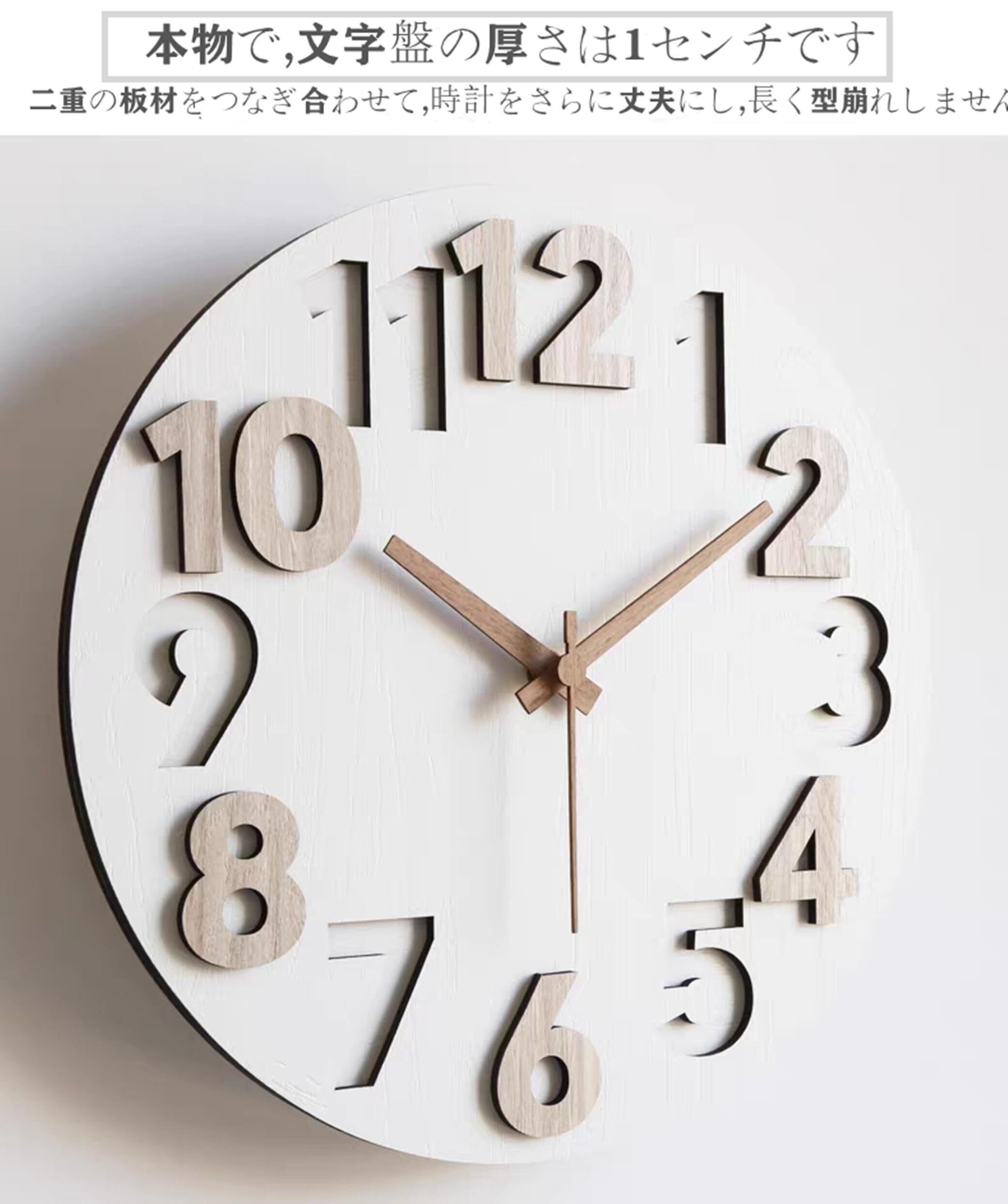 1.【掛け時計 サイズ】サイズ:12インチ(時計直径30cm)×厚さ1cm (※サイズには多少の誤差が発生します。ご了承下さい。)本体重量:約600グラム 材質:天然木、電池:単3乾電池1本(付属電池なし) ご注意:アルカリ電池に対応できません。 ムーブメント:スイープタイプ(連続秒針)【セット内容】本体(電池が付属致しません)、取扱説明書、壁掛け用フック。※包装内には壁掛け用フックが付いています。画像のように、時計がしっかり掛かっていることをご確認ください。また、時計に傾きがあると時計の精度や機能が正常に働きません。
