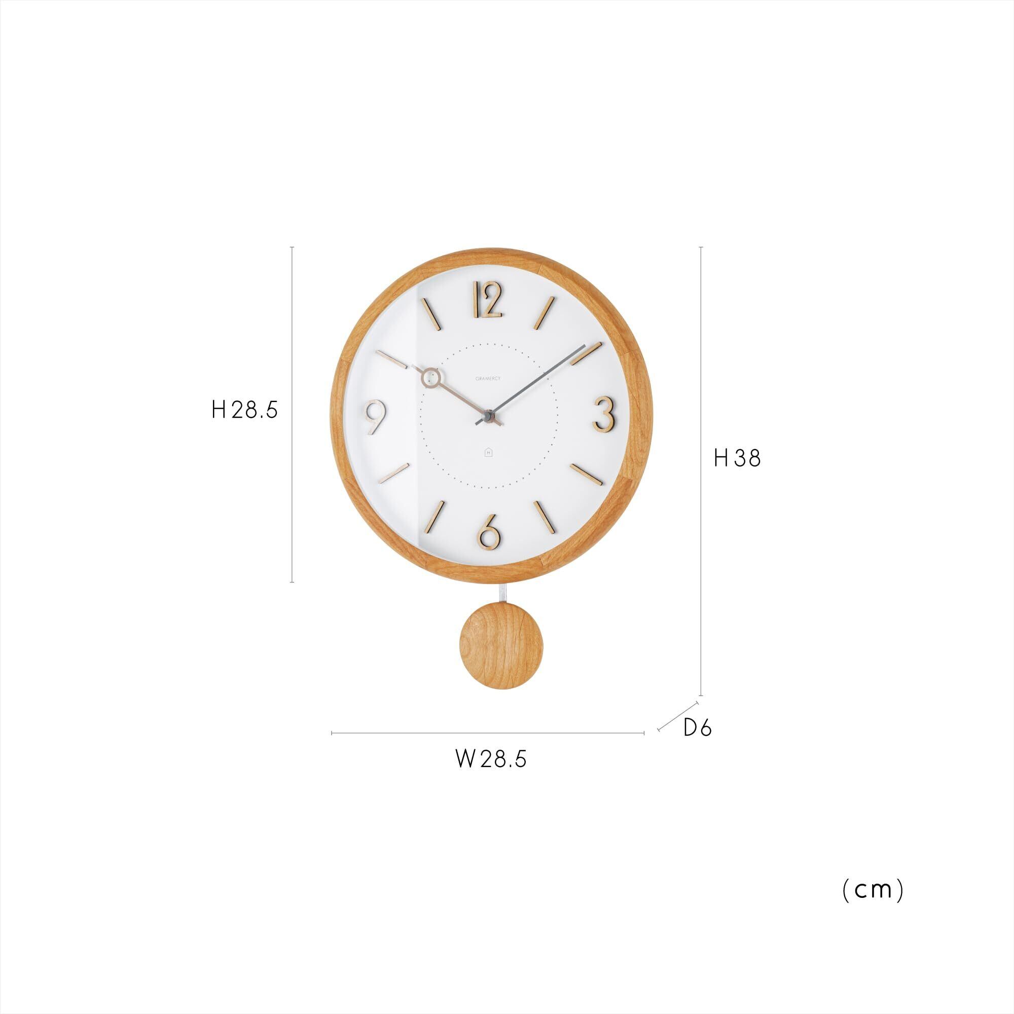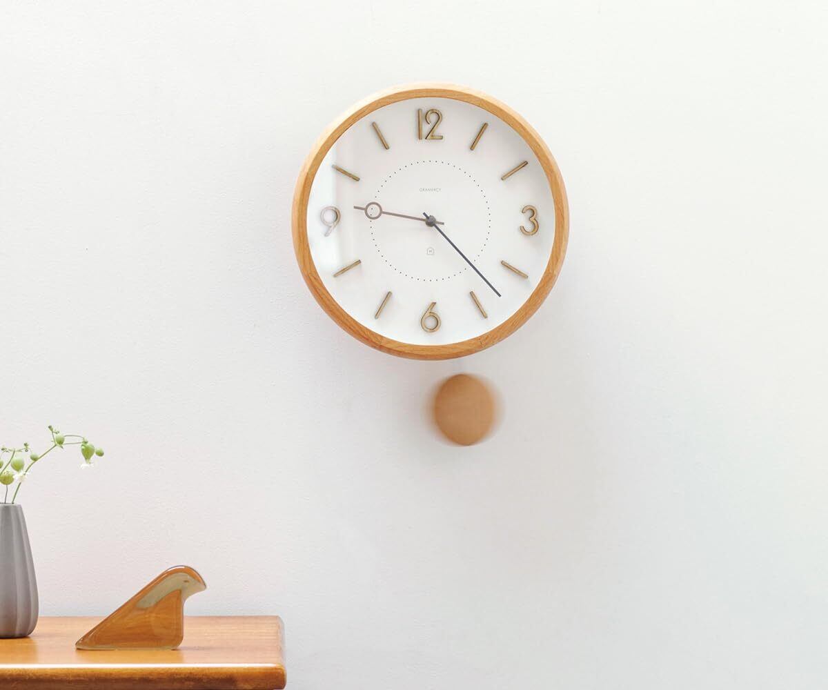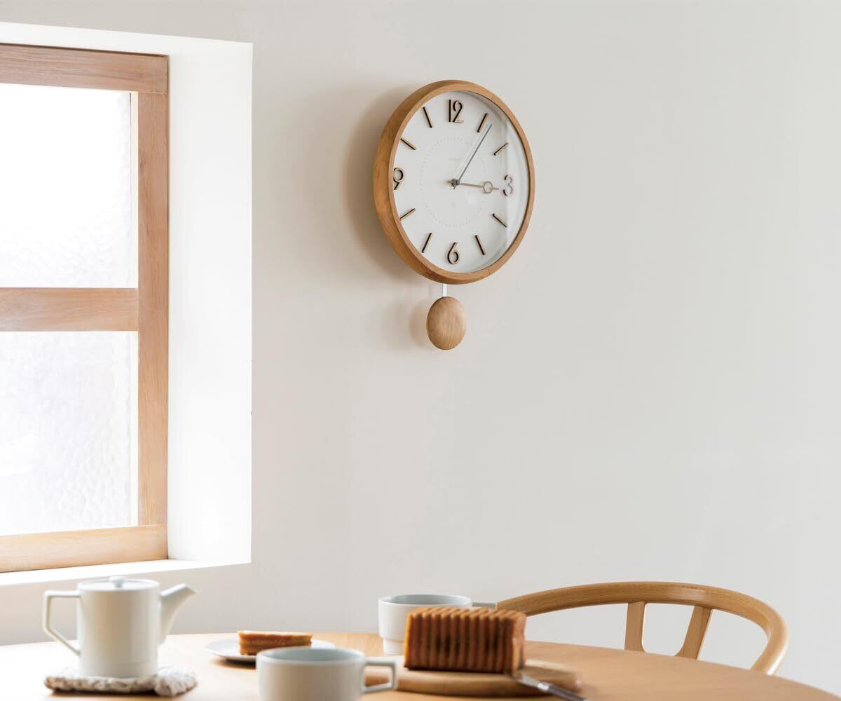【ポイント】 ていねいに角を落としたフレームとシンプルな文字盤、少し大きめの木の振り子が漂わせるやさしげなムード。木を贅沢に使用した温度感のあるデザインはリラックスしたひとときに寄り添います。