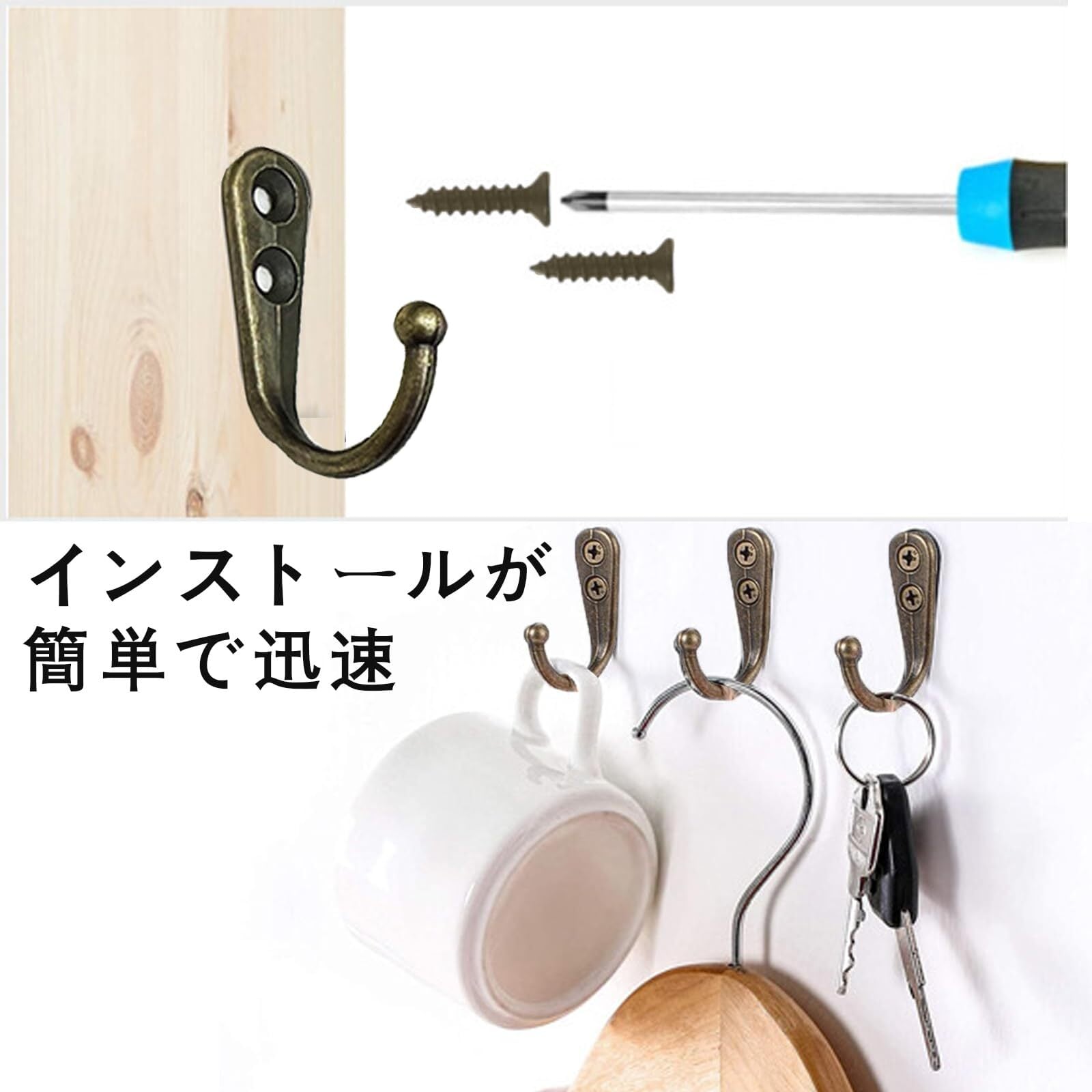 【二重穴取り付け】:ダブルホールのデザインは、フックをより安定させ、より高い耐荷重を持っています。ネジ付きで、取り付けが簡単です。収納便利、省スペースでお部屋のスペースを活用できます。無垢材や木部への取り付けを推奨します。