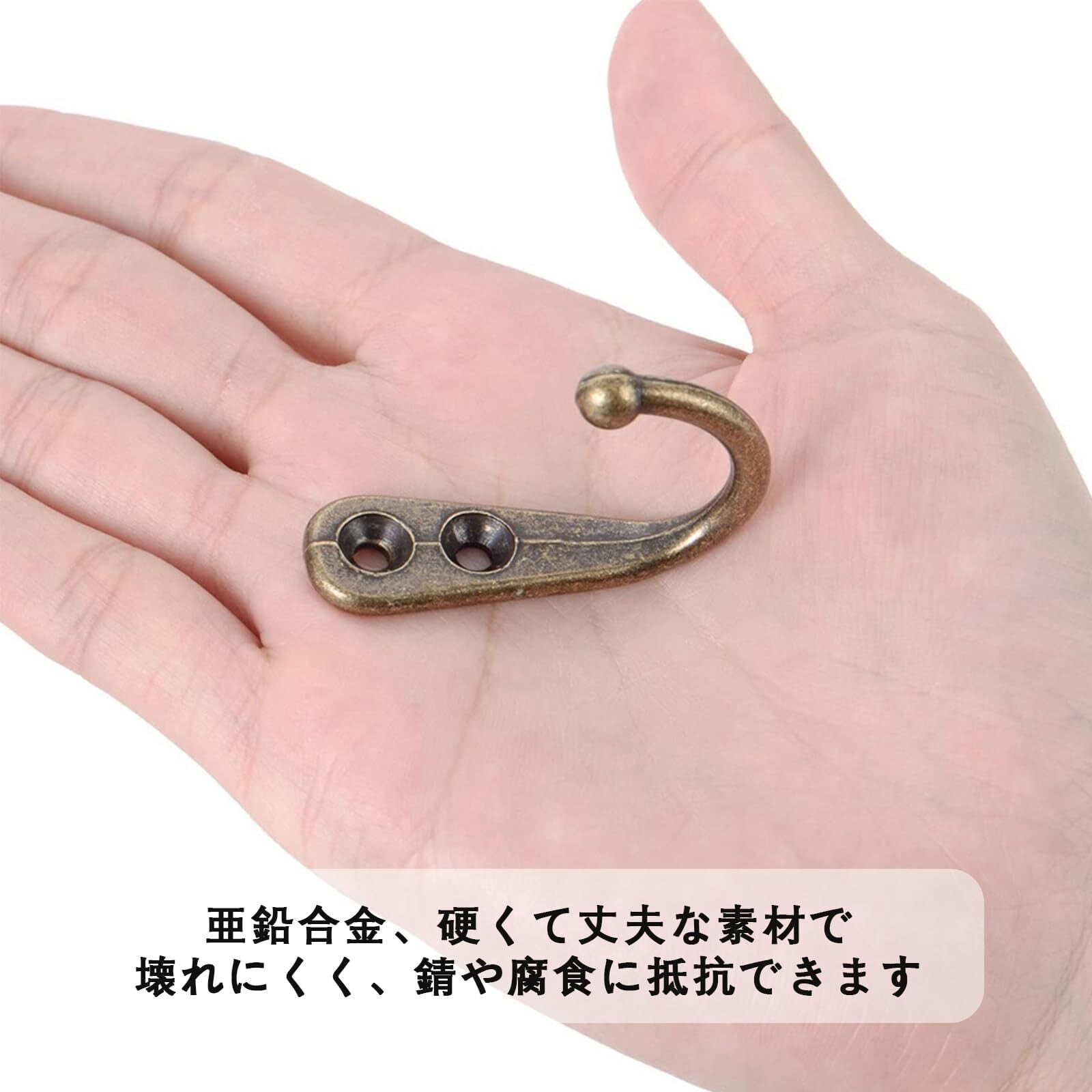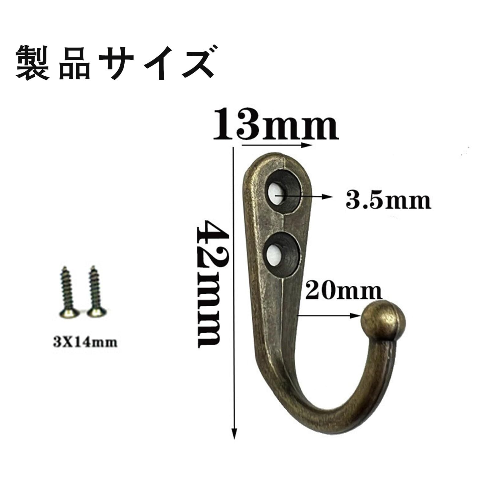 【梱包入数】:10個入り、装飾カバー付き、収納ケース付き 。 【サイズ】 :約41 * 28mm ;カラー:ブロンズ;単体で約6.85gです。 【二重穴取り付け】:ダブルホールのデザインは、フックをより安定させ、より高い耐荷重を持っています。ネジ付きで、取り付けが簡単です。収納便利、省スペースでお部屋のスペースを活用できます。無垢材や木部への取り付けを推奨します。 【使用便利】ネジ付きで、取り付けが簡単です。収納便利、省スペースでお部屋のスペースを活用できます。装飾性と実用性がある壁掛けフックです。 【幅広い用途】:洋服、コート、帽子、カバンなどいろいろな荷物を引っ掛ける事ができます。 アンティーク調のレトロなデザインがとてもお洒落です。幅広い材料の家具と相性抜群で、家具や小物、扉などの雰囲気をお洒落に! 何気なく目にするフック一つを付け替えることで、お部屋の雰囲気が変わりインテリアのアクセントに!