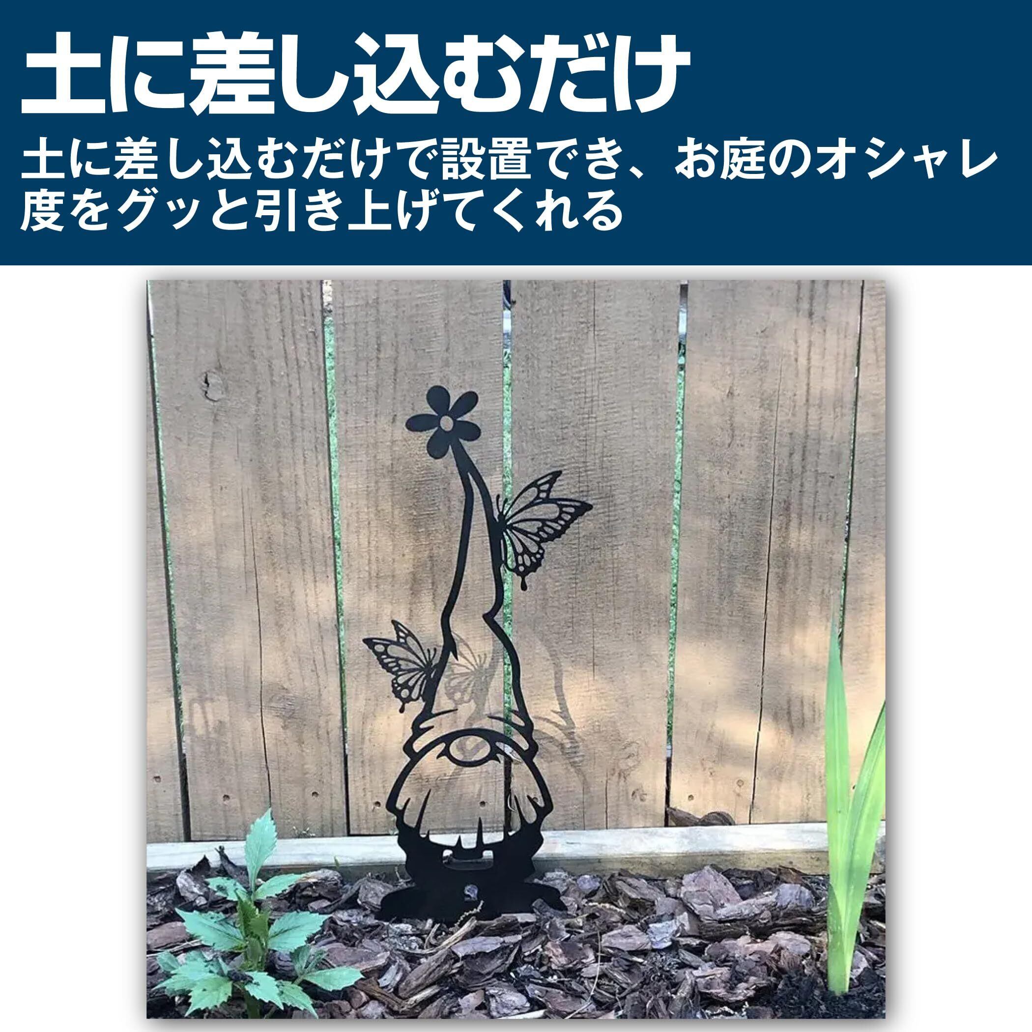 アイアン製小人型ガーデンオブジェ:シックでモダンな雰囲気のアイアン製ガーデンオブジェです。絵本の世界から飛び出してきたような、ほっこり可愛らしい小人がモチーフです。どんなお庭にも飾りやすいプレート状のガーデンオブジェに仕上げました。