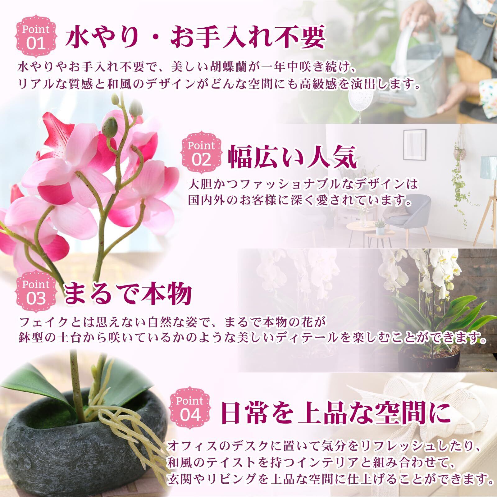 使い方はとても簡単で、卓上や棚、玄関の飾りとして設置するだけでOK。忙しい日常の中で、癒しと落ち着きをもたらしてくれる胡蝶蘭が、お部屋の雰囲気を一変させます。 オフィスのデスクに置いて気分をリフレッシュしたり、和風のテイストを持つインテリアと組み合わせて、玄関やリビングをモダンでエレガントな空間に仕上げることができます。 また、置き場所を選ばないコンパクトサイズなので、狭いスペースでもしっかりと映える存在感を持ちます。