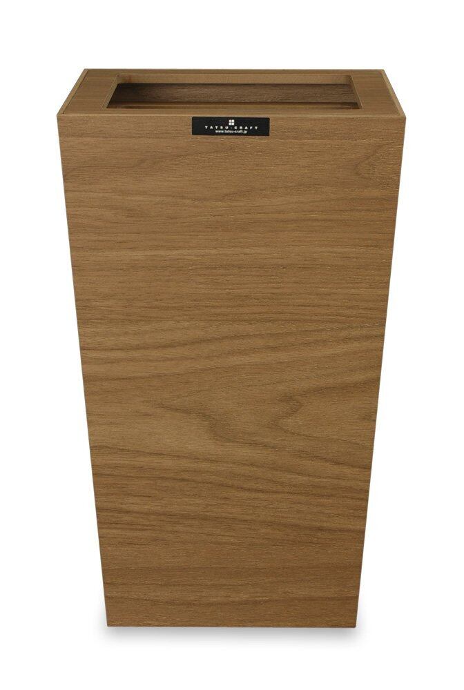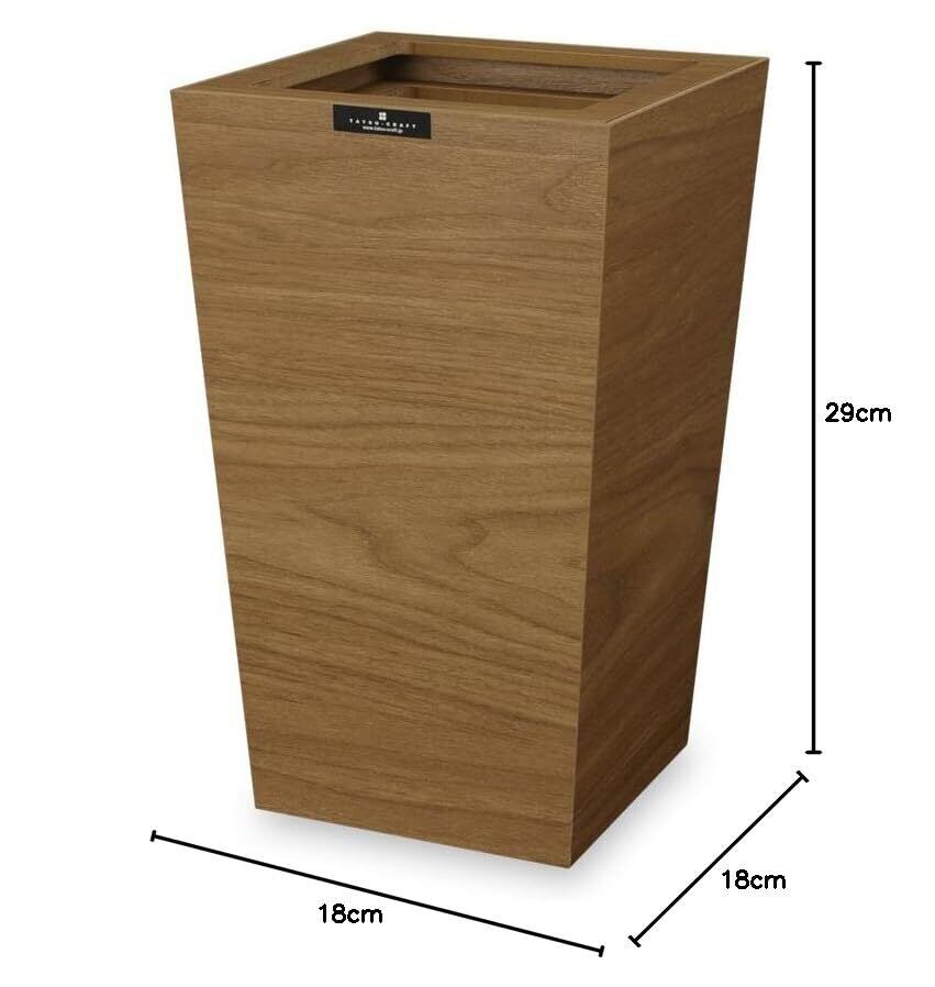 【商品仕様】サイズ 180×180×290mm 重量 915g 容量 7L 材質 プリント紙化粧繊維板(低ホルムアルデヒドのF認定品を使用) ウレタン塗装(断面部のみ)原産国 日本製(和歌山県海南市)製造メーカー 橋本達之助工芸【商品の特徴】シャープなイメージの木合板ダストボックス。フローリングにも映える木目テイストが印象的です。ソファの側に置きたくなるような上質な質感がポイントで、木合板製ながら、使い勝手には樹脂製のような便利さも持ち合わせています。上部のカバーは2重構造になっており、天面をフラットに見せるための上段カバーに加え、下段には袋留め専用の枠が付いています。ポリ袋などを取り付ければ、水分を含んだゴミも入れることができ、ゴミ箱にゴミを直接触れさせないようにすることもできます。衛生的に使えること、これは木材系のダストボックスには大切なポイントです。こちらは、より木目の質感を楽しめるブラウンタイプとなっております。インテリアにしっくり馴染むナチュラルなテイストが、フローリングにもよく似合います。是非、ソファや家具の横に添えてみてください。本来、ゴミ箱は使い勝手のよい場所に置きたいもの。しかし、見た目にゴミ箱感が出すぎたものは、ついついお部屋の隅に隠してしまいがちに…その点、バスクダストボックスはスタイリッシュなフォルムが大きな特徴。お部屋の中に素敵なアクセントが生まれます。