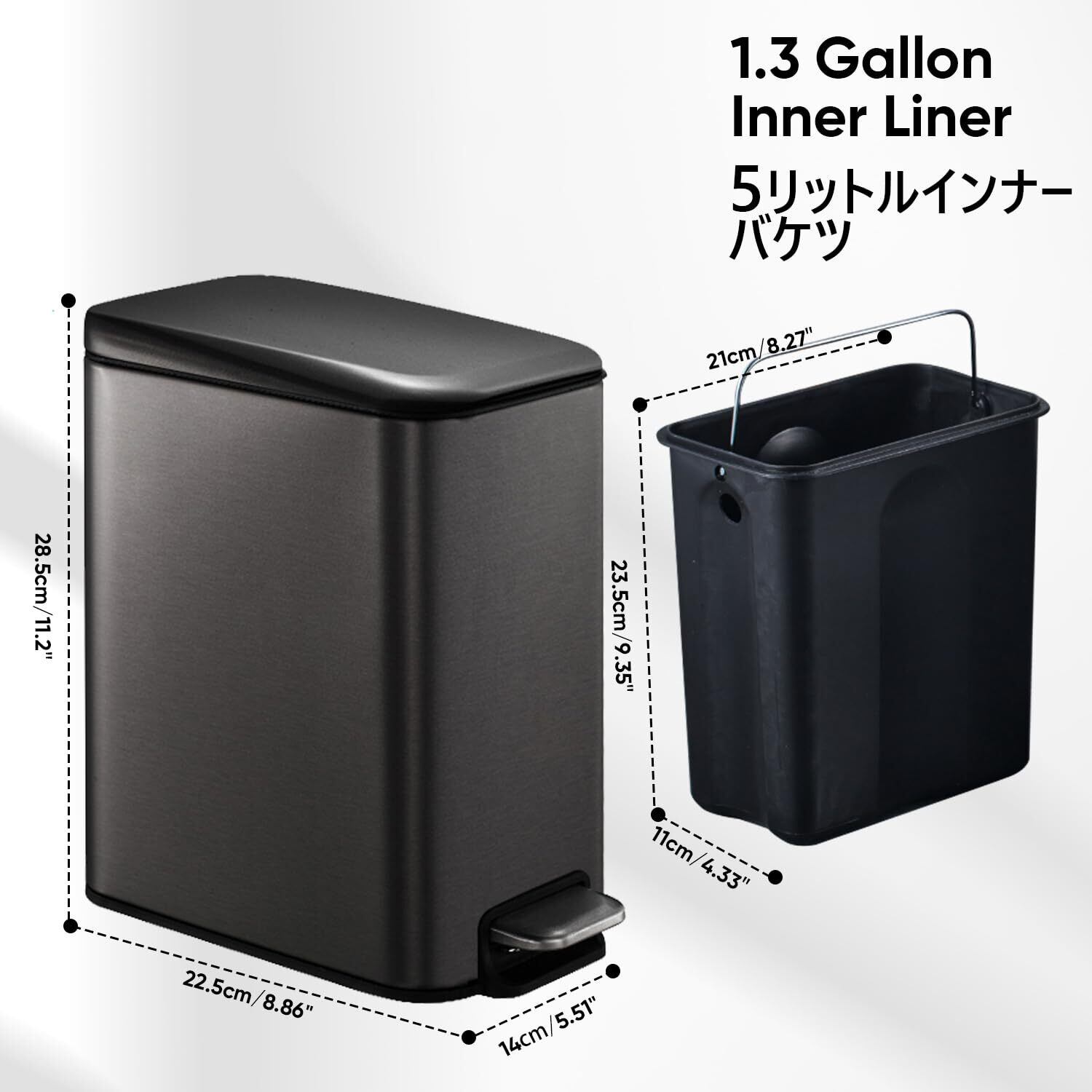 「生ゴミゴミ箱サイズ」サイズは高さ28.5CM、広さ14CM、奥行き22CM,容量は5リトッルで、ちょうど良いボリュームで毎日の需要が満足できる.インナーペールが取り外すことができます.そしてペールにはバッグタックがありますので、大き目ゴミ袋を使っても、ゴミ袋のあまり部分がきれいに収められます.
