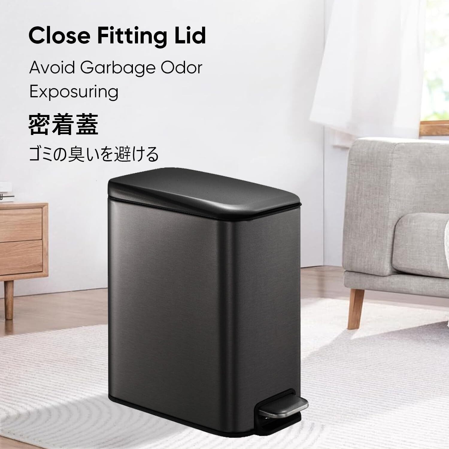 「神秘なブラックゴルドー5リットルゴミ箱」神秘なブラックゴルドーステンレスゴミ箱は本当に品格が高いです。 形は縦開ける四角形ステンレスゴミ箱.スリムでコンパクトなダストボックス、コーナーや壁に沿って置きやすく、狭い隙間とデードスペースにも 有効活用できる.オフィス、キッチン、ベドルーム、浴室で使用も進めます