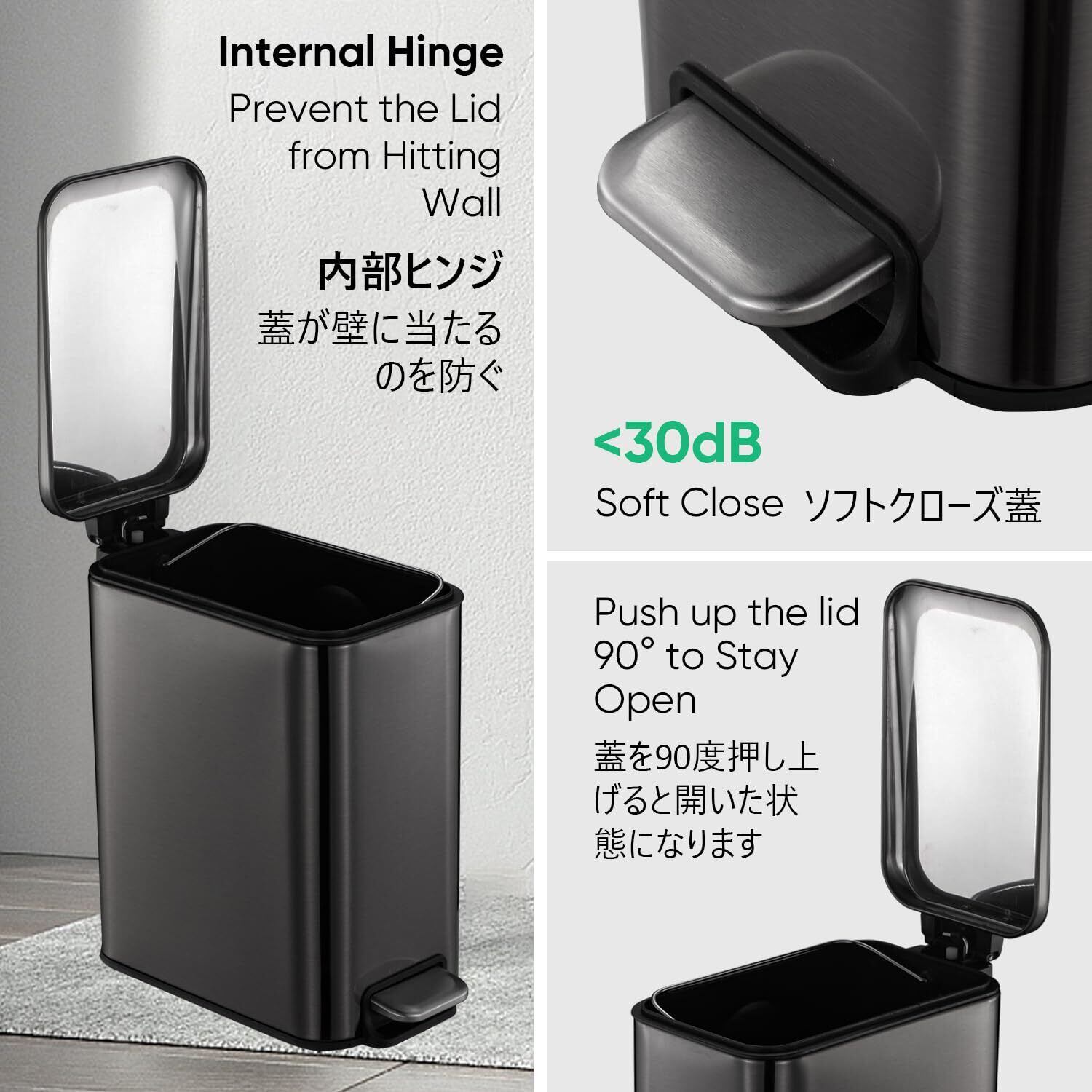 「おしゃれな5lゴミ箱ペダル式と静かなフタ」ペタル式で手を使わずに開けれて衛生的で便利です.耐久性の丈夫なステンレスチールペダルで、フットペダルをふんで簡単に蓋が開けられます.ダンパーシステムにより、ゴミを捨てたあとペダルからすぐ足をはなしても蓋がゆっくり閉めることができます.閉めるとき騒音を減軽ことができます.蓋が90度立つことができて、掃除時とゴミ袋を交換する時に便利です.フタが付いているので、匂いが漏れないです.