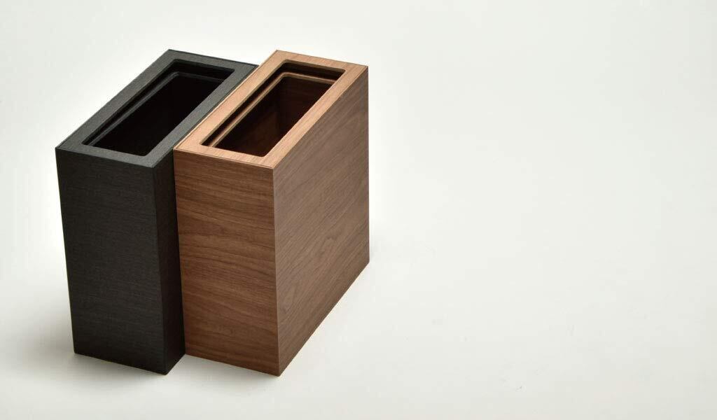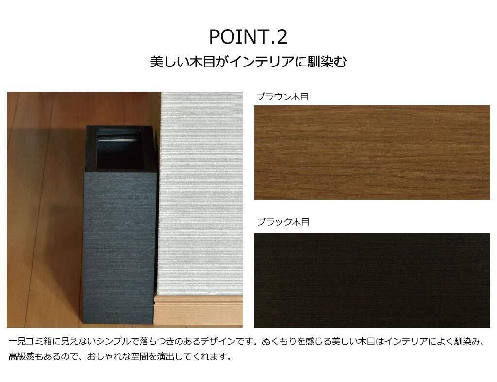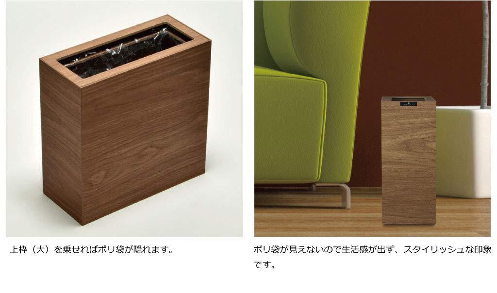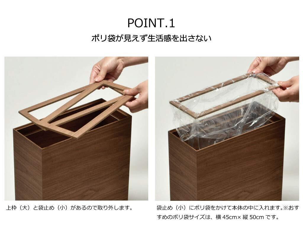 シャープなイメージの木合板ダストボックス。フローリングにも映える木目テイストが印象的です。ソファの側やデスクの下に置きたくなるような上質な質感がポイントで、上部のカバーは2重構造になっており、天面をフラットに見せるための上段カバーに加え、下段には袋留め専用の枠が付いています。ポリ袋などを取り付ければ、水分を含んだゴミも入れることができ、ゴミ箱にゴミを直接触れさせないようにすることもできます。