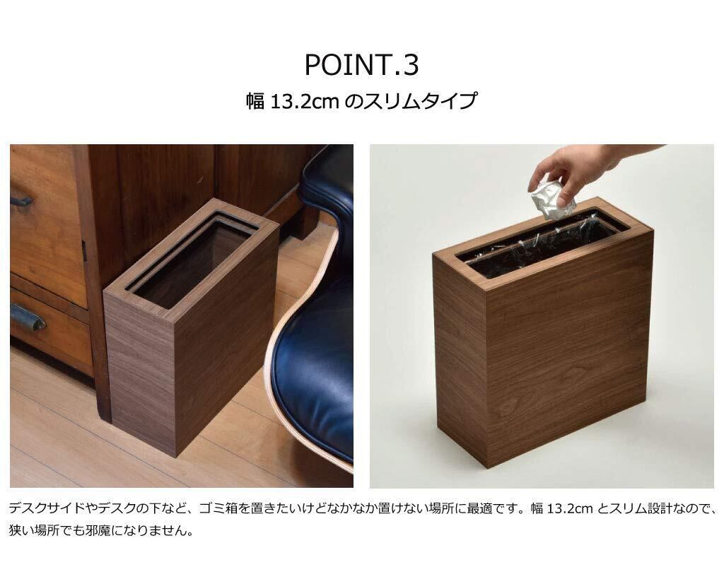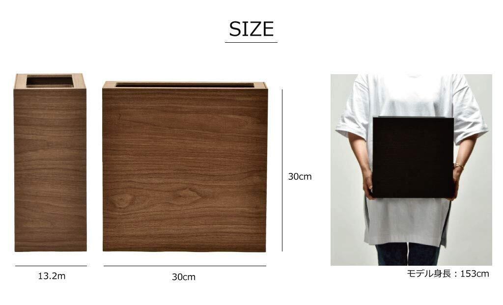 【商品仕様】サイズ 132×300×300mm 重量 1450g 容量 8.5L 材質 プリント紙化粧繊維板(低ホルムアルデヒドのF認定品を使用) ウレタン塗装(断面部のみ)原産国 日本製(和歌山県海南市)製造メーカー 橋本達之助工芸【商品の特徴】シャープなイメージの木合板ダストボックス。フローリングにも映える木目テイストが印象的です。ソファの側やデスクの下に置きたくなるような上質な質感がポイントで、上部のカバーは2重構造になっており、天面をフラットに見せるための上段カバーに加え、下段には袋留め専用の枠が付いています。ポリ袋などを取り付ければ、水分を含んだゴミも入れることができ、ゴミ箱にゴミを直接触れさせないようにすることもできます。衛生的に使えること、これは木材系のダストボックスには大切なポイントです。こちらは、明るめの木目の質感を楽しめるナチュラルタイプ。インテリアにしっくり馴染むナチュラルなテイストが、フローリングにもよく似合います。是非、ソファや家具の横に添えてみてください。本来、ゴミ箱は使い勝手のよい場所に置きたいもの。しかし、見た目にゴミ箱感が出すぎたものは、ついついお部屋の隅に隠してしまいがちに...。その点、バスクダストボックス スリムならお部屋の中の素敵なアクセントになります。また細身で幅を取りませんのでデスク下でも足下がすっきり邪魔になりません。