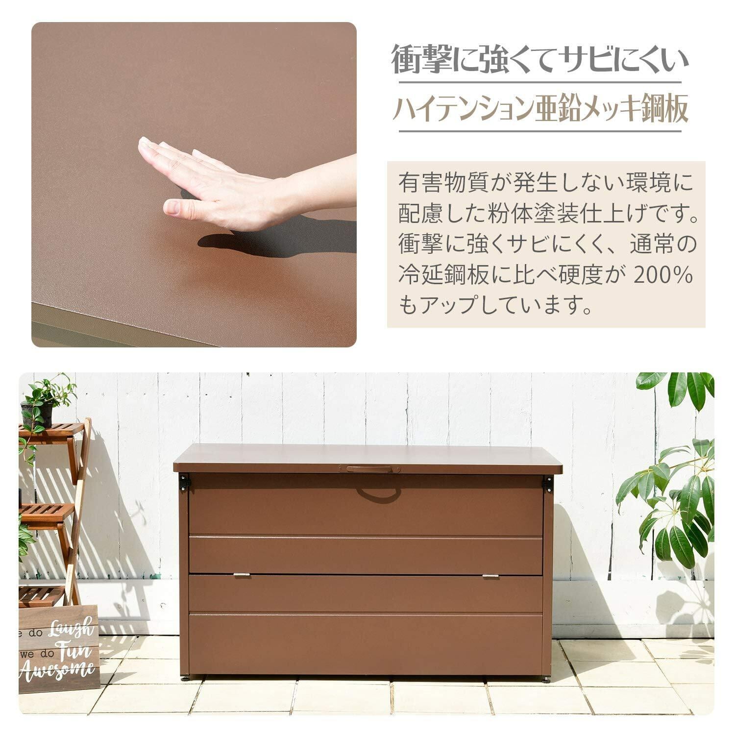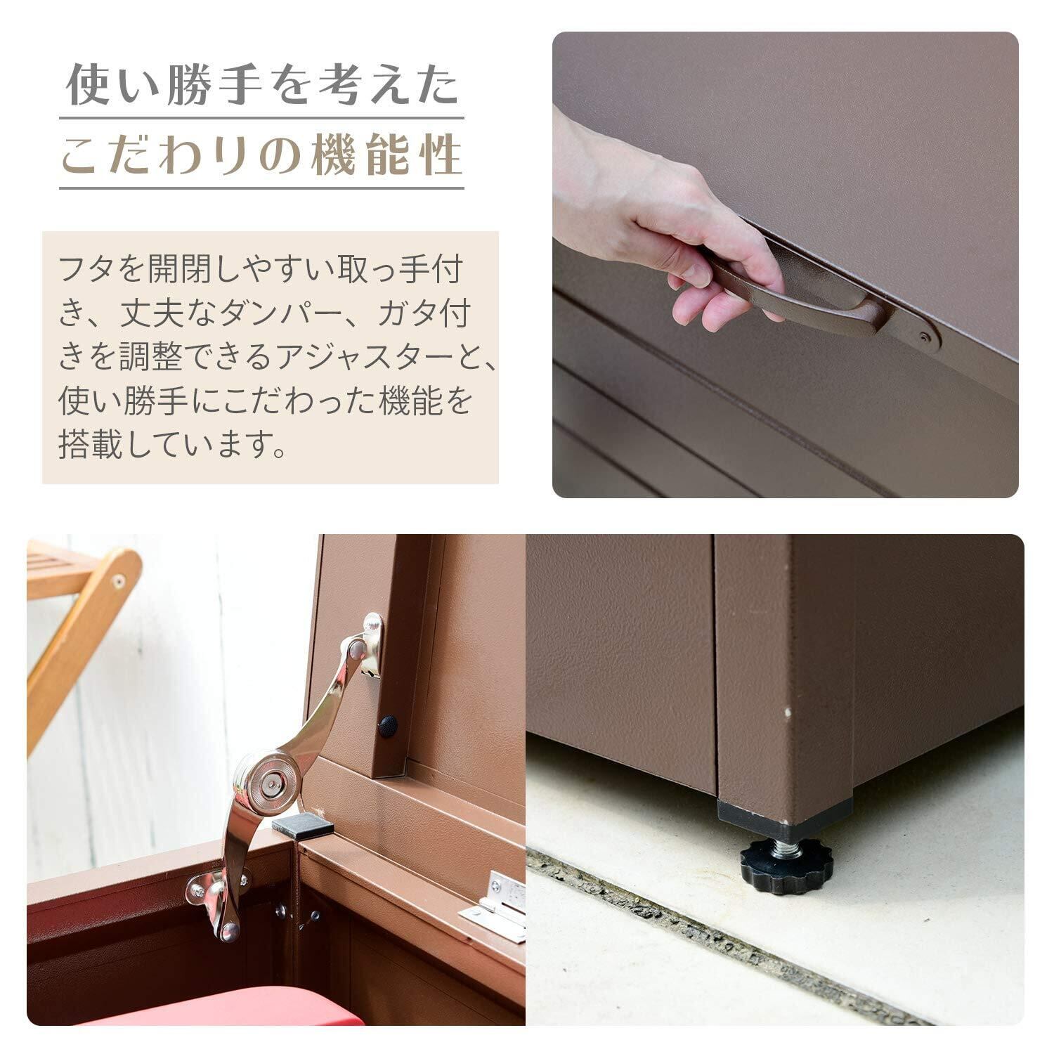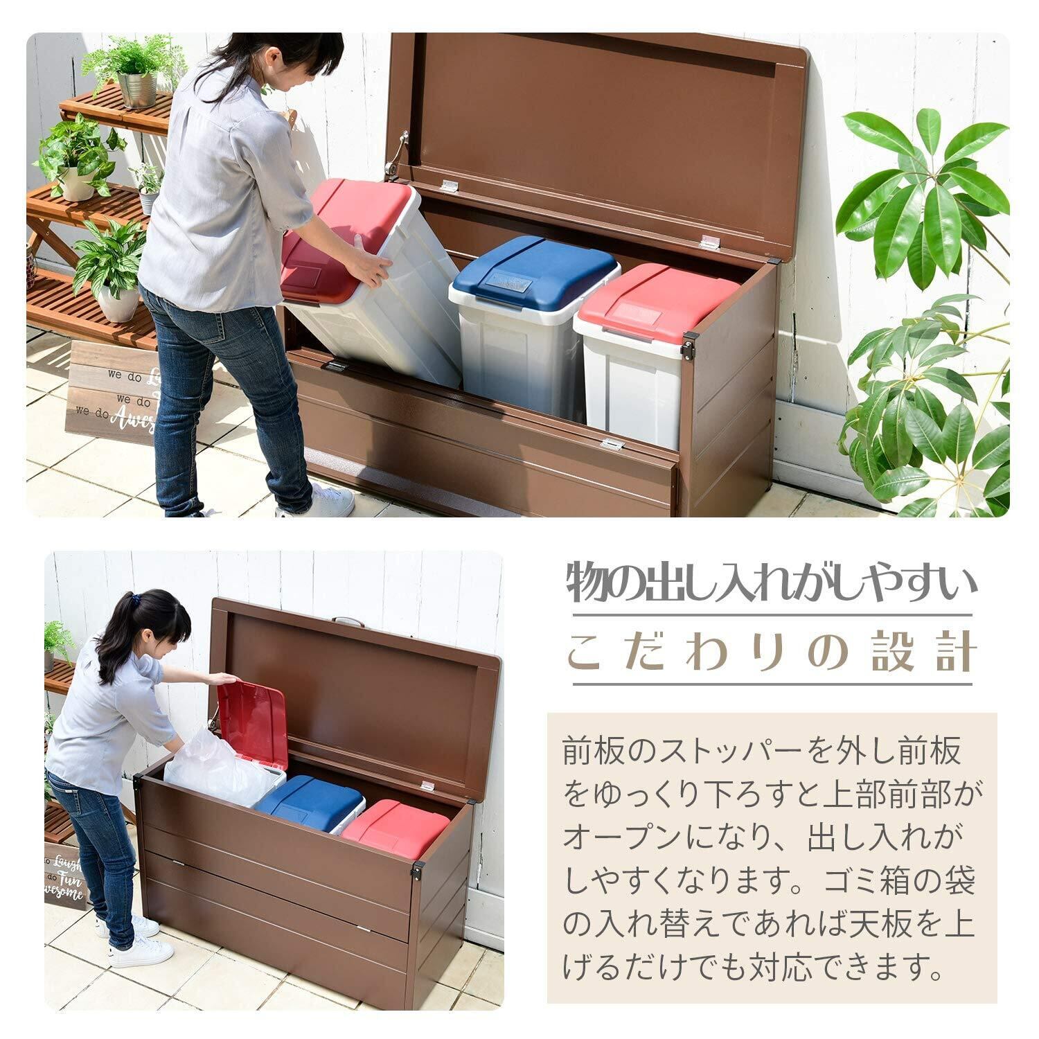【特徴】物の出し入れがしやすい屋外用ダストストッカーです(組立品)。カラーはミディアムブラウンです。ハイテンション亜鉛メッキ鋼板は、有害物質が発生しない環境に配慮した粉体塗装仕上げです。衝撃に強くサビにくく、通常の冷延鋼板に比べ硬度が200%もアップしています。たっぷり入る大容量設計で、40Lゴミ箱が3個/灯油缶18Lが5本収納保管可能です。ガーデングッズ・おもちゃ・工具箱など様々なものが収納できます。カラス対策や臭い対策にもおススメです。前板のストッパーを外し前板をゆっくり下ろすと上部前部がオープンになり、出し入れがしやすくなります。ゴミ箱の袋の入れ替えであれば天板を上げるだけでも対応できます。フタを開閉しやすい取っ手付き、丈夫なダンパー、ガタ付きを調整できるアジャスターと、細部にまで使い勝手にこだわった機能を搭載しました。