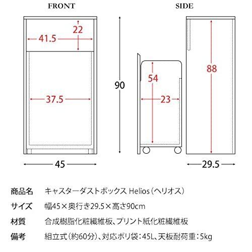 ゴミ箱に見えないスタイリッシュなデザインでお部屋に溶け込む、キャスター付き木製ダストボックス『Helios(ヘリオス)』。 ニオイが漏れにくく押すだけで簡単に捨てられるプッシュ扉式。 ゴミ箱は手元までサッと移動できるキャスター付きで、ゴミ捨ての際も取り出してすぐ回収できます。 ゴミ袋の着脱も簡単で利便性バツグンです。 たっぷり入る容量45Lで大家族のご家庭でも快適。 ブラウン×ブラックとブラウン、ナチュラルの3カラーをご用意。 お好みやお部屋の雰囲気でお選びいただけます。 サイズ 幅45×奥行き29.5×高さ90cm 材質 合成樹脂化粧繊維板、プリント紙化粧繊維板 備考 組立式(約60分)、対応ポリ袋:45L、天板耐荷重:5kg 申し訳ございませんが、北海道・沖縄・離島のお客様は、別途お見積もり。 関連キーワード:プッシュ式 ダストボックス 木製 くずかご キッチンペール ごみ箱 フタ付き ゴミ箱 おしゃれ 分別 ふた付き スリム ペダル キッチン 省スペース 扉付き ウッド ブラウン ペール 人気 おしゃれ オシャレ ランキング