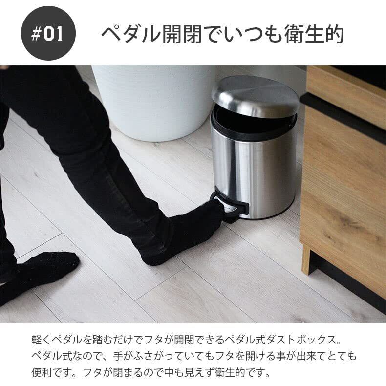 美しいデザインと機能性に優れたペダル式ゴミ箱(ダストボックス)。小さめの5Lサイズでトイレ・ランドリーにも使いやすいゴミ箱です。 手を使わずに開閉可能なペダル式。開閉はソフトクローズ仕様でゆっくり閉まる静音設計。夜間での気になる開閉音を軽減しました。 より衛生面が気になる場所だから、ゴミ箱本体内部をインナーボックス構造としております。インナーボックスは取り外して、水洗いでお手入れができるので清潔に保てます。