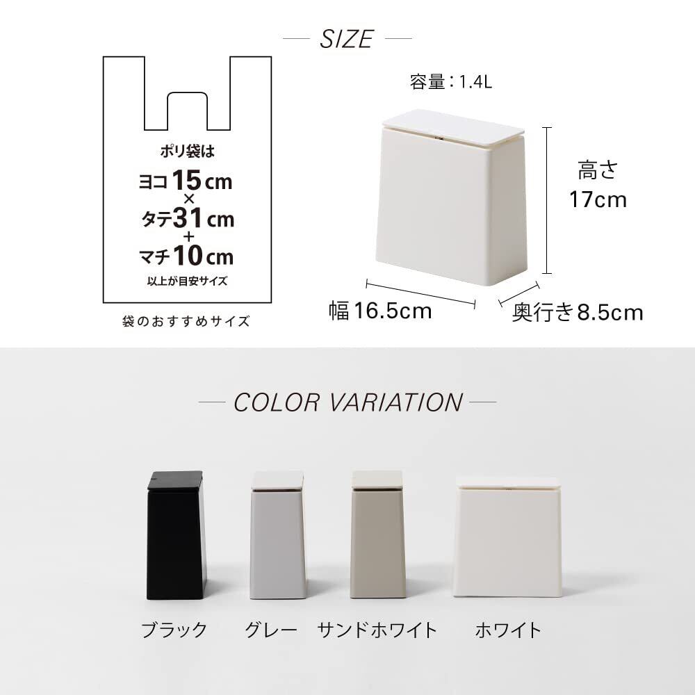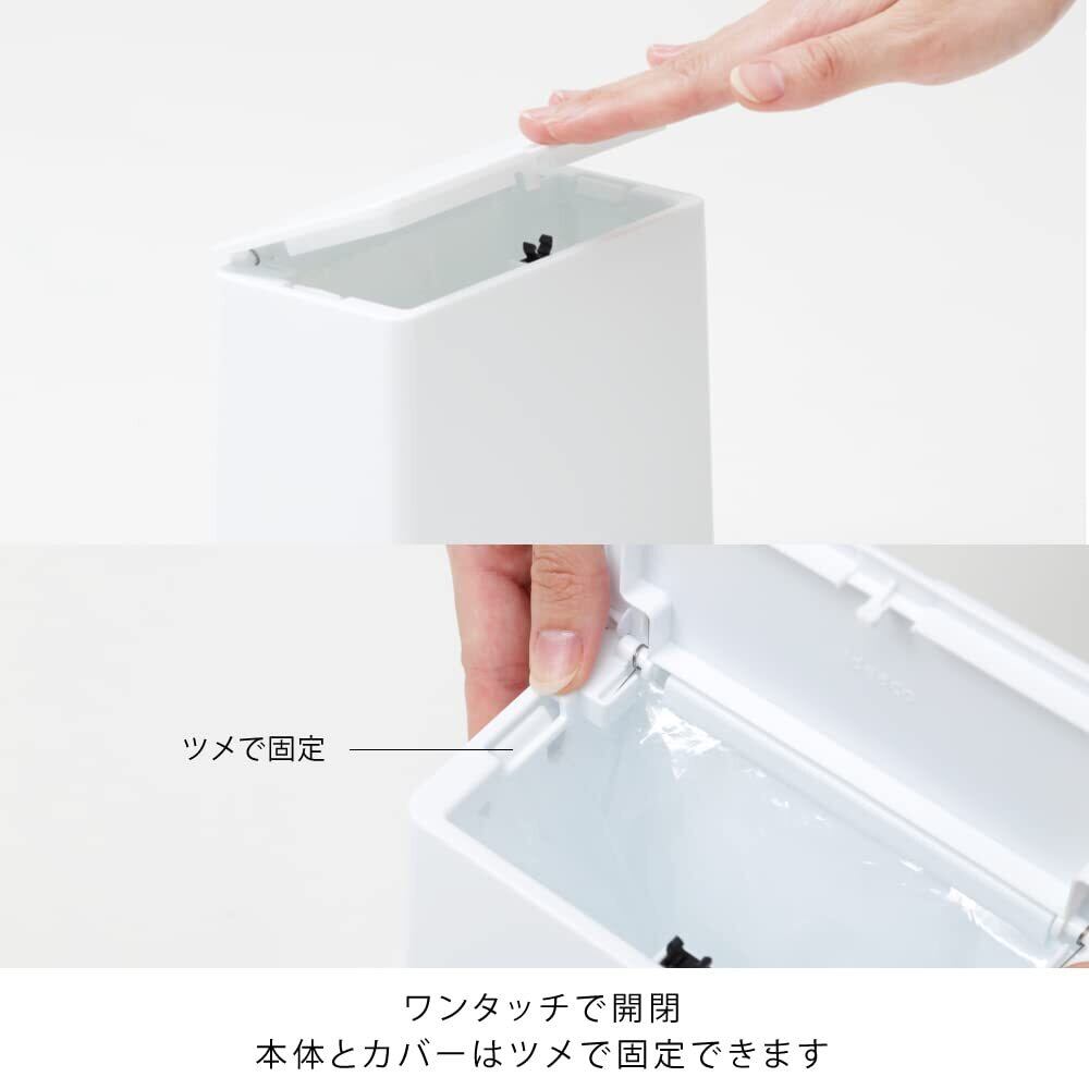 小さなフタ付きゴミ箱 目につきやすい台の上にぴったりなミニサイズのゴミ箱。 ごみ袋が見えないので清潔感があり、フタ付きなのでゴミを目隠しできます。 キッチンの生ゴミはもちろん、洗面所やドレッサー上でコットンやティッシュを捨てたり、 ランドリールームの窓枠スペースに置いて洗濯機の糸くずや浴室の排水溝のゴミを捨てたり… コンパクトなので場所を選ばず、好きな使い方ができます。 本体とカバーは2つの突起でカチッとセットできるので、パッと持ち上げて掃除がしやすい卓上にぴったりなゴミ箱です。 ゴミ袋は縦37×横30cm(マチ含む)以上のものが、使い勝手良くご利用いただけます。