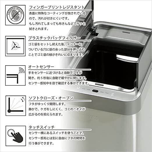 センサー感知によりフタが開き、自動で閉まります。 デジタルパネル両サイドのタッチボタンでも開閉可能。 ブルーLED表示でフタが閉まるまでのタイミングを確認できます。 フィンガーポイントプルーフで汚れが落ちやすく掃除も楽々行えます。 センサーオンオフスイッチで長時間使わない場合は消費電力を抑えることが出来ます。