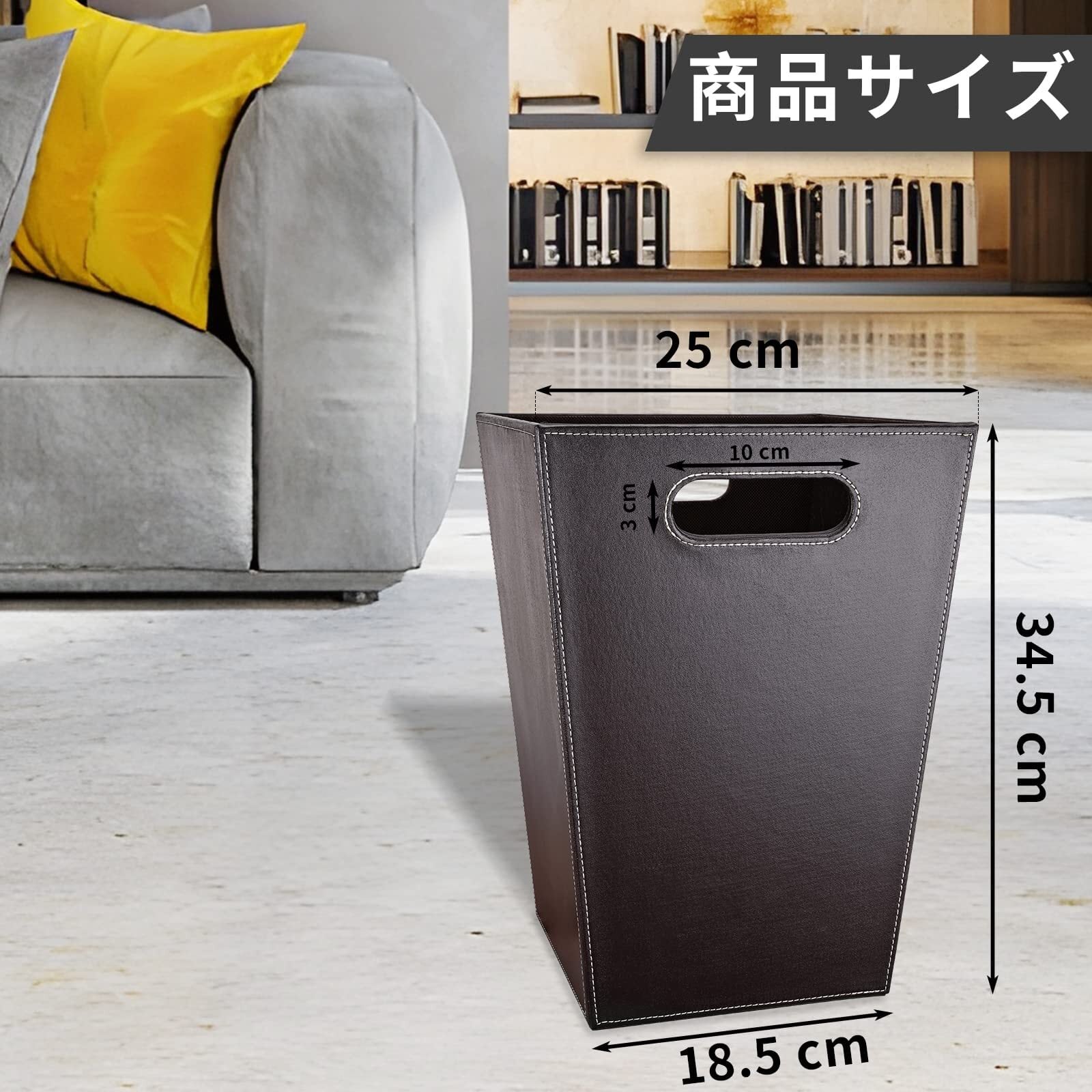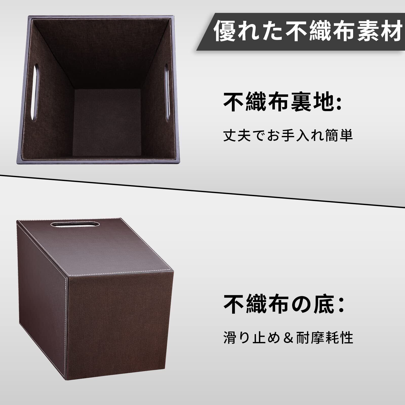 「高品質素材」外表面は優れたPUレザーで作られて、本体はMDF構造で丈夫で長持ちします。内表面は不織布裏地採用し、カビや汚れを防ぎます。PUレザーであれば、ちょっと汚れてもサッと拭き取れます。ゴミ箱の底は不織布で滑りにくく、ゴミ箱と地面の間の摩擦を減らし、騒音を減らします。バスケットは軽量なので、持ち運びがとても便利で、空にするのに便利です。