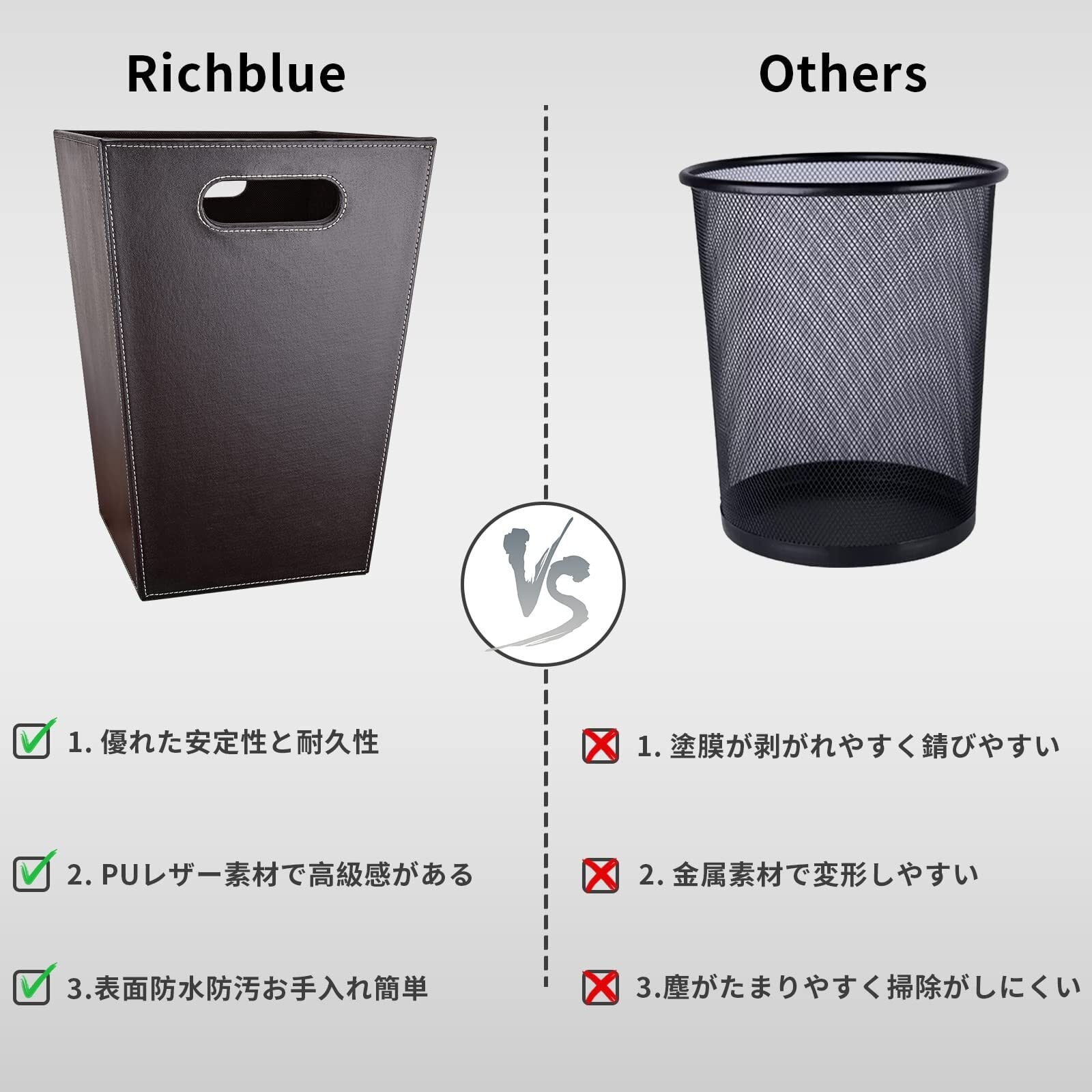 Richblue ゴミ箱 おしゃれ フタなしゴミ箱 くず入れ PUレザー製 ごみ箱 屑入れ 角型 ダストボックス ごみ箱 15L 大容量 ゴミ箱 おしゃれ リビングルーム 洗面所 トイレ 寝室 オフィス用