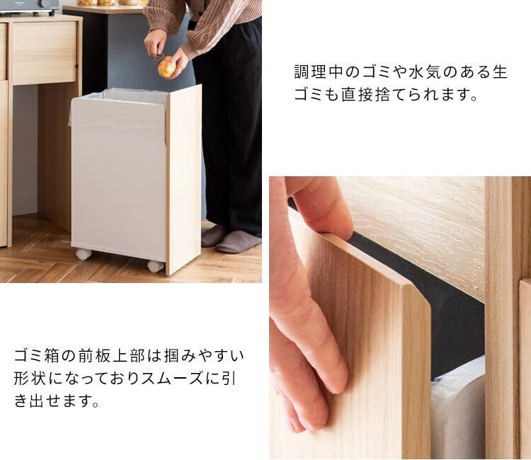 ゴミ箱は移動可能なキャスター付き。生ゴミなど直接捨てたいものは手元まで引き寄せてサッと捨てることができます。ゴミの移動で床などが汚れる心配もなく料理中も快適です。