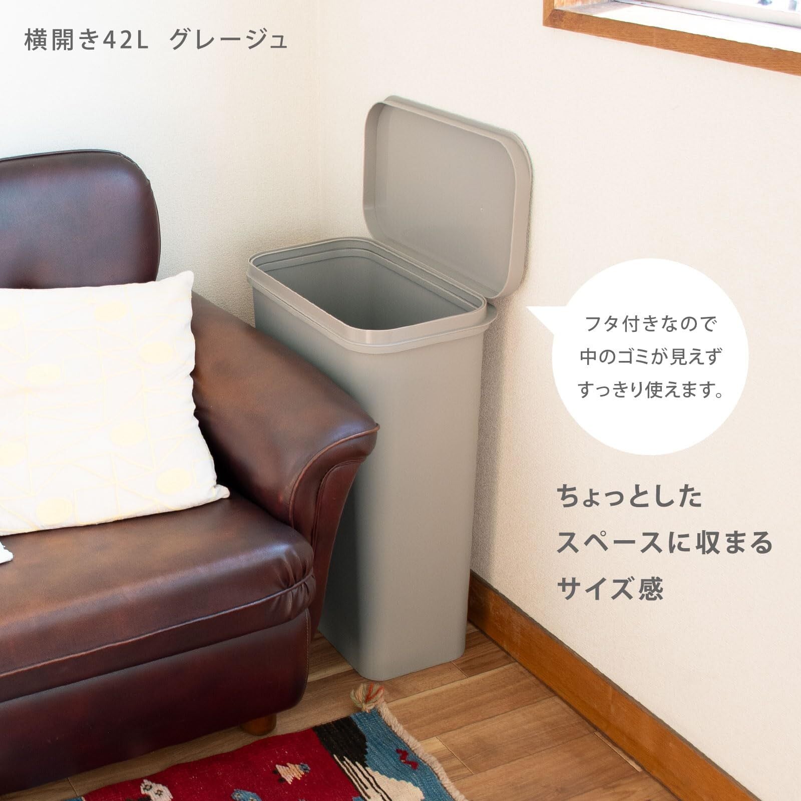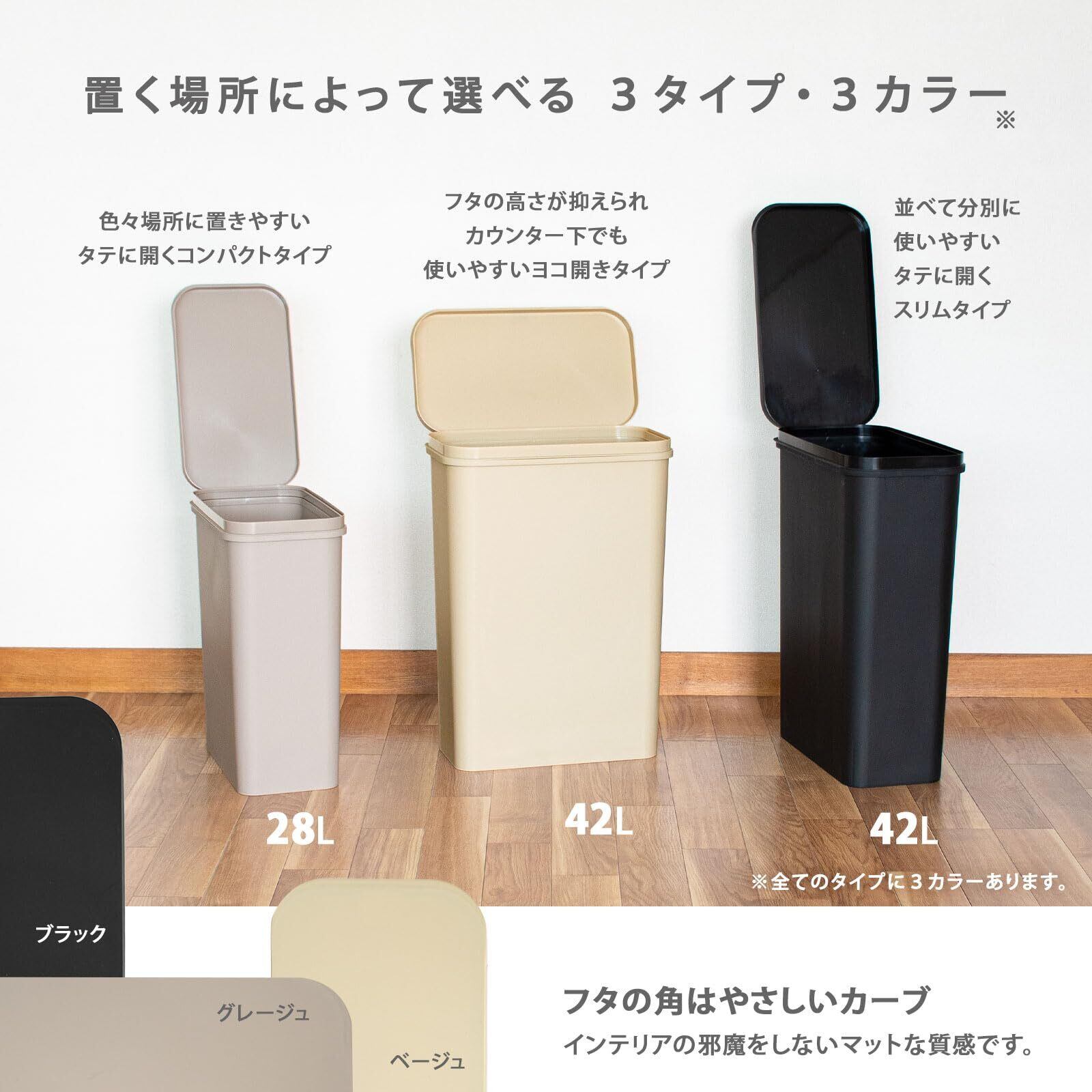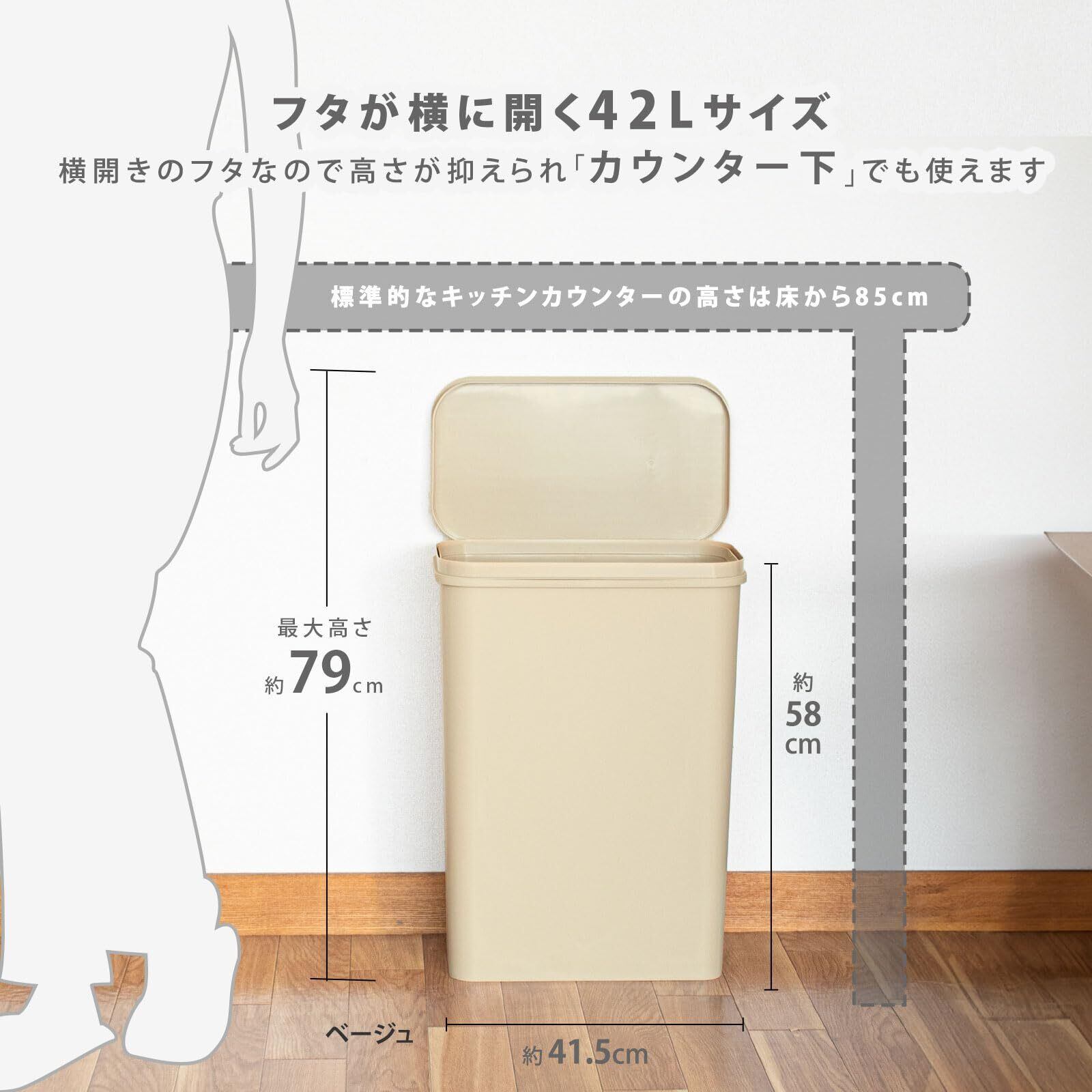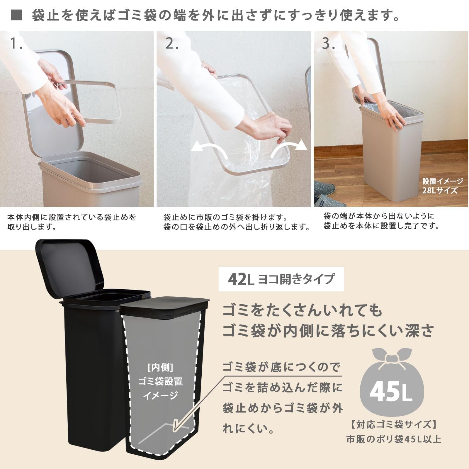 市販の45L以上のポリ袋がフィットする容量42Lの大容量タイプです。